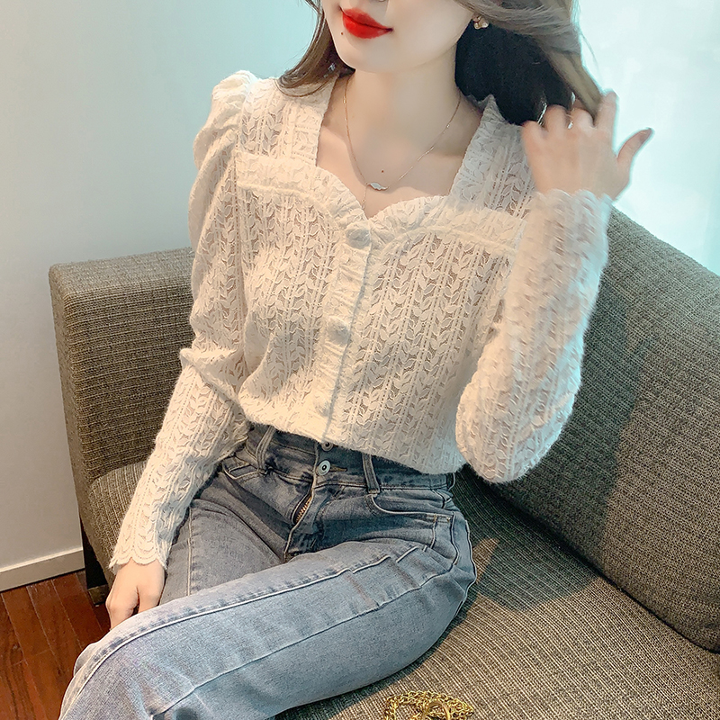 FA54390# 春季款韩版百搭方领长袖蕾丝衫打底衫女春季内搭 服裝批發女裝批發服飾貨源