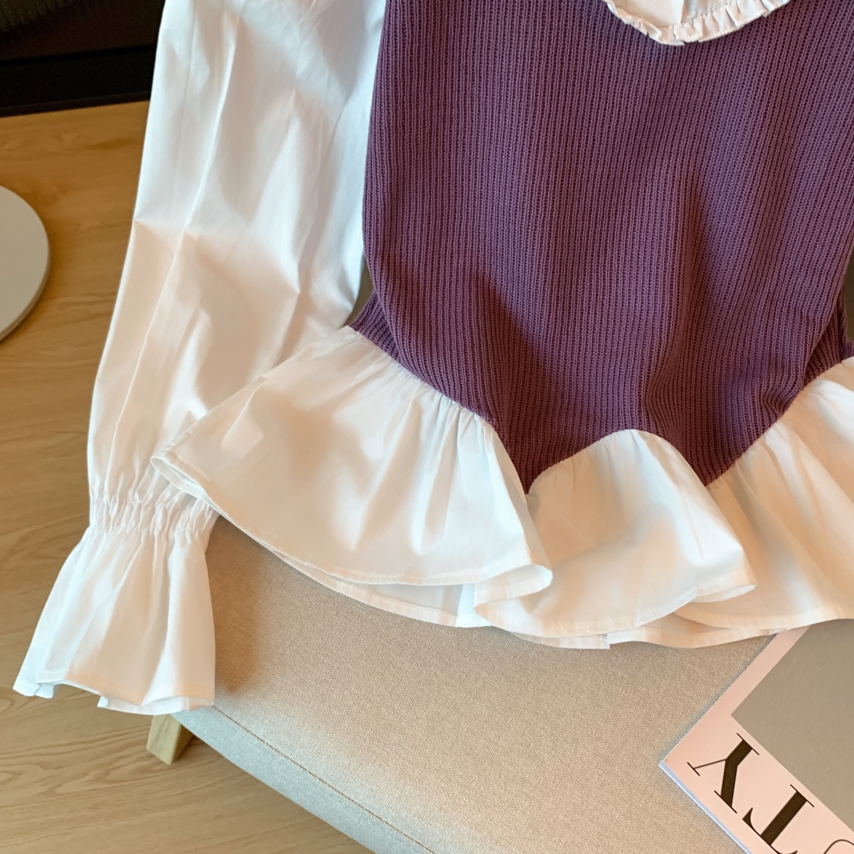 FA54403# 秋冬季减龄百搭不规则设计花边拼接紫色假两件上衣 服裝批發女裝批發服飾貨源