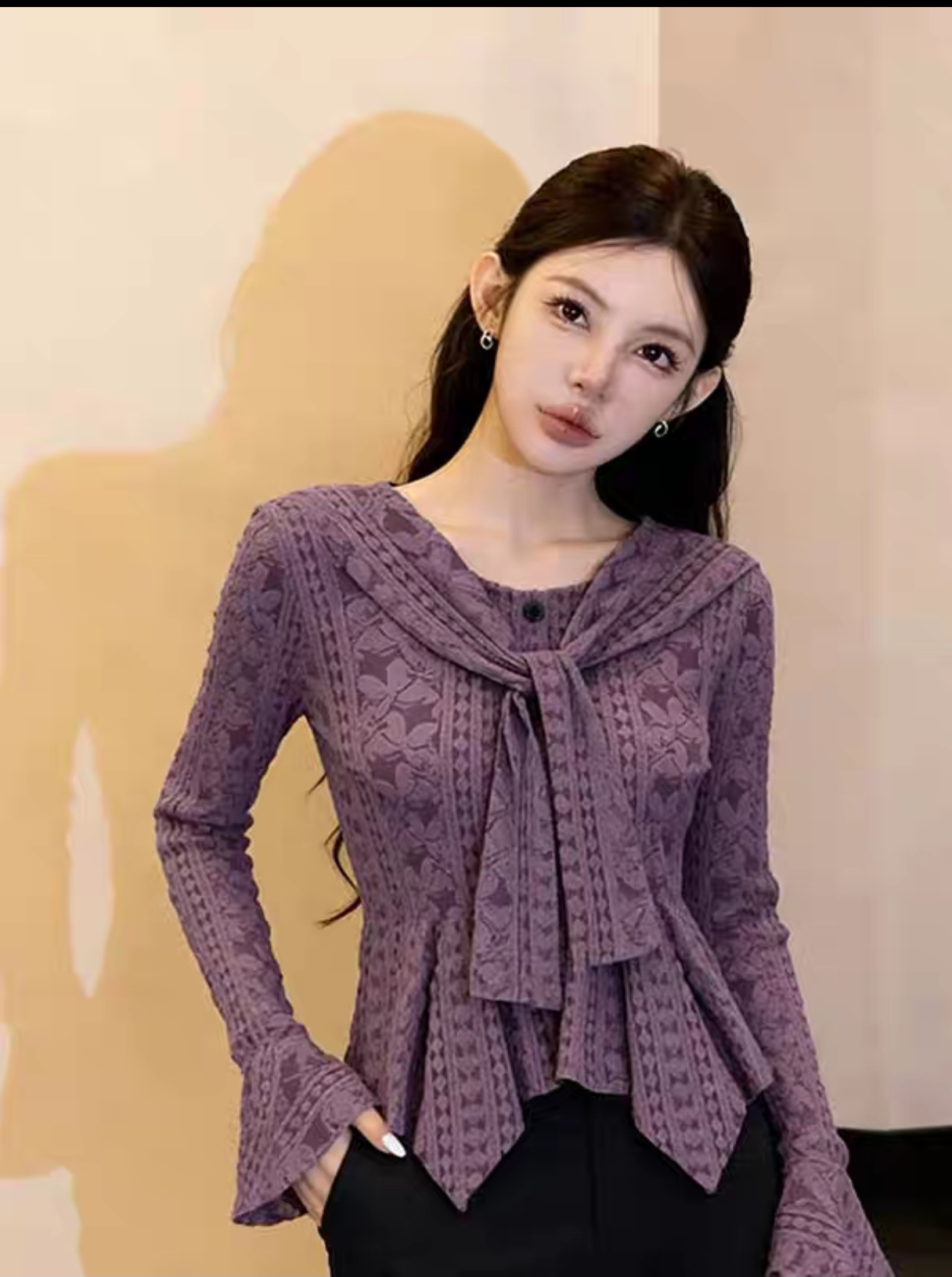 FA54421# 超好看法式紫色披肩蕾丝上衣女新款春季独特漂亮收腰内搭衬衣 服裝批發女裝批發服飾貨源