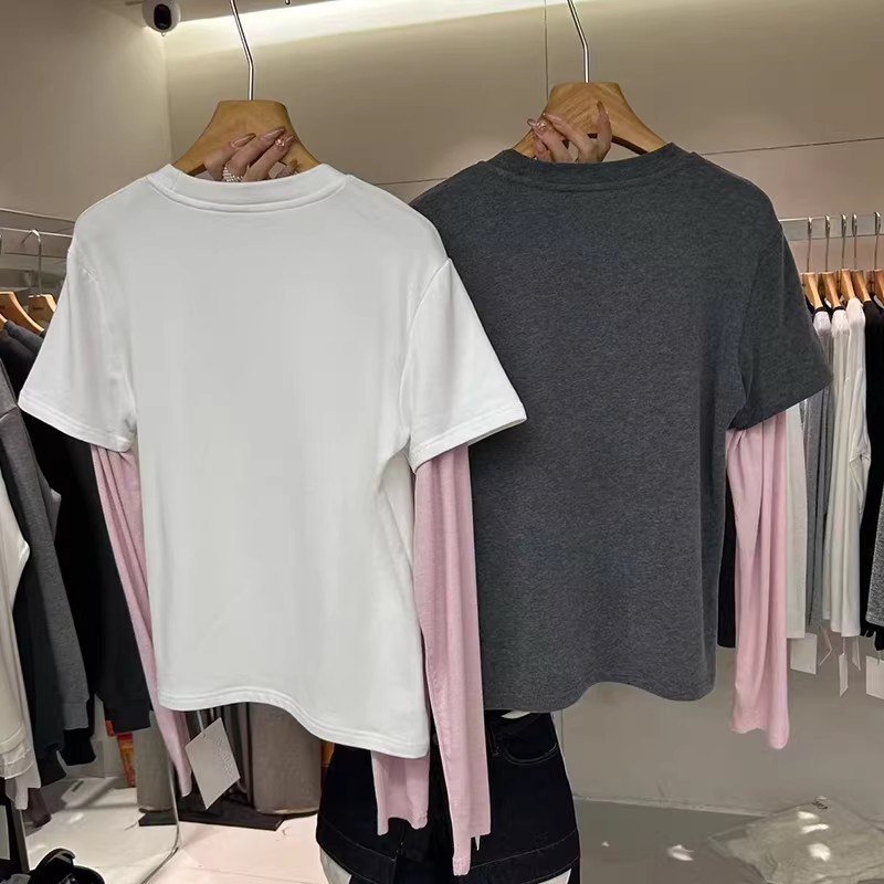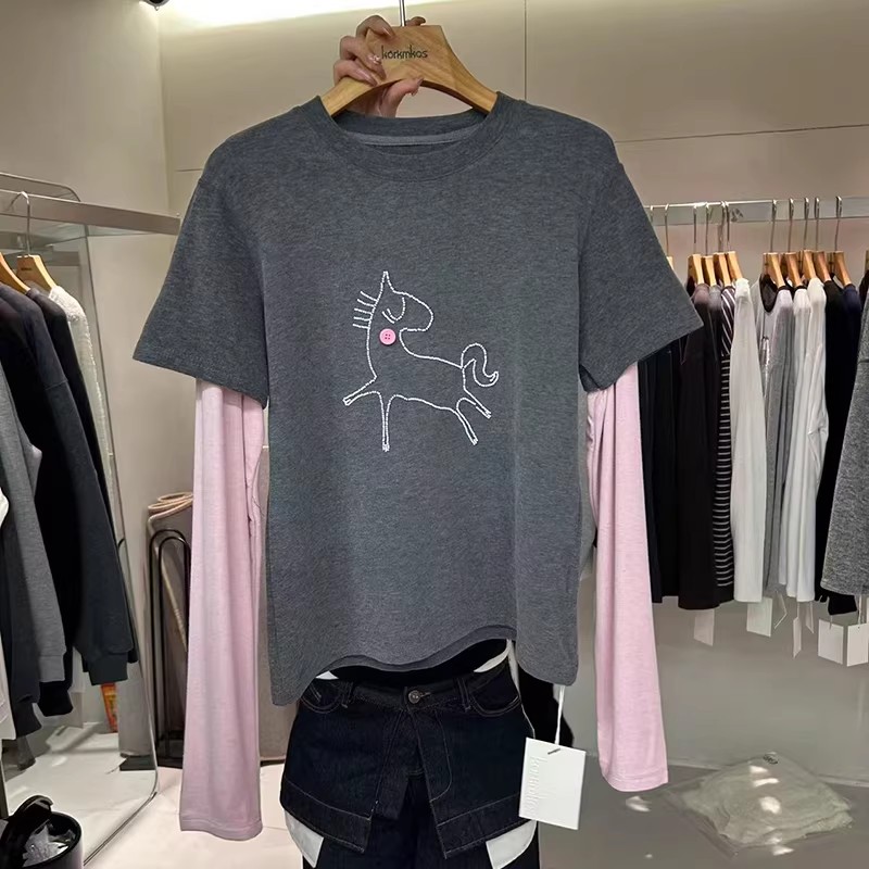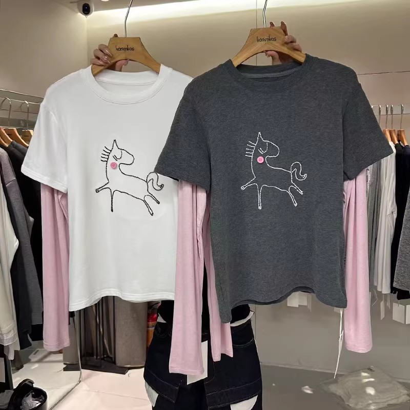FA54436# 东大门春季钉扣子小马刺绣拼接长袖假两件T恤女欧货精致上衣 服裝批發女裝批發服飾貨源