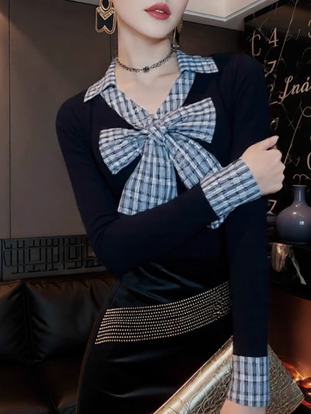 FA54449# 春秋格子蝴蝶结翻领修身显瘦打底衫女内搭设计感长袖上衣 服裝批發女裝批發服飾貨源