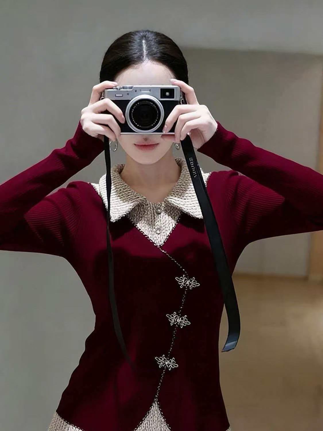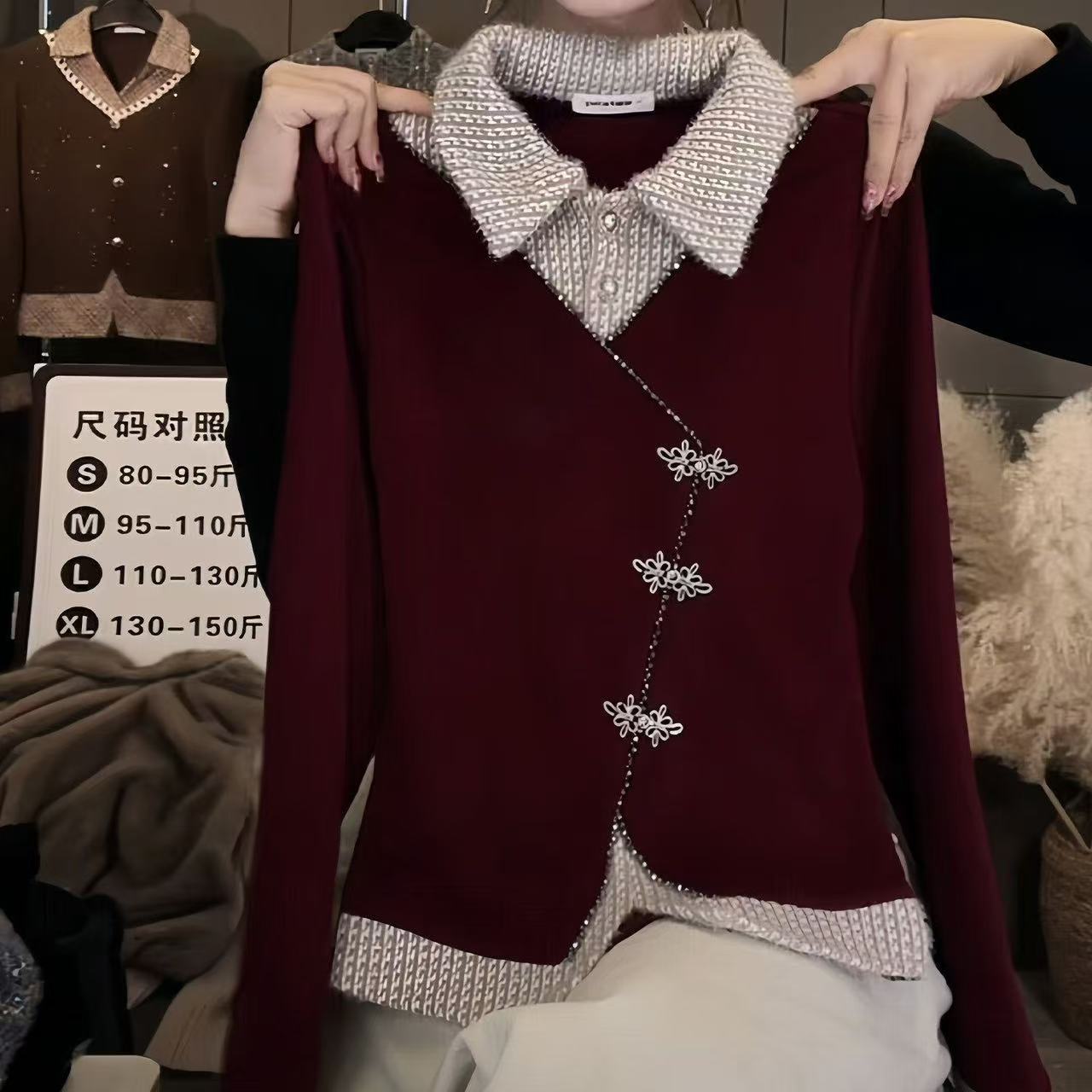 FA54455# 轻奢风假两件拼接红色T桖衫女春季新款长袖翻领显瘦新年上衣 服裝批發女裝批發服飾貨源