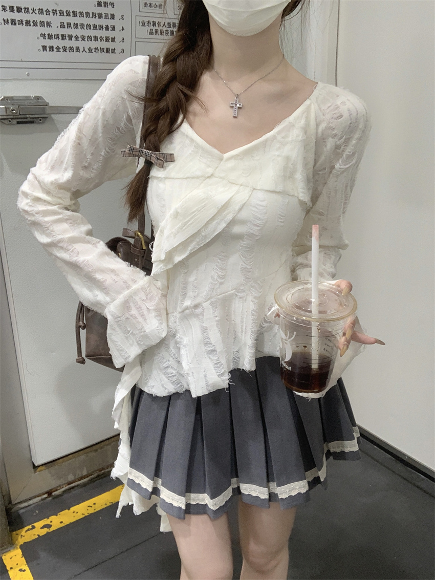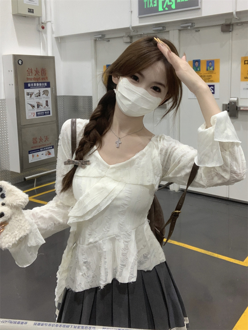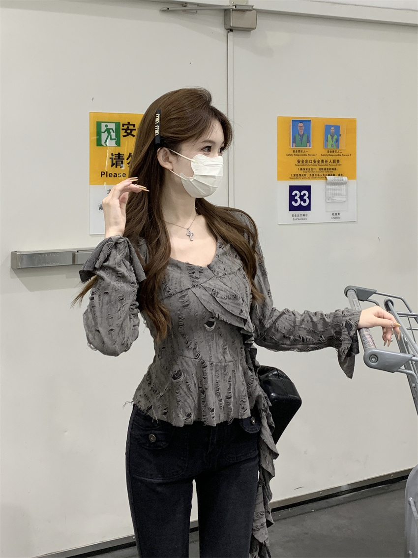 FA54457# 荷叶边破洞T恤女秋季美式复古小众设计感独特长袖上衣 服裝批發女裝批發服飾貨源