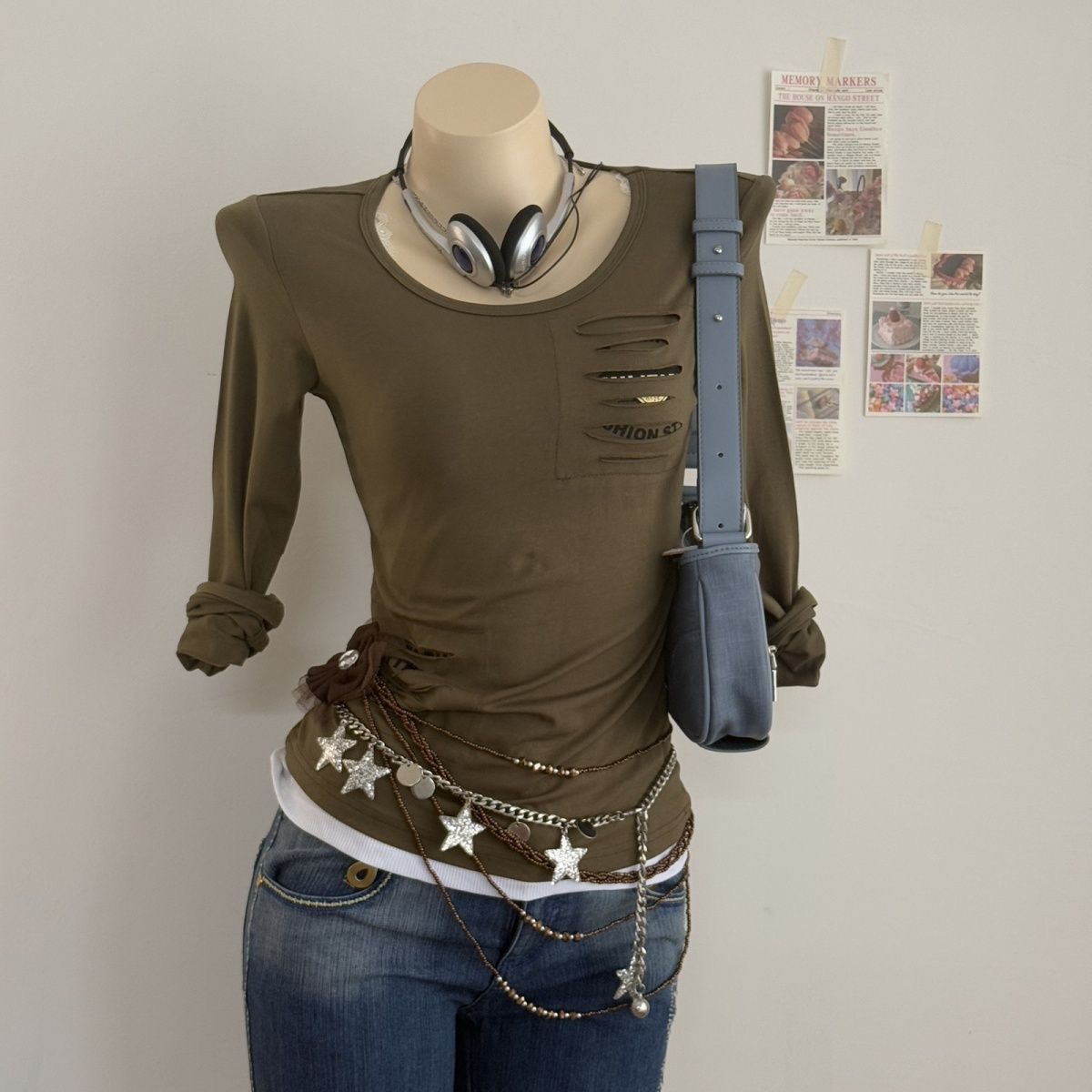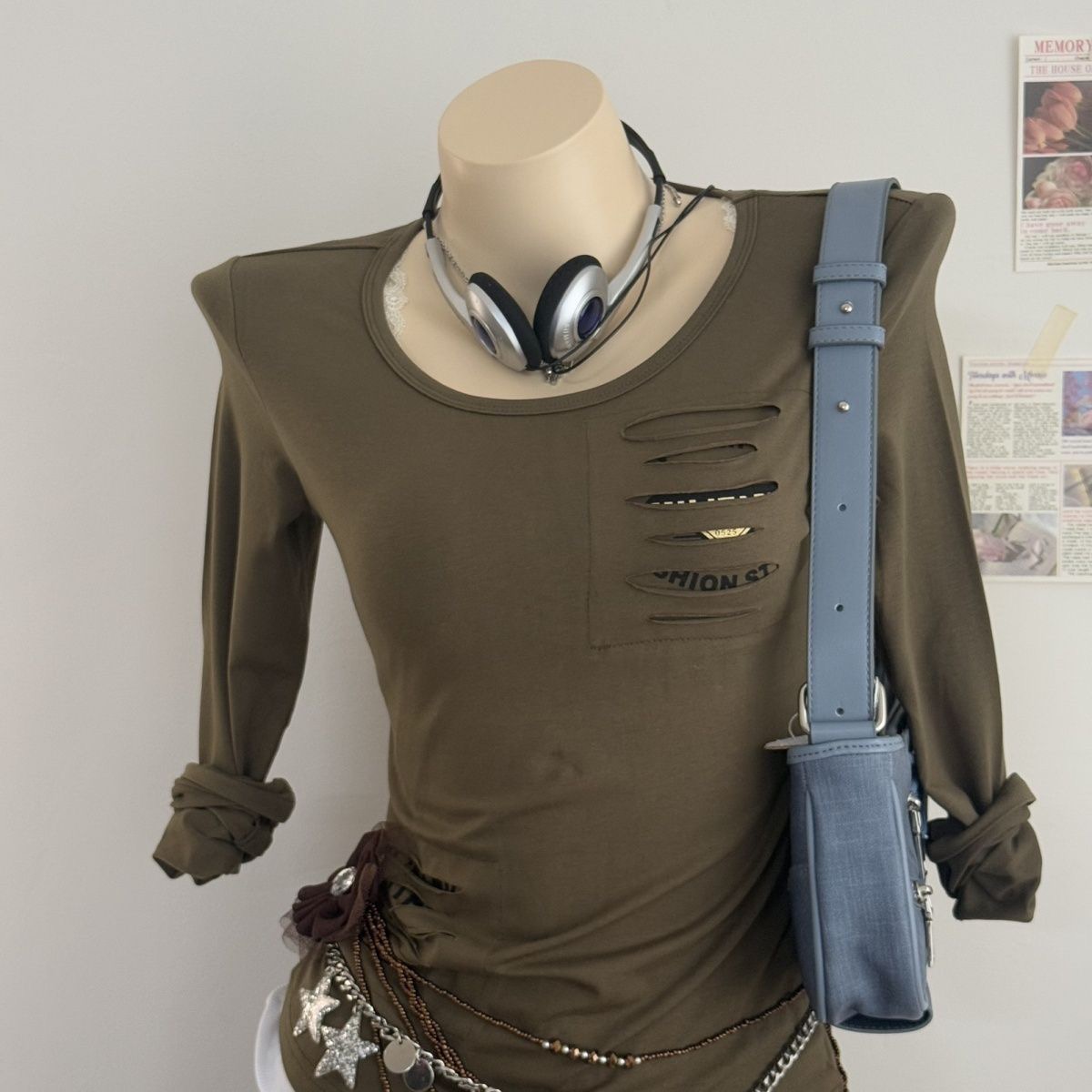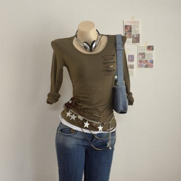 FA54459# 秋季爆款军旅风薄款军绿色个性破洞英文长袖休闲T恤上衣 服裝批發女裝批發服飾貨源