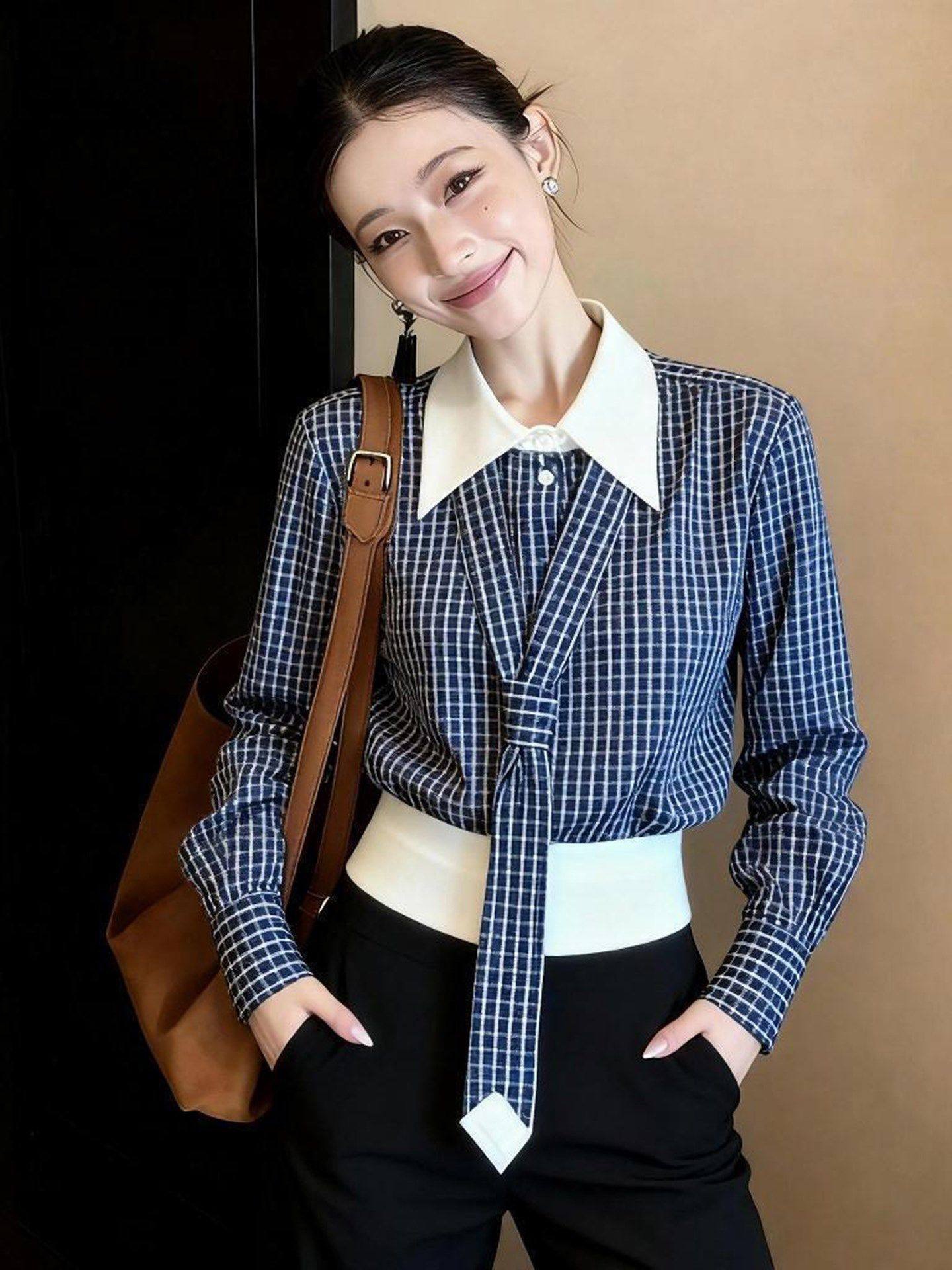 FA54460# 春季新款可拆卸领带设计撞色翻领拼接气质格纹收腰长袖衬衫女 服裝批發女裝批發服飾貨源
