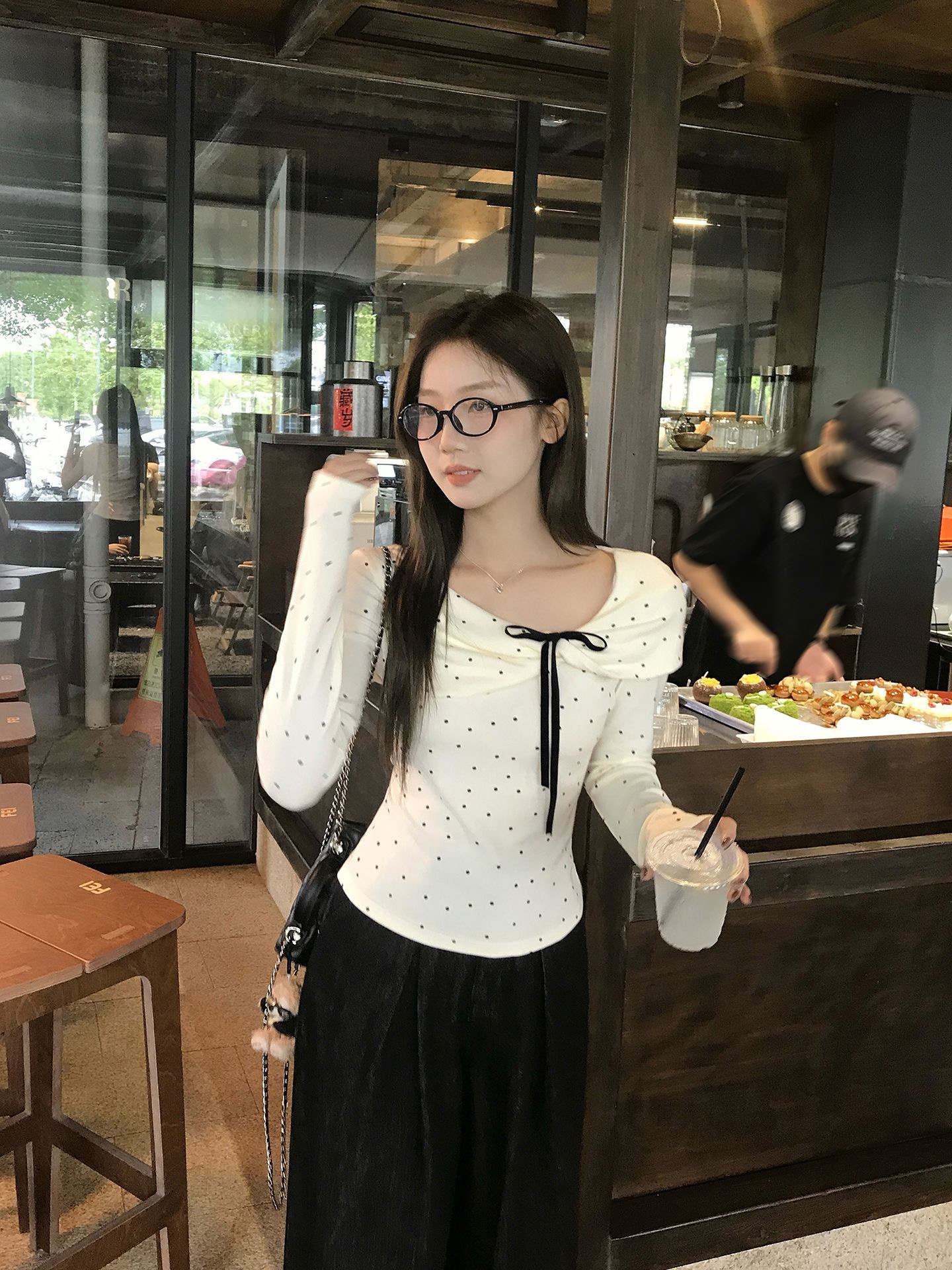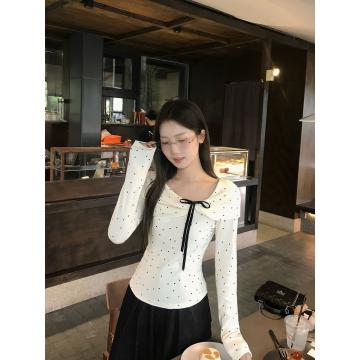 FA54470# 杏色长袖新款蝴蝶结波点修身显瘦德绒保暖打底衫短款上衣 服裝批發女裝批發服飾貨源