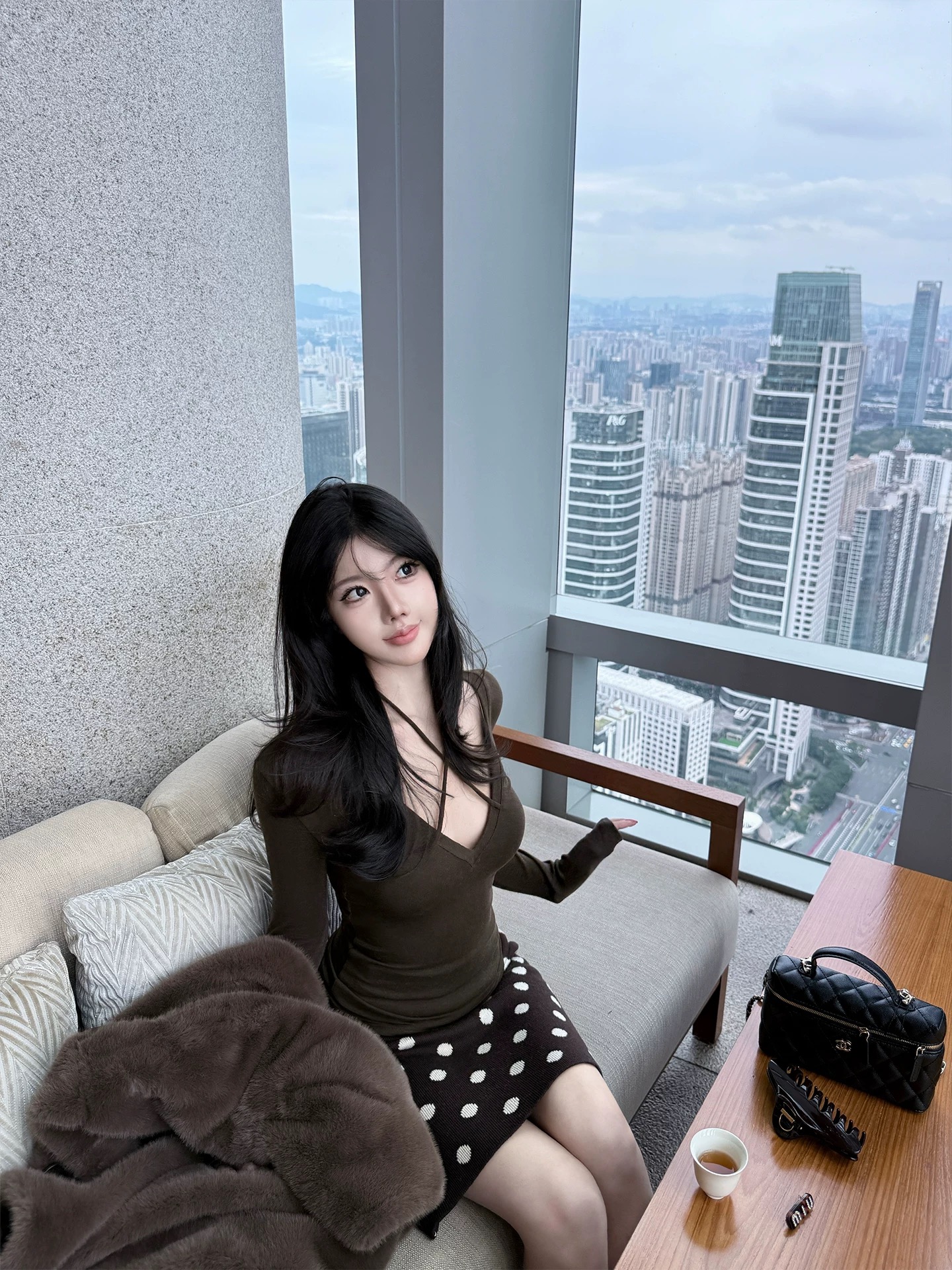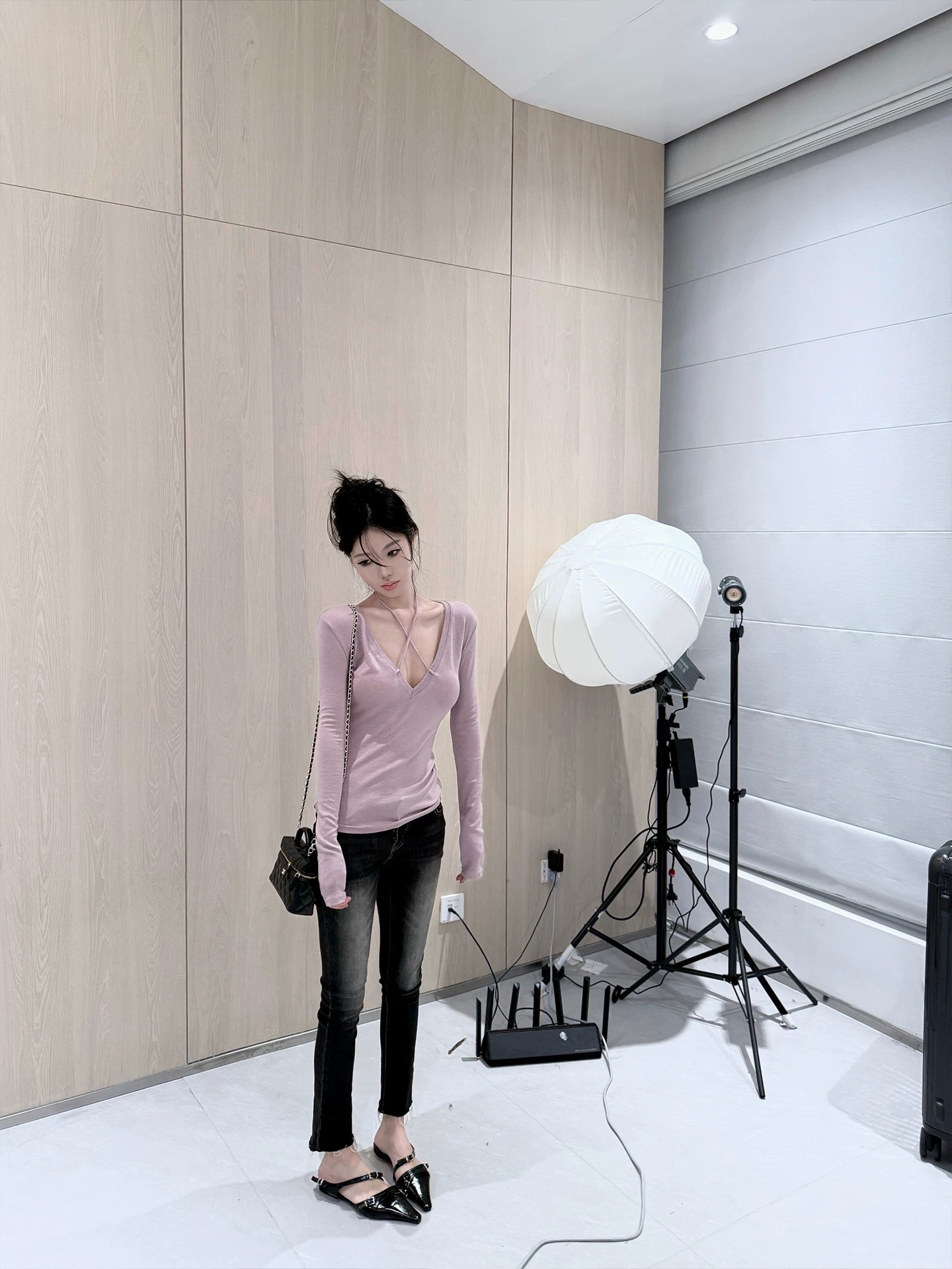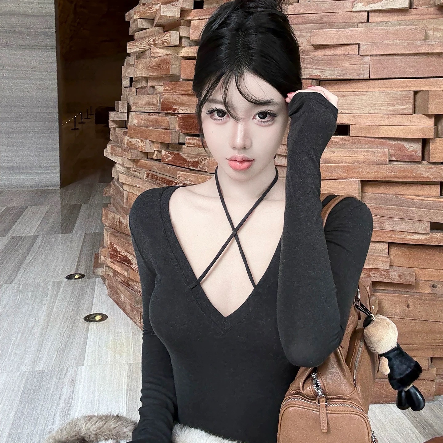 FA54478# 天丝羊毛深V挂脖打底衫女秋冬季设计感长袖T恤上衣 服裝批發女裝批發服飾貨源