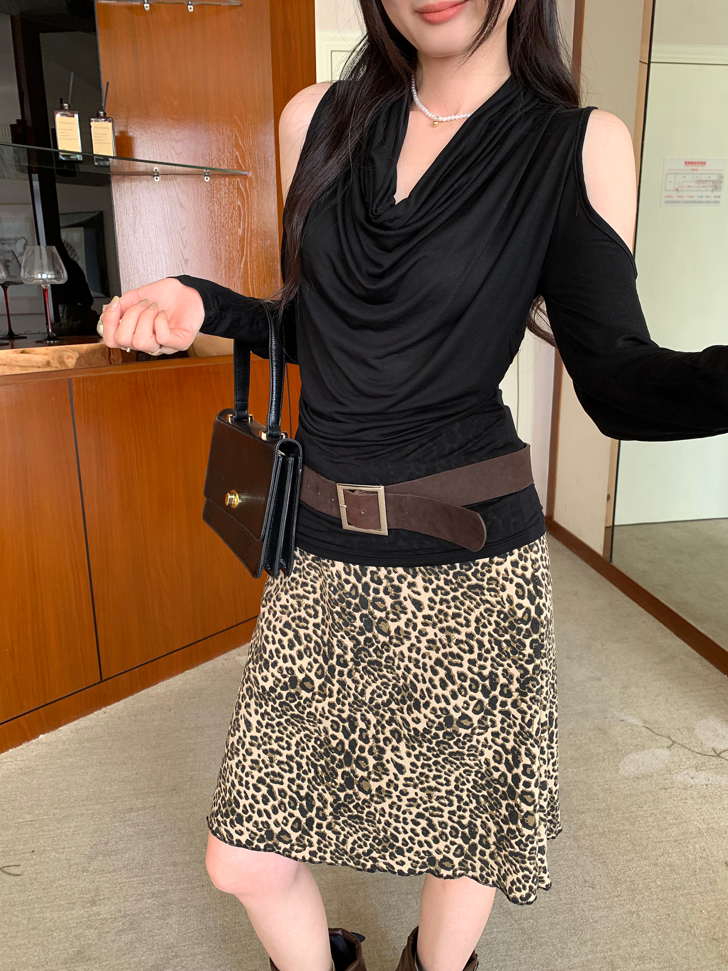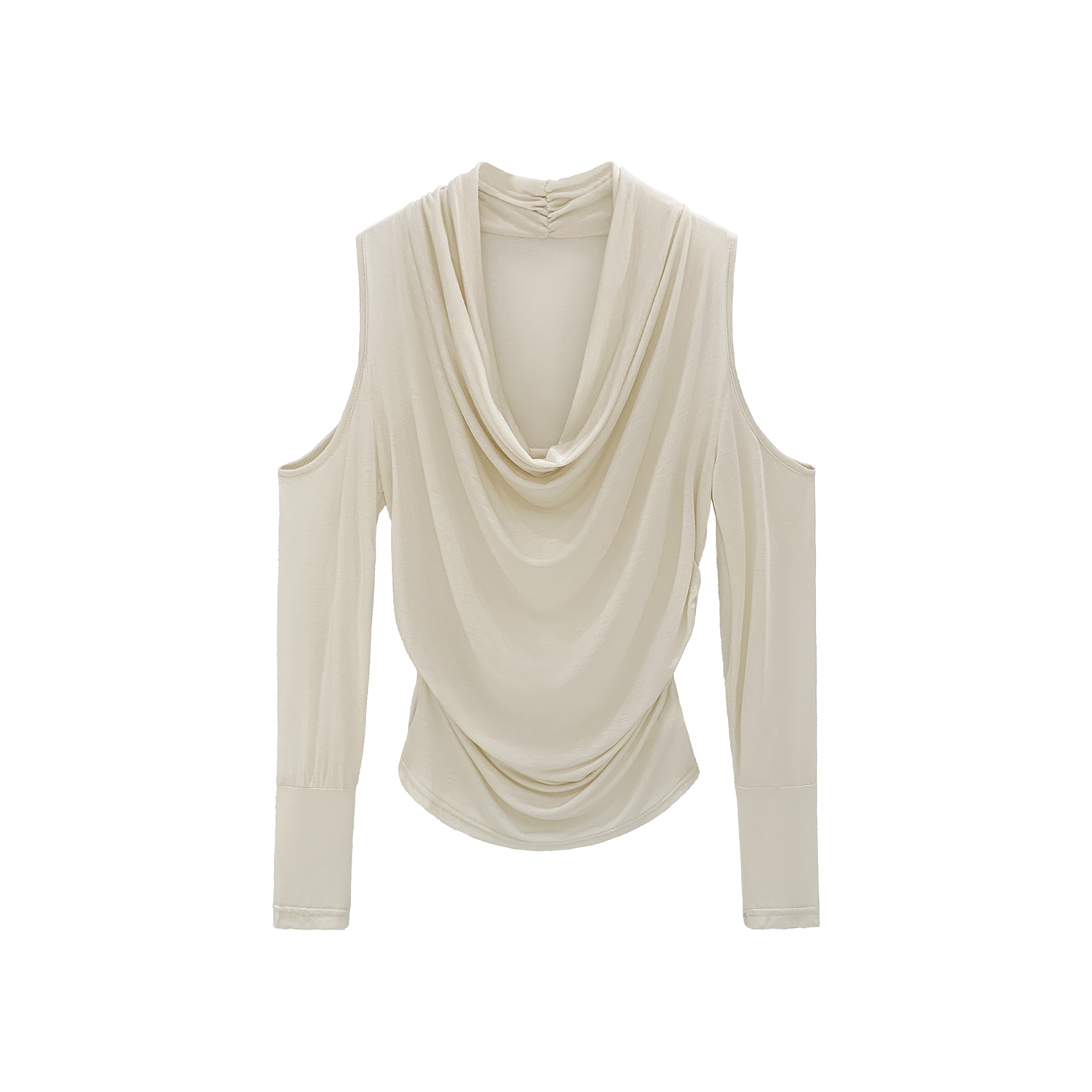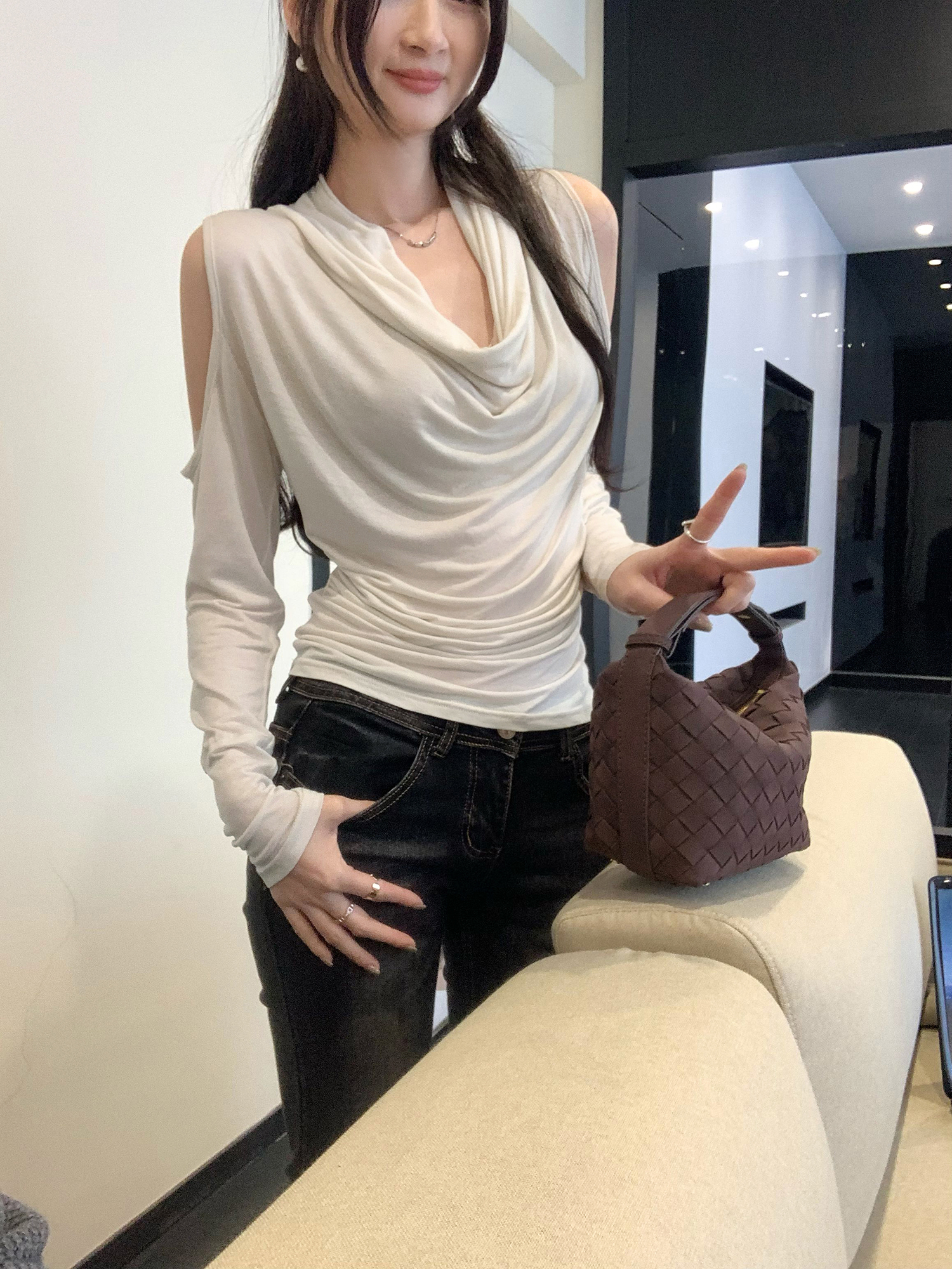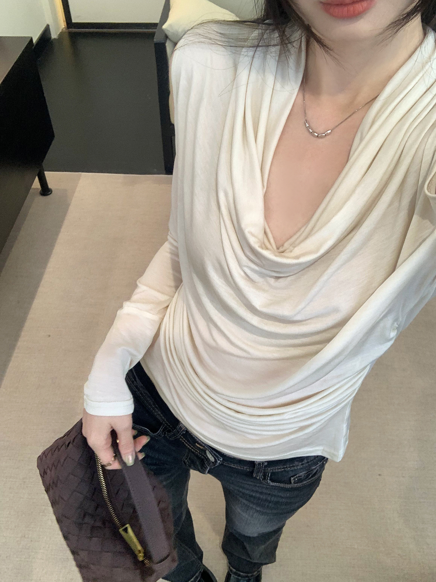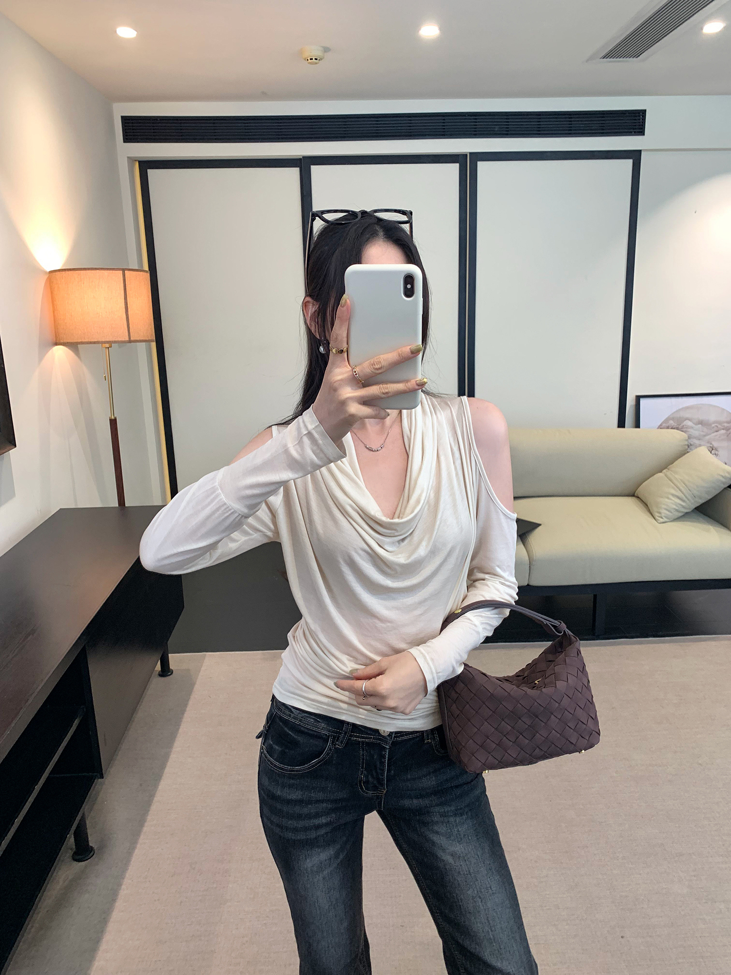 FA54548# 图莱赛尔天丝褶皱荡领长袖T恤女春季新款露肩百搭小上衣 服裝批發女裝批發服飾貨源