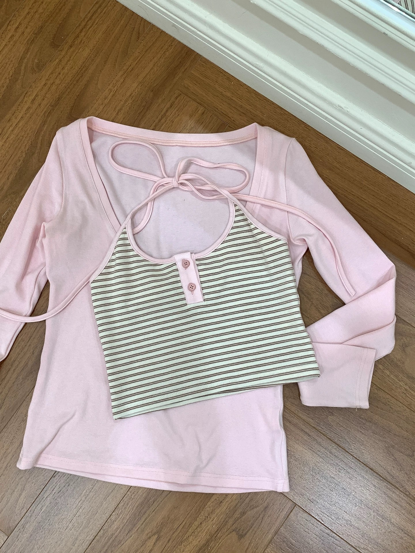 FA54610# 宋正恩粉拼条纹甜美长袖t恤女春季修身显瘦独特内搭打底衫两件套 服裝批發女裝批發服飾貨源