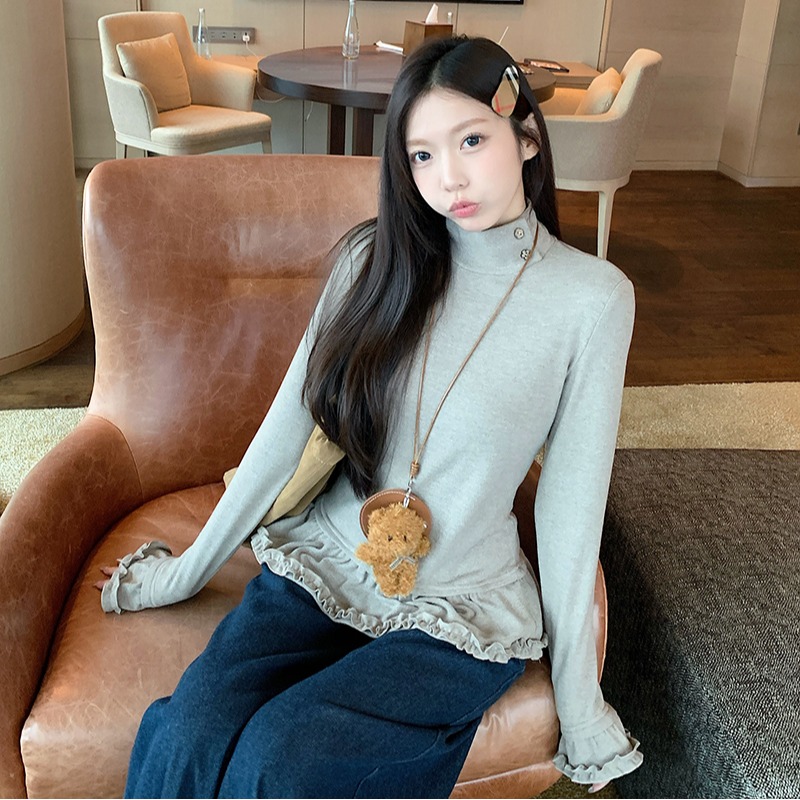 FA54666# 阳离子德绒春秋长袖t恤打底衫女装木耳花边高领上衣 服裝批發女裝批發服飾貨源