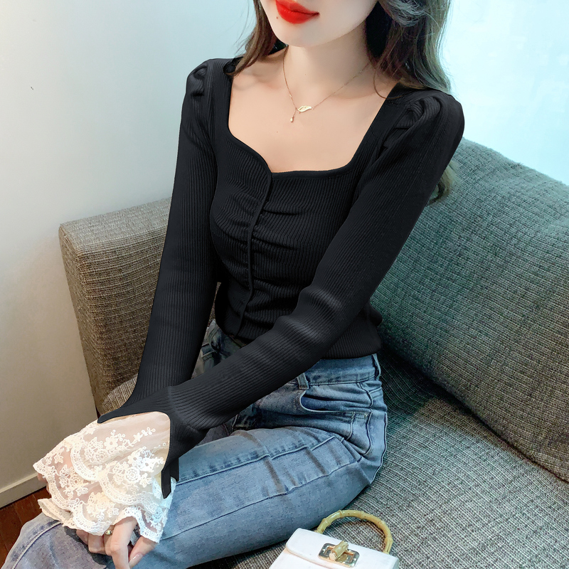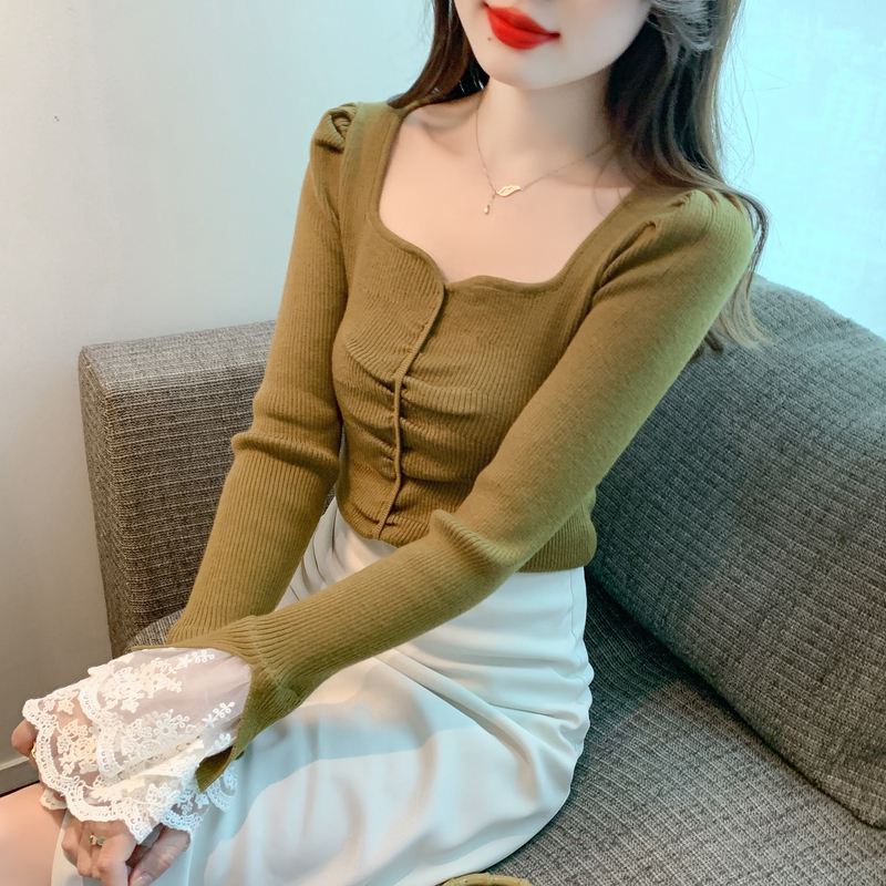 FA54711# 新款针织衫女修身打底毛衣秋冬季拼接蕾丝袖上衣女 服裝批發女裝批發服飾貨源