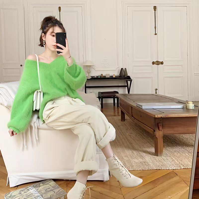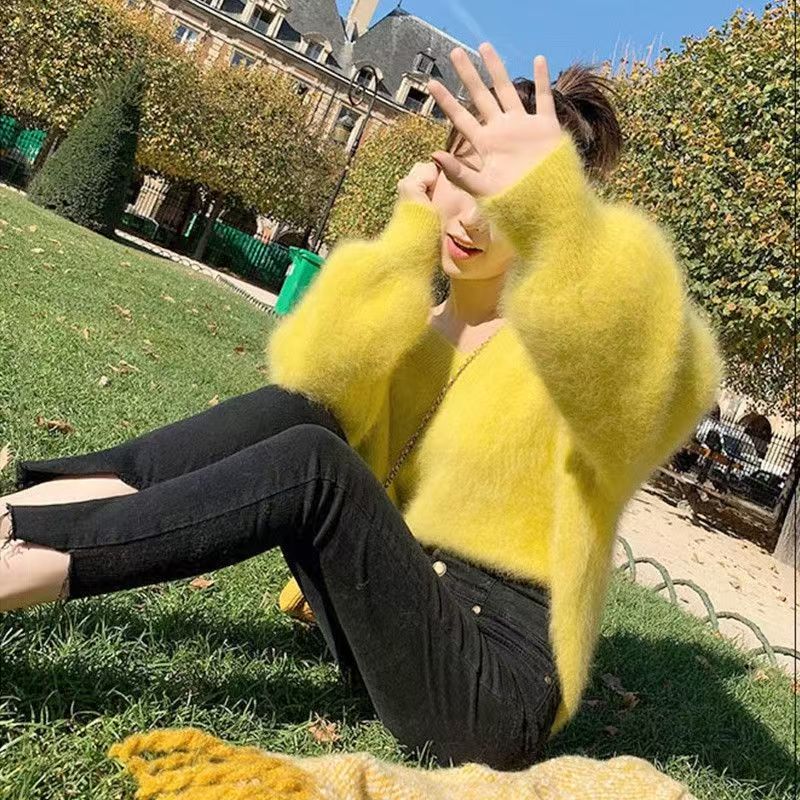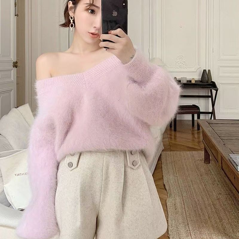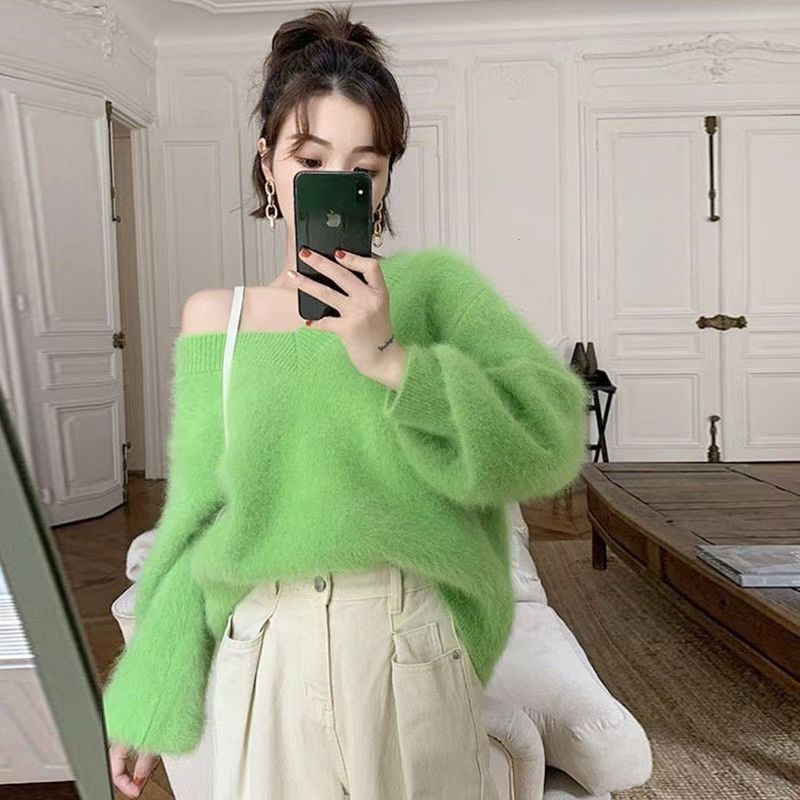 YF6940# (4色入内)慵懒风露肩泡泡袖抹胸海马毛宽松大码显瘦原宿风加厚针织上衣