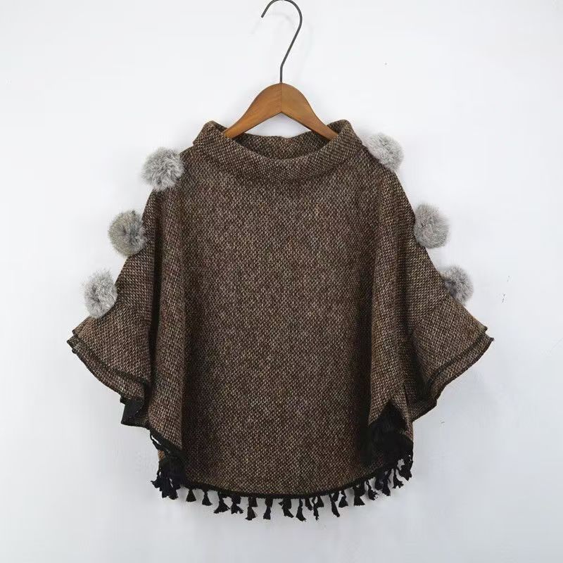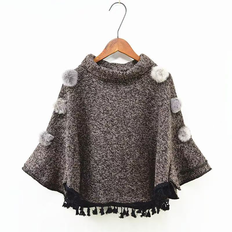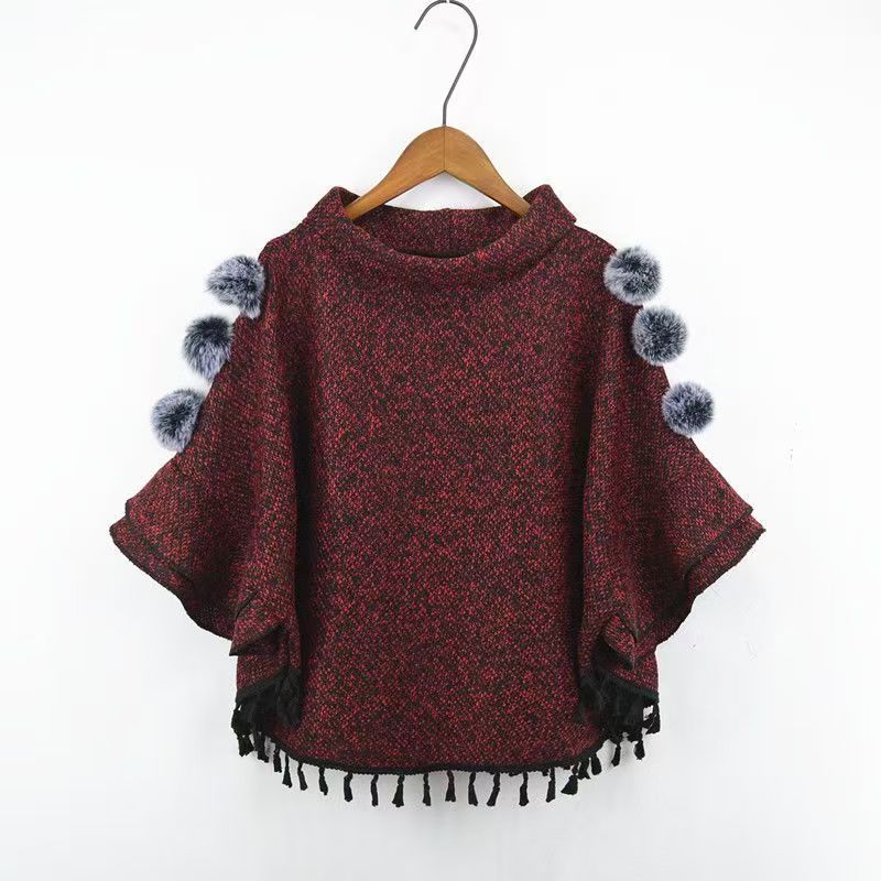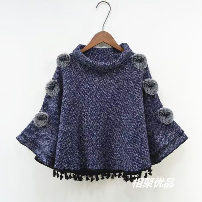 首页 > 毛衣、针织衫 > YF6995(4色入内)秋冬蝙蝠袖圆领毛毛球流苏设计感宽松显瘦休闲百搭斗篷披肩