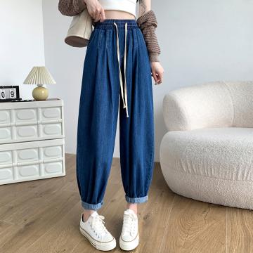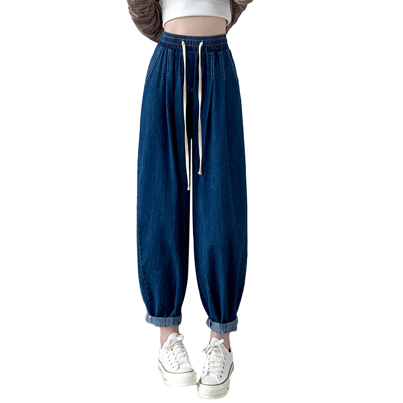 FA56380# 纯棉深蓝色牛仔老爹裤女欧货高腰宽松显瘦萝卜裤大码哈伦裤潮 服裝批發女裝批發服飾貨源