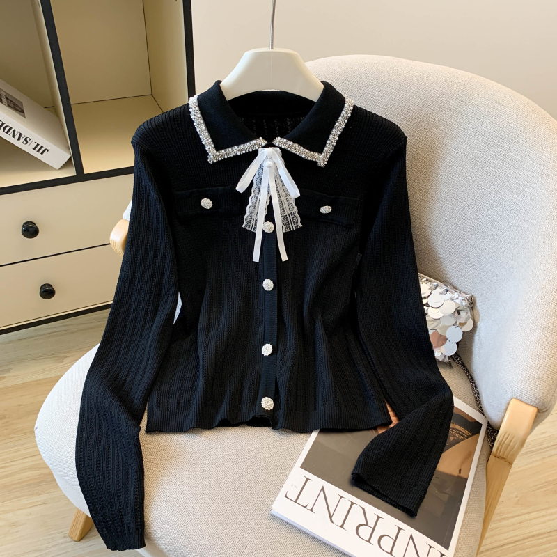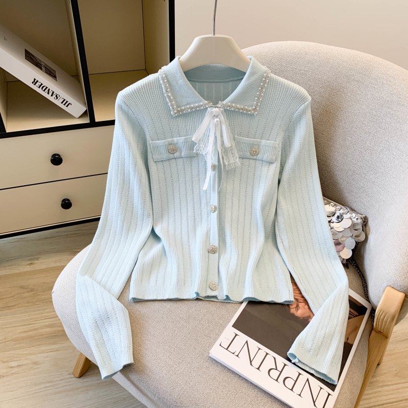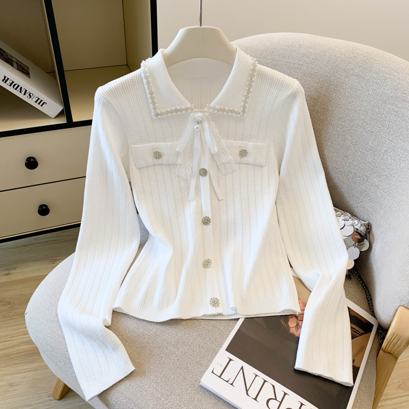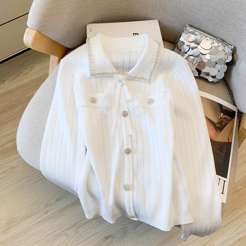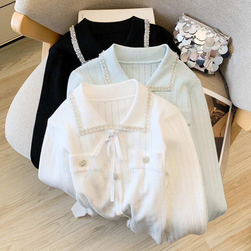 首页 > 毛衣、针织衫 > FA56385# 春款小香风法式长袖翻领针织衫女重工钉珠蝴蝶结洋气上衣开衫 服裝批發女裝批發服飾貨源
