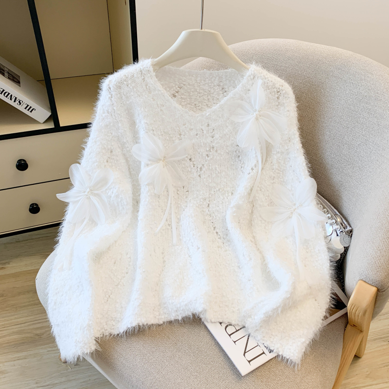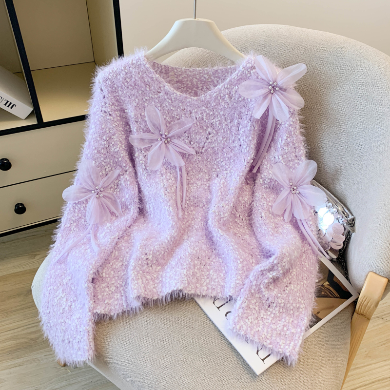 首页 > 毛衣、针织衫 > FA56387# 春款仿水貂绒软糯V领套头针织毛衣女法式设计感钉珠花朵上衣 服裝批發女裝批發服飾貨源