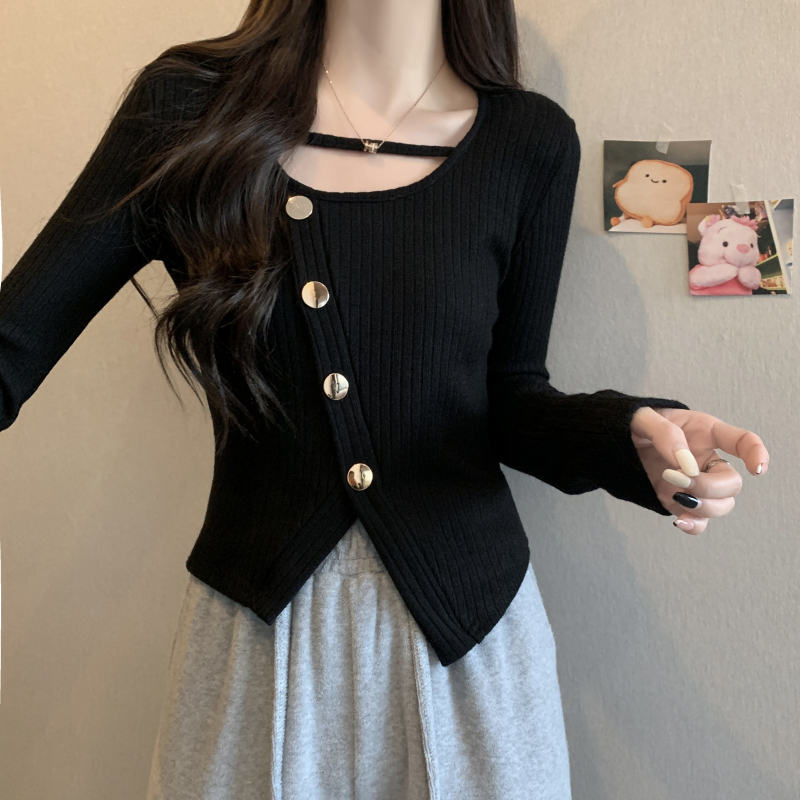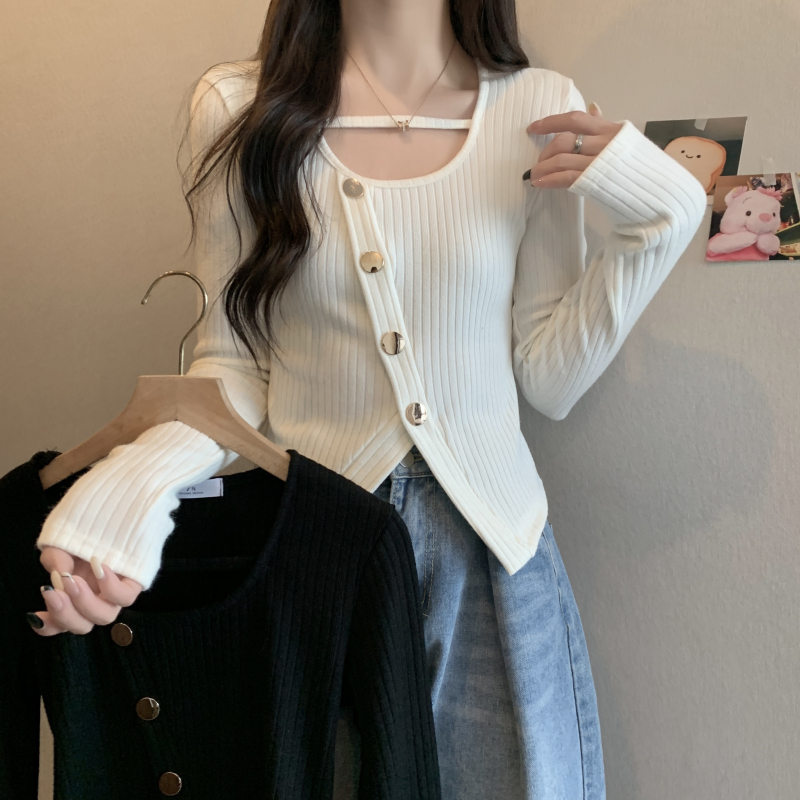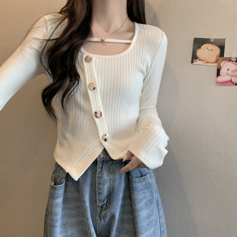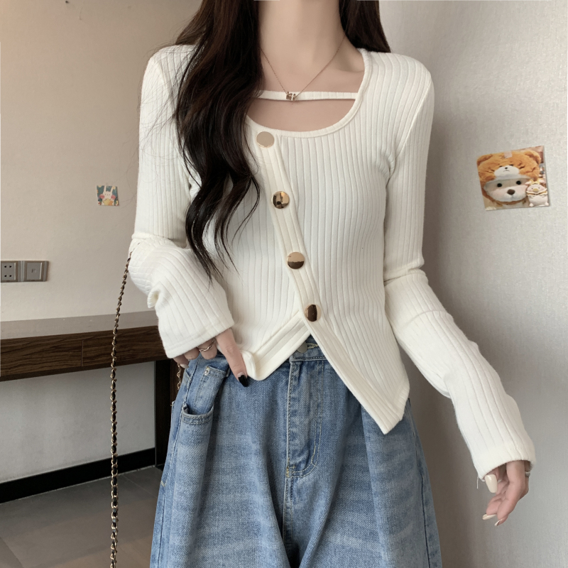 FA56402# 春季纯欲风时尚百搭开叉设计感小众短款长袖T恤女上衣休闲 服裝批發女裝批發服飾貨源