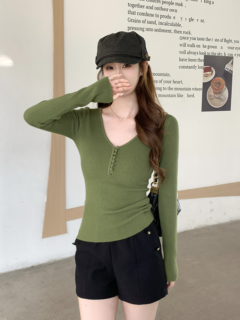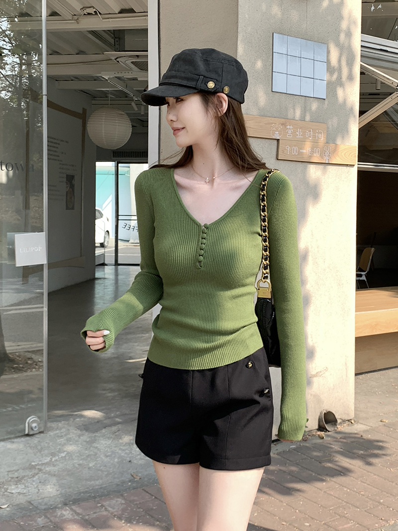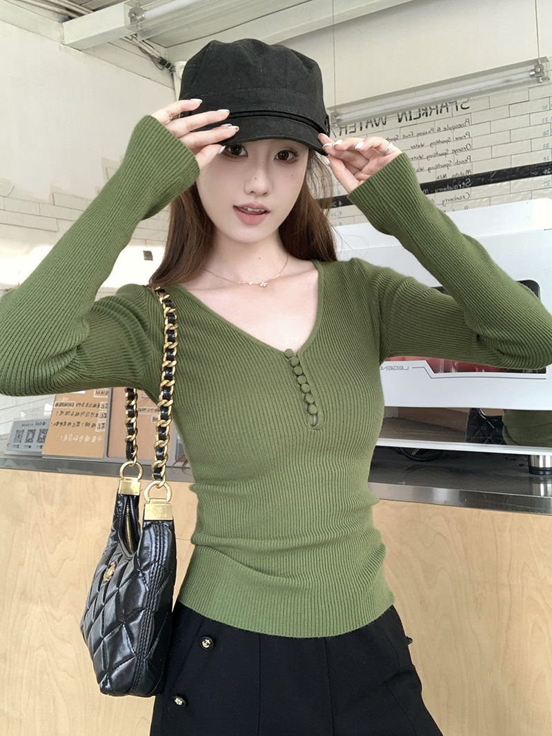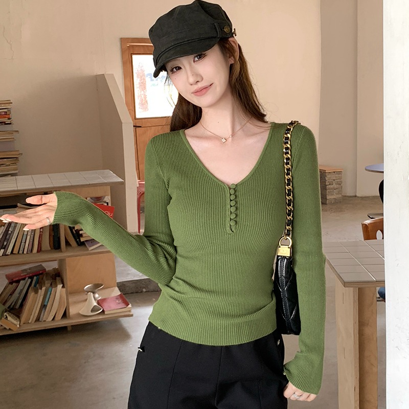 FA56518# 韩系绿色排扣v领长袖针织打底衫女秋冬季修身显瘦内搭 服裝批發女裝批發服飾貨源