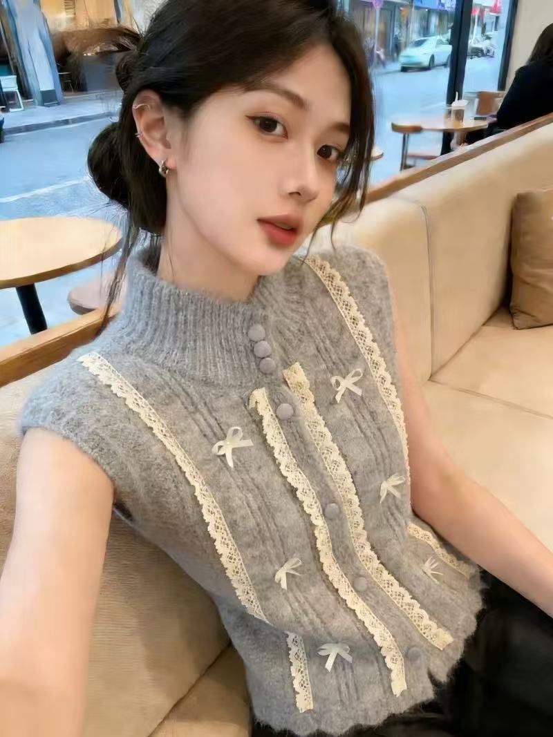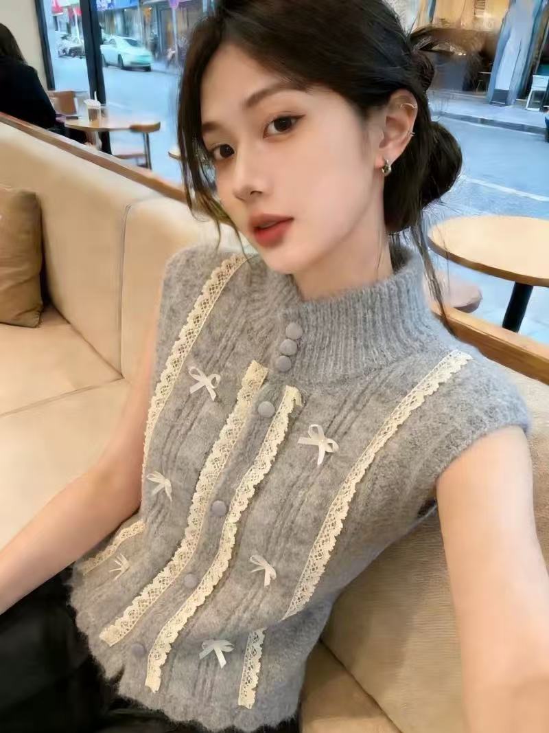 轻奢高端货韩系蝴蝶结蕾丝拼接针织马甲女春季洋气上衣 服裝批發女裝批發服飾貨源