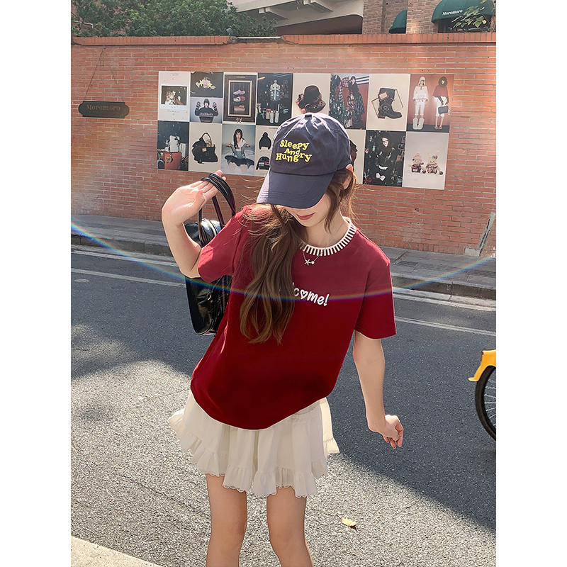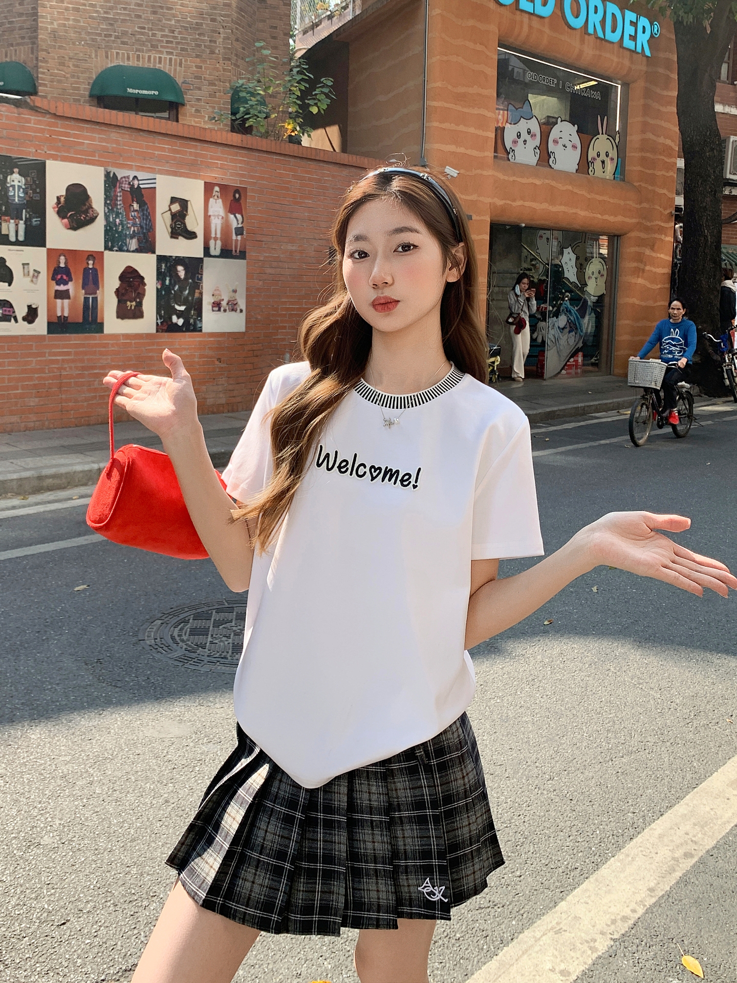 设计感撞色圆领字母刺绣短袖t恤女新款宽松显瘦休闲百搭上衣 服裝批發女裝批發服飾貨源