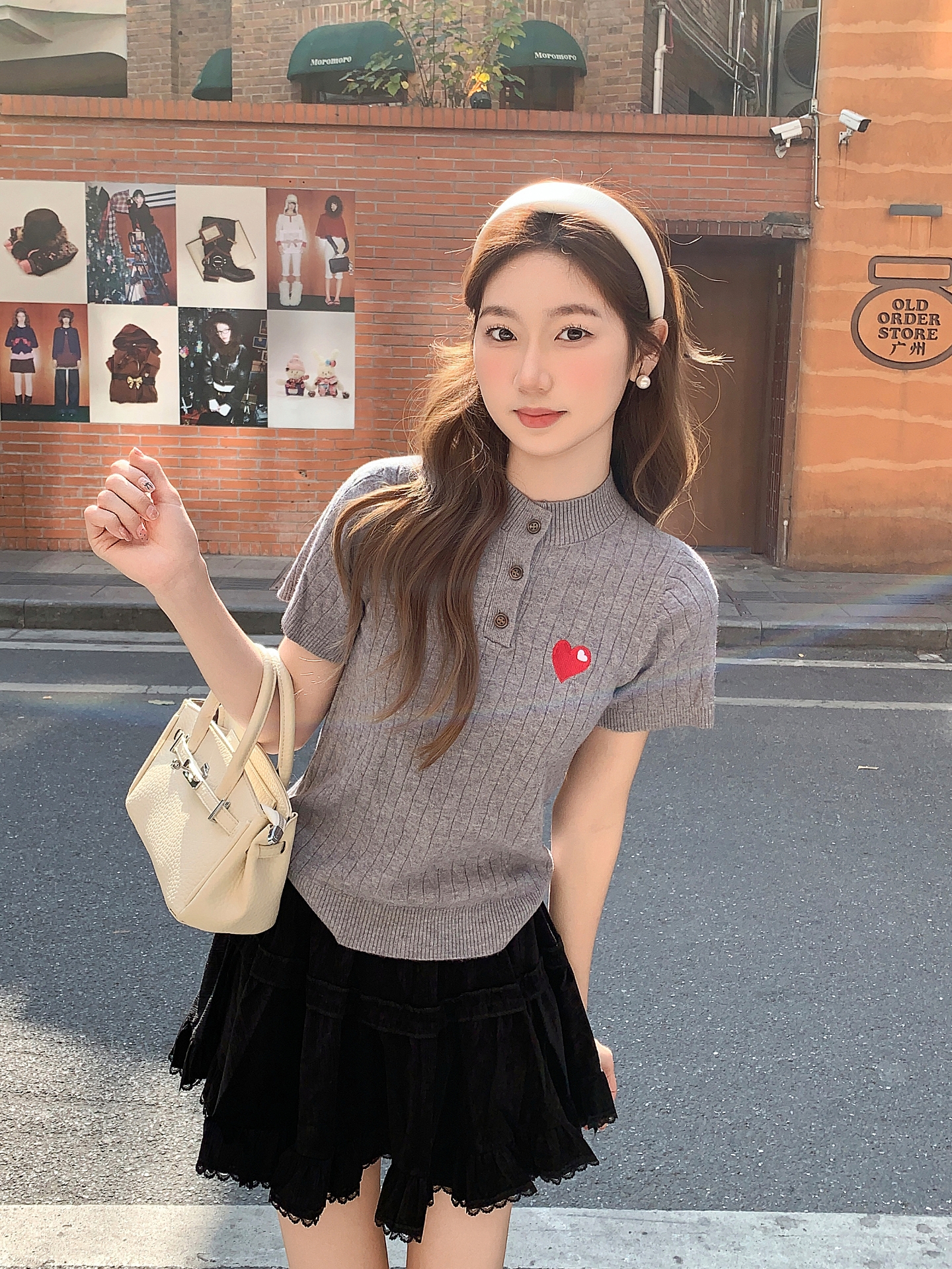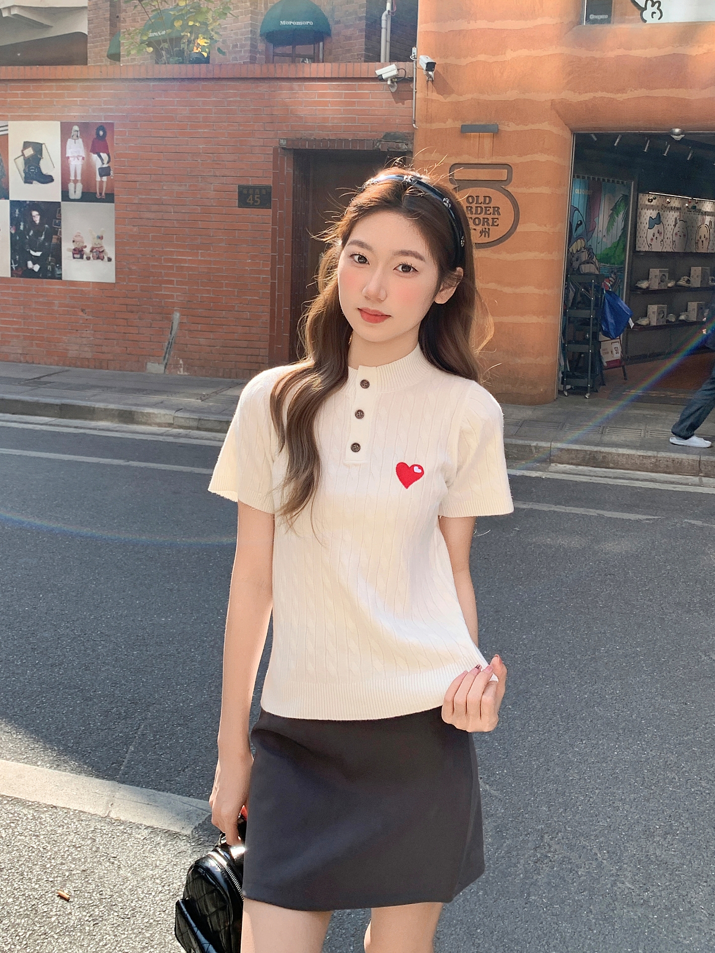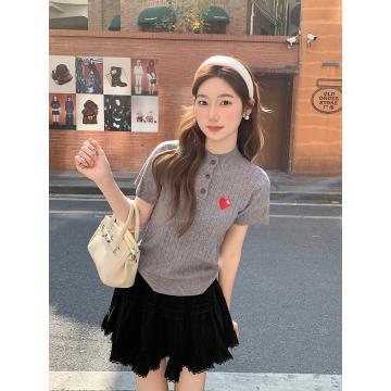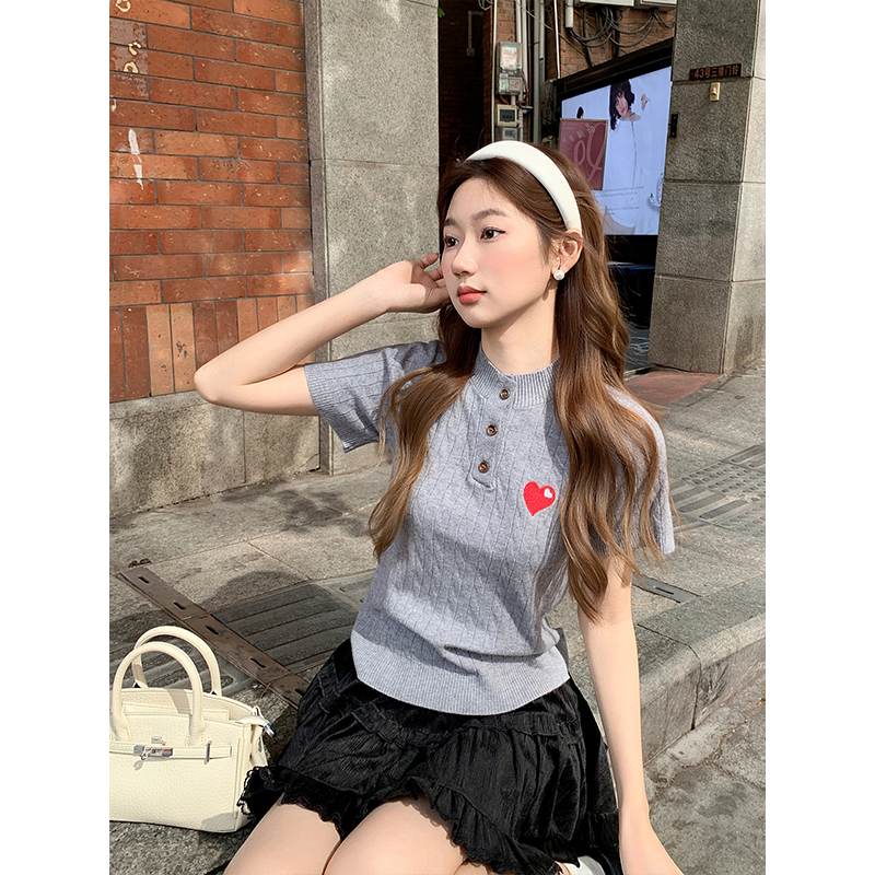爱心刺绣圆领纽扣短袖针织衫女新款设计感修身正肩内搭上衣 服裝批發女裝批發服飾貨源