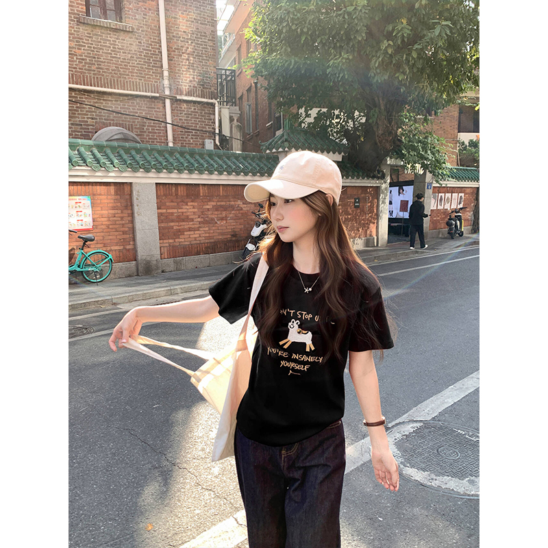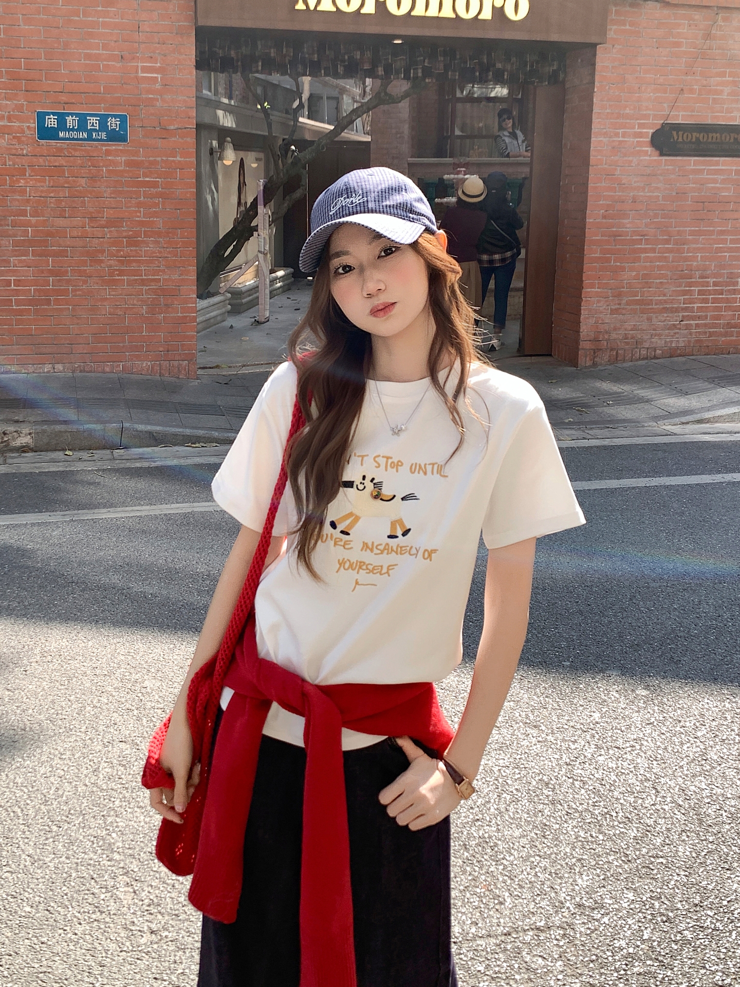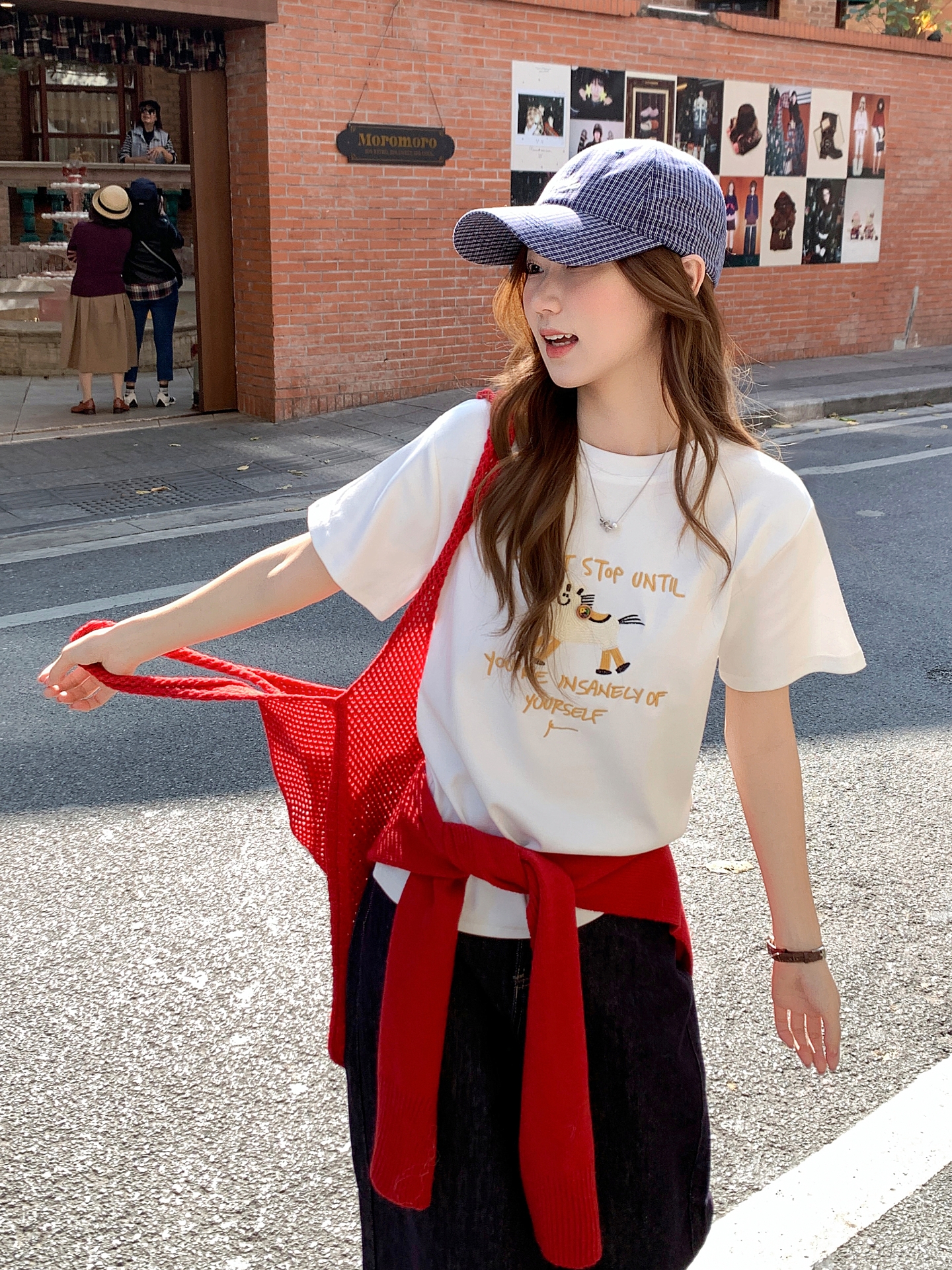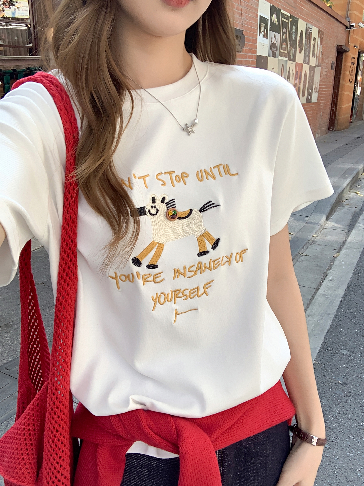 红色圆领正肩卡通刺绣短袖t恤女早春新款宽松显瘦百搭小上衣 服裝批發女裝批發服飾貨源