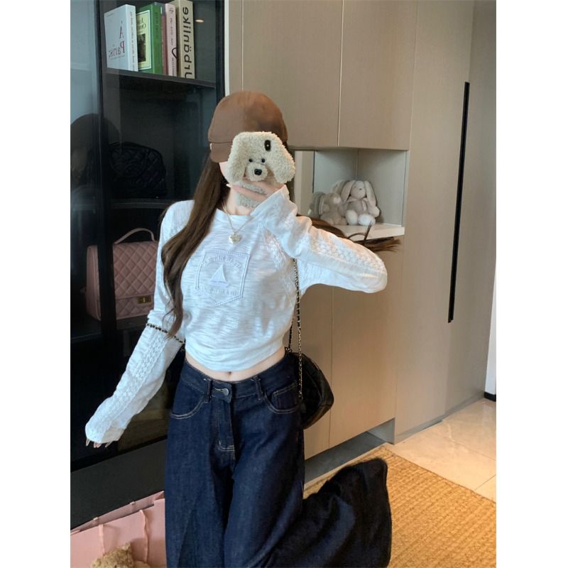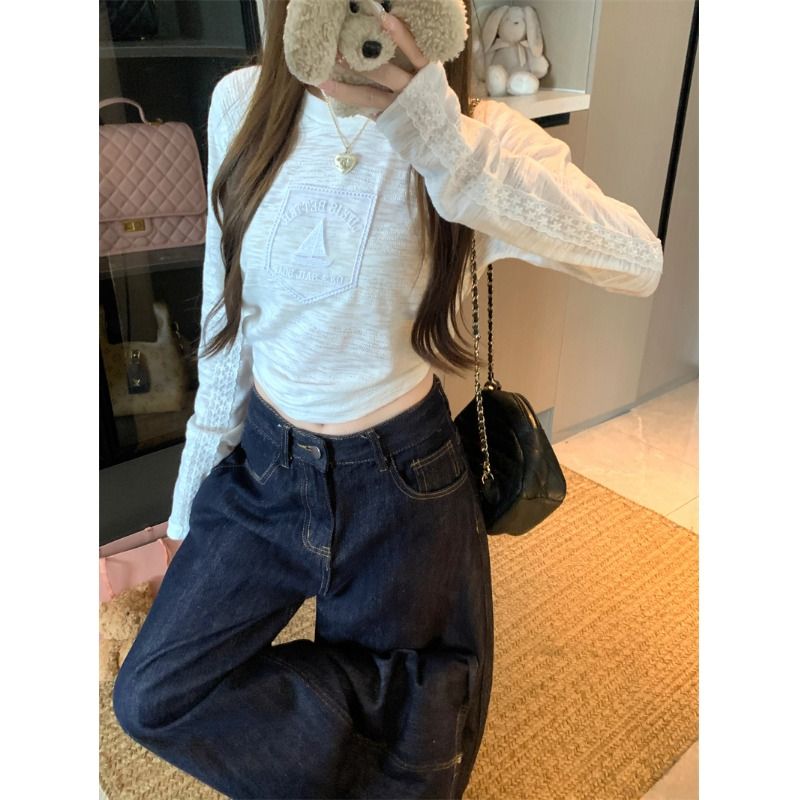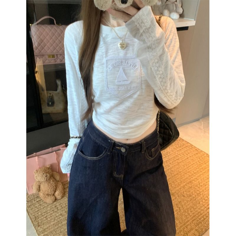 BY10904# 提花白色蕾丝花边字母圆领长袖T恤女秋季修身内搭打底上衣 服裝批發女裝批發服飾貨源