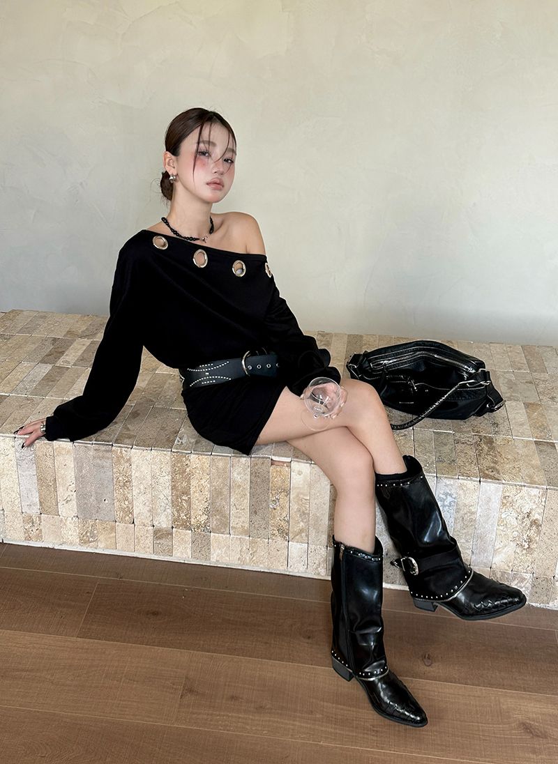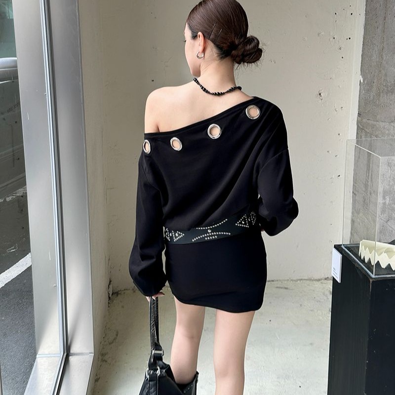 BY10912# 连衣裙女秋设计感小众辣妹风一字领收腰显瘦包臀短裙配腰带 服裝批發女裝批發服飾貨源