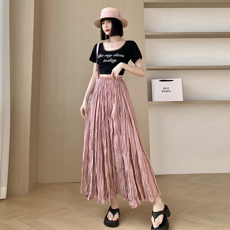 BY10929# 白色皱皱半身裙女新款中长款褶皱奶油裙a子森系百搭长裙 服裝批發女裝批發服飾貨源