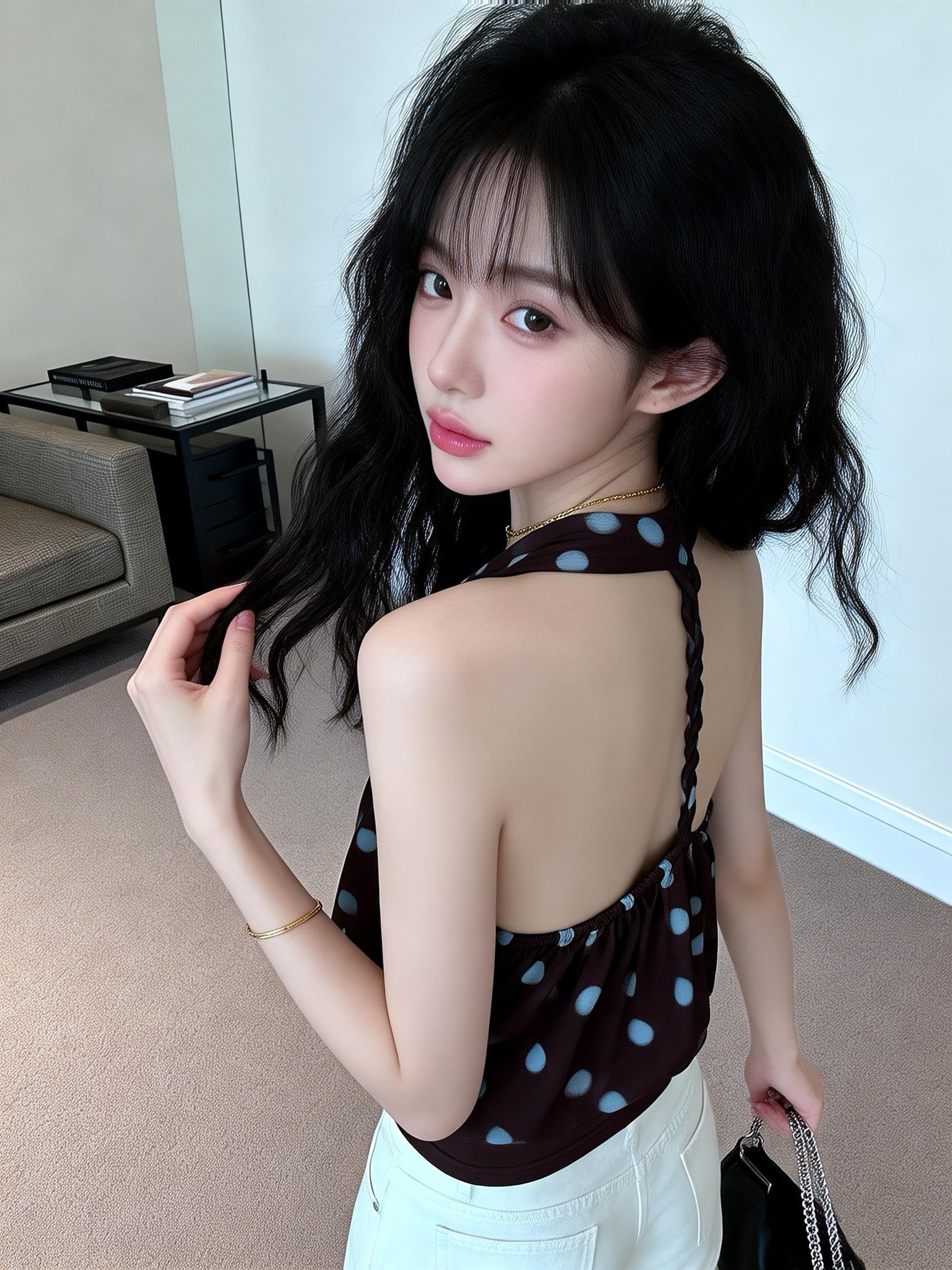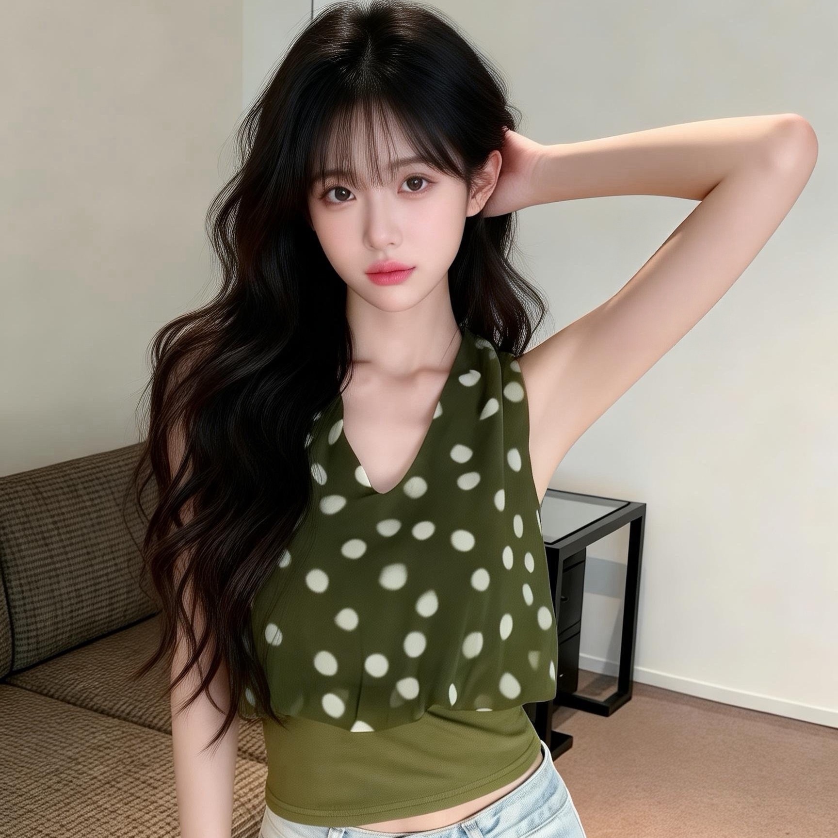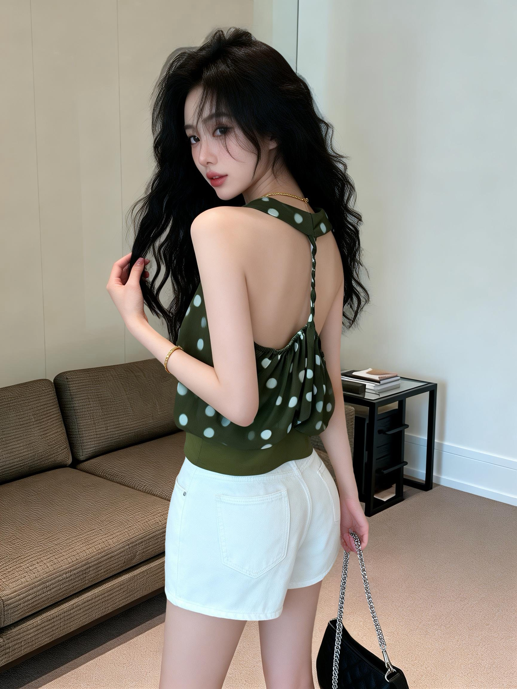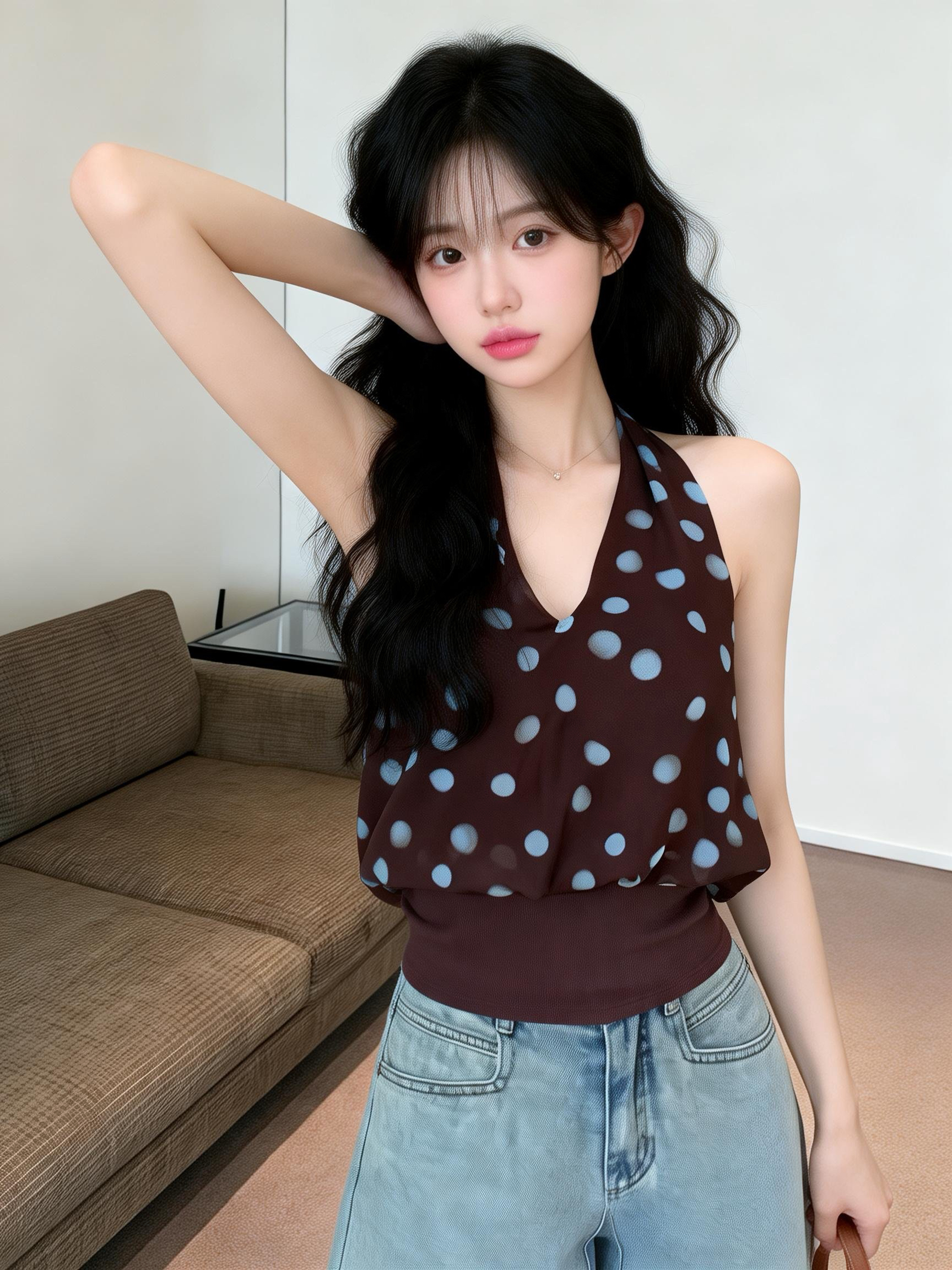 BY12558# 复古后背扭结撞色波点下拼接针织挂脖上衣 服裝批發女裝批發服飾貨源