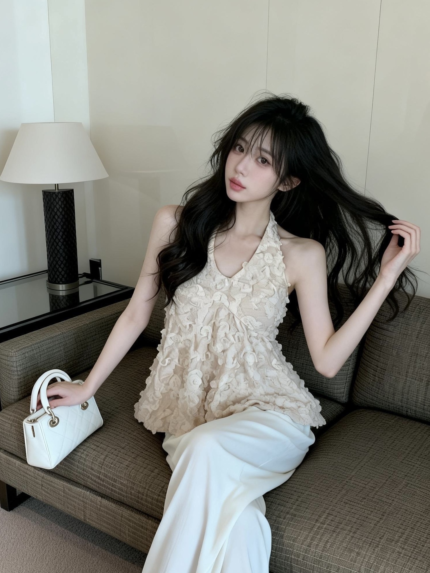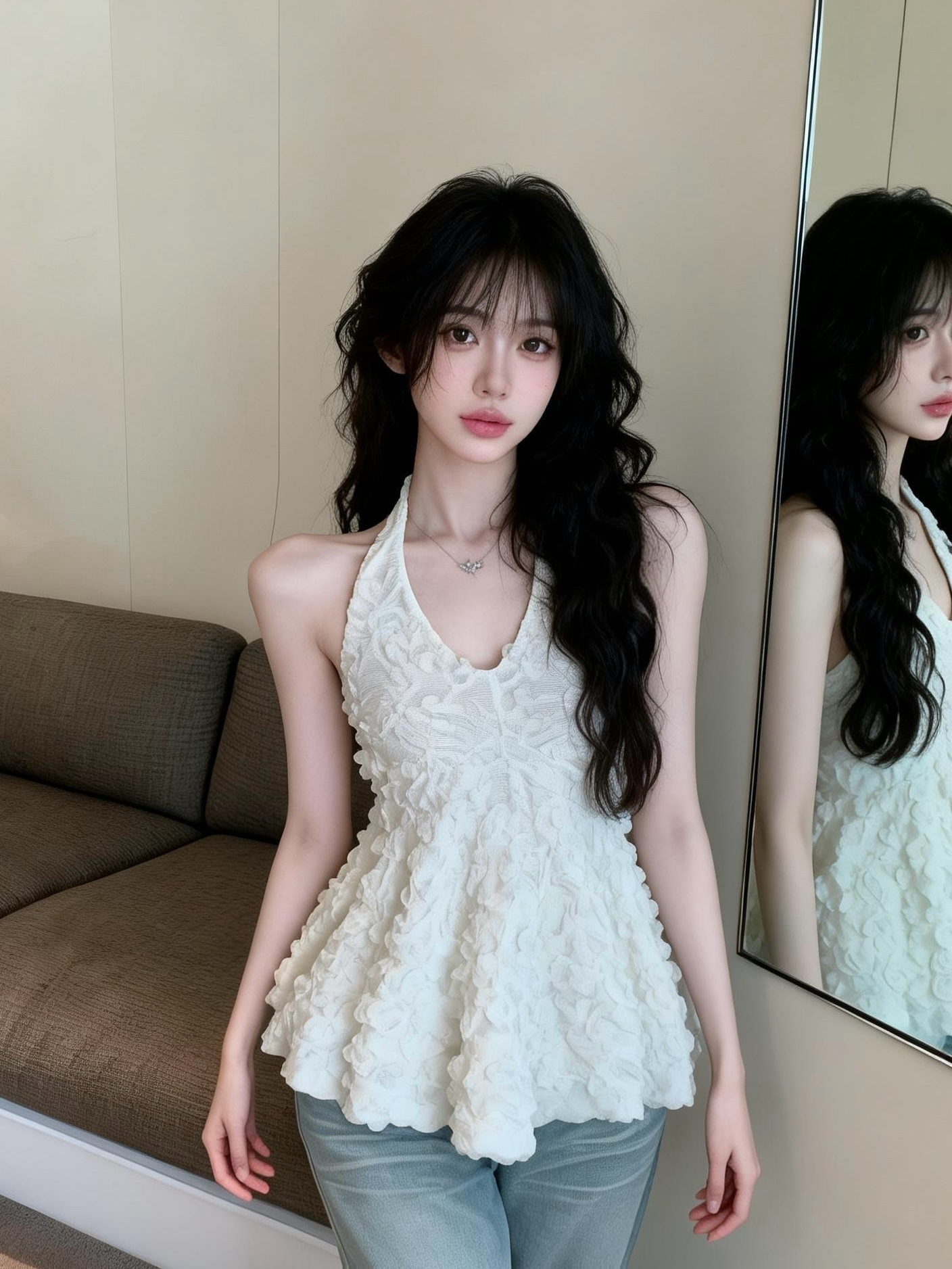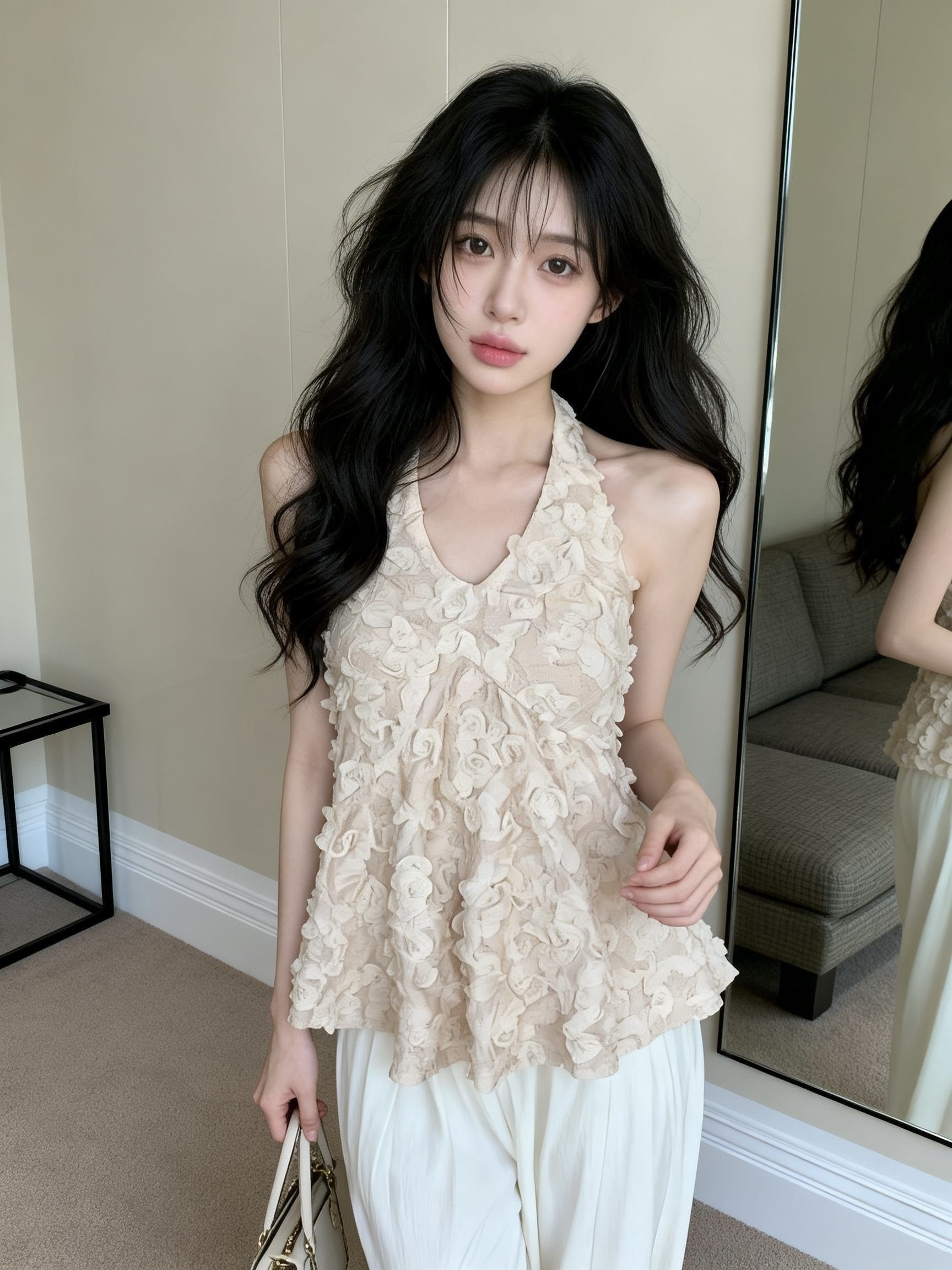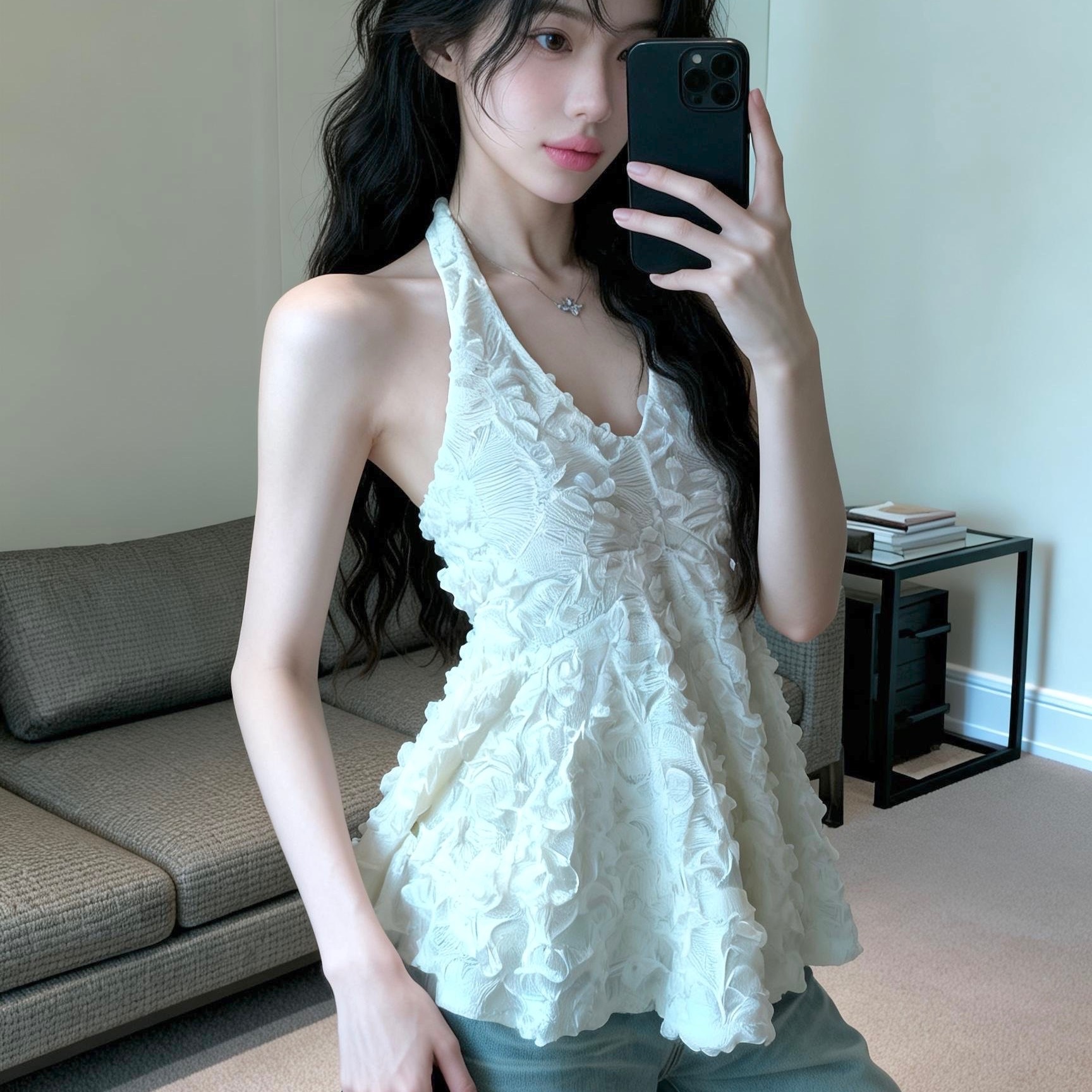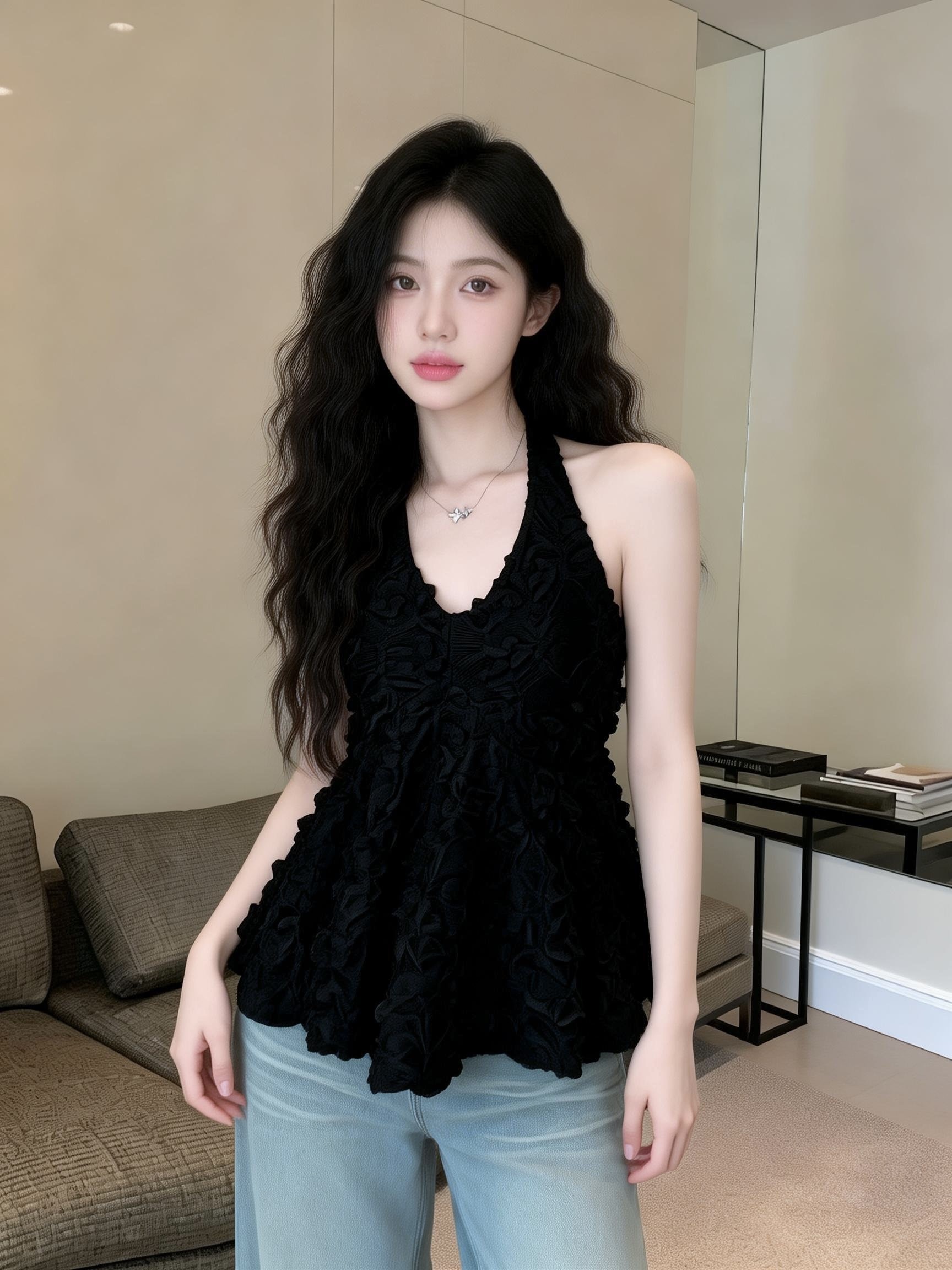 BY12562# 纯欲浪漫氛围感立体花边挂脖上衣 服裝批發女裝批發服飾貨源