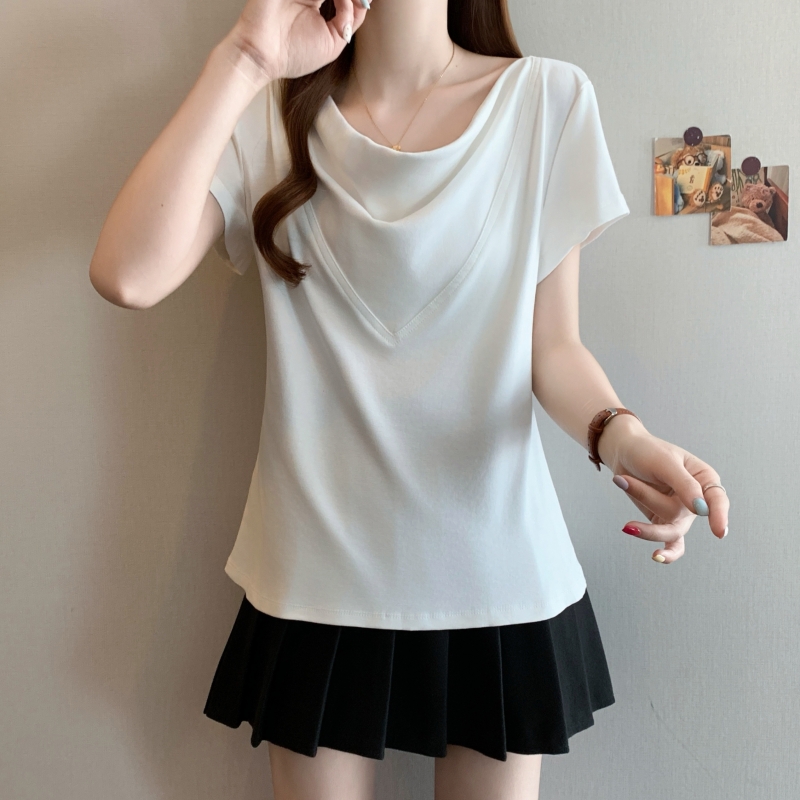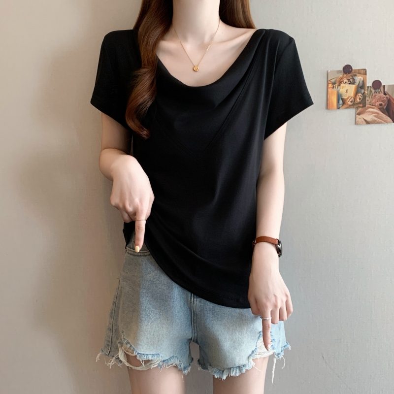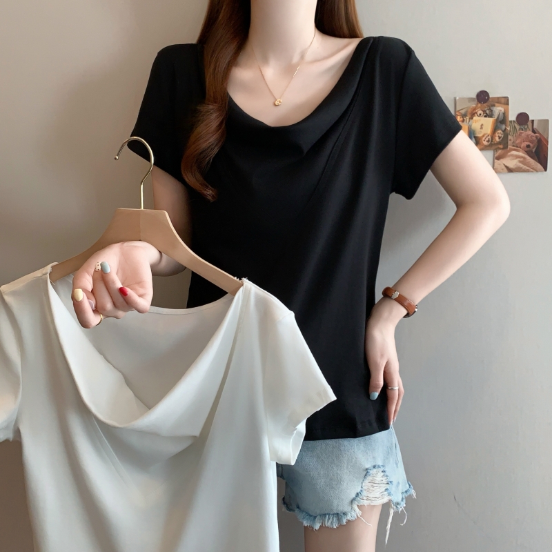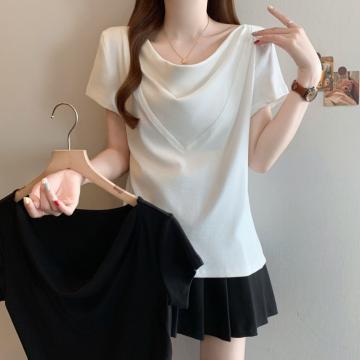 BY12599# 大码女装微胖mm夏季设计感荡领正肩上衣简约百搭显瘦短袖T桖 服裝批發女裝批發服飾貨源