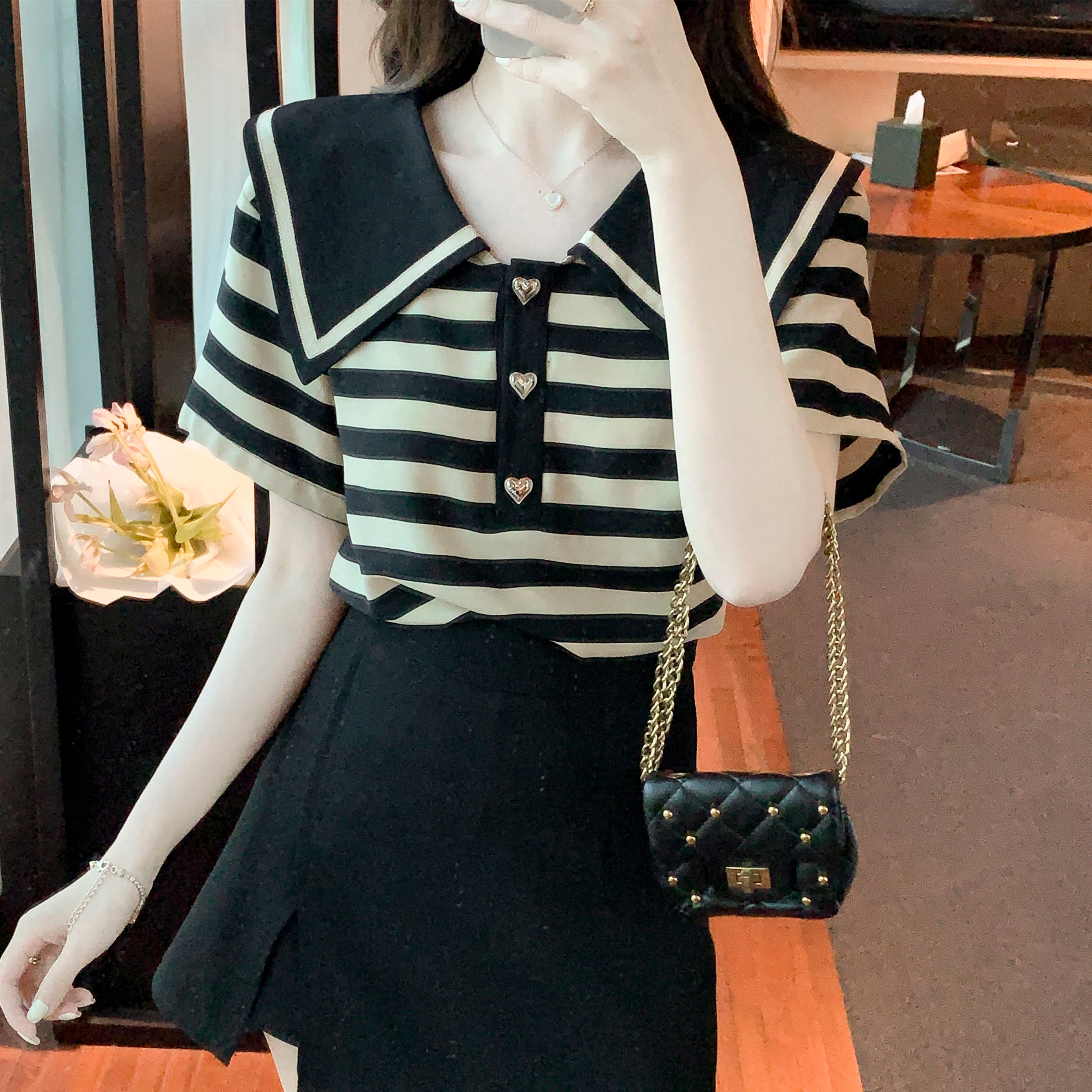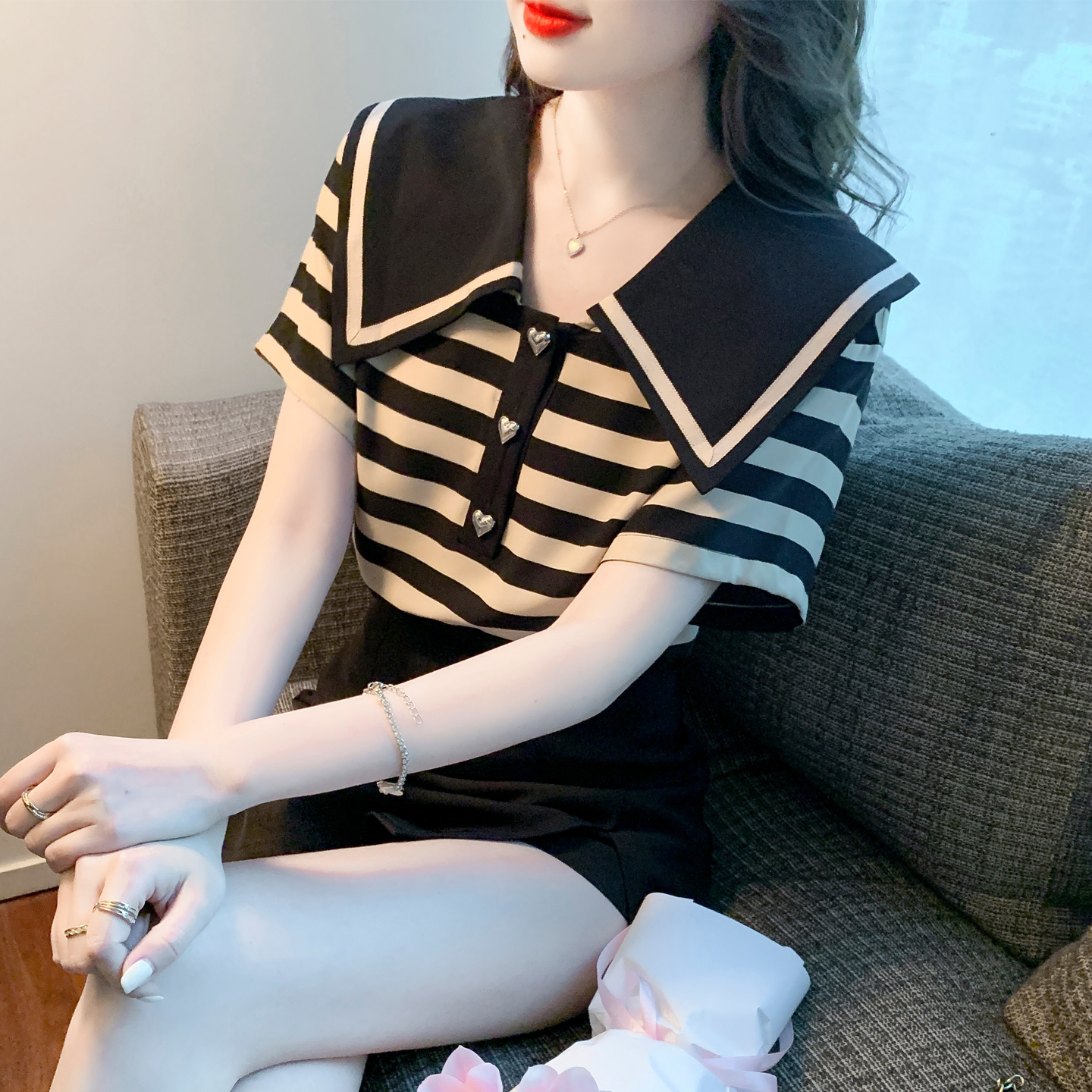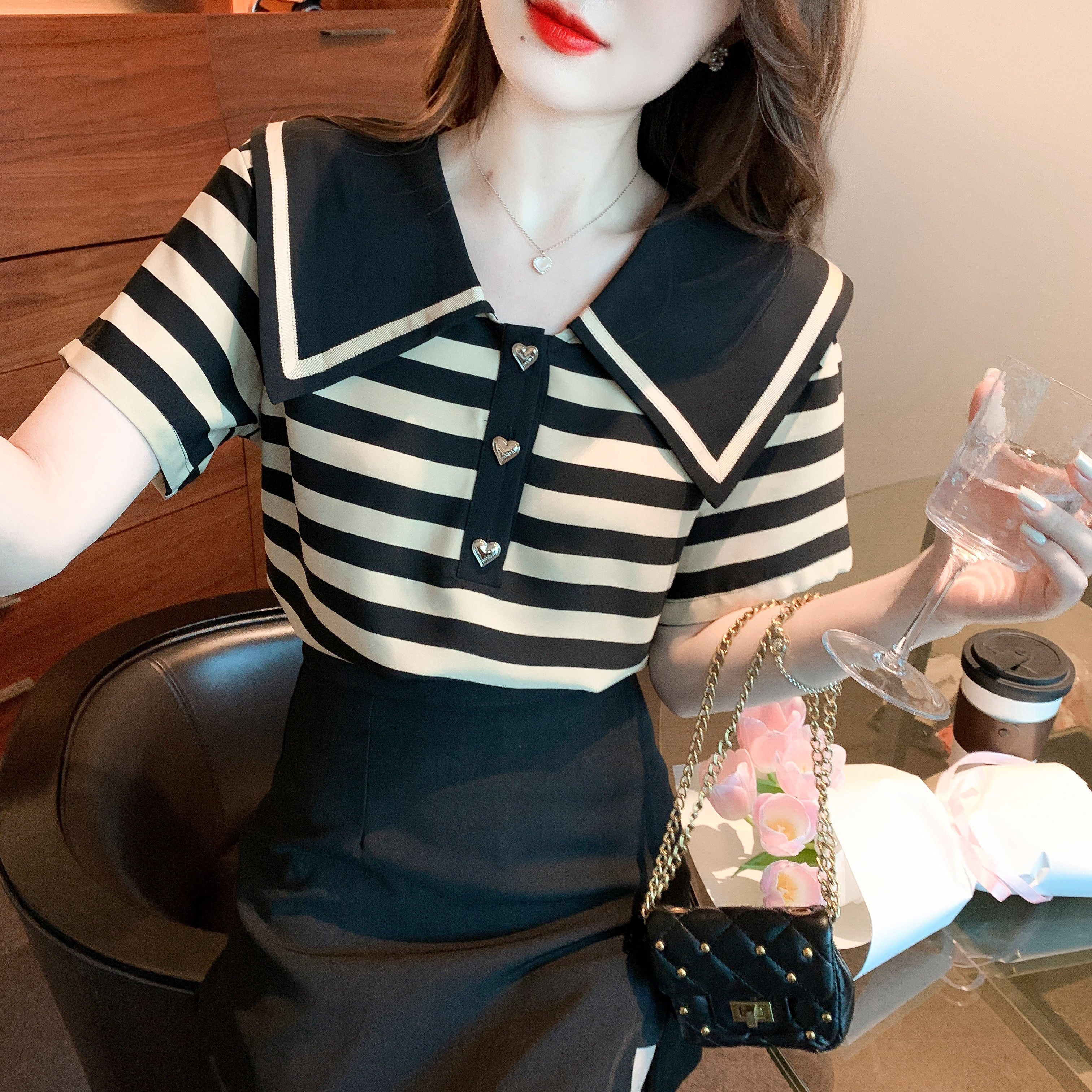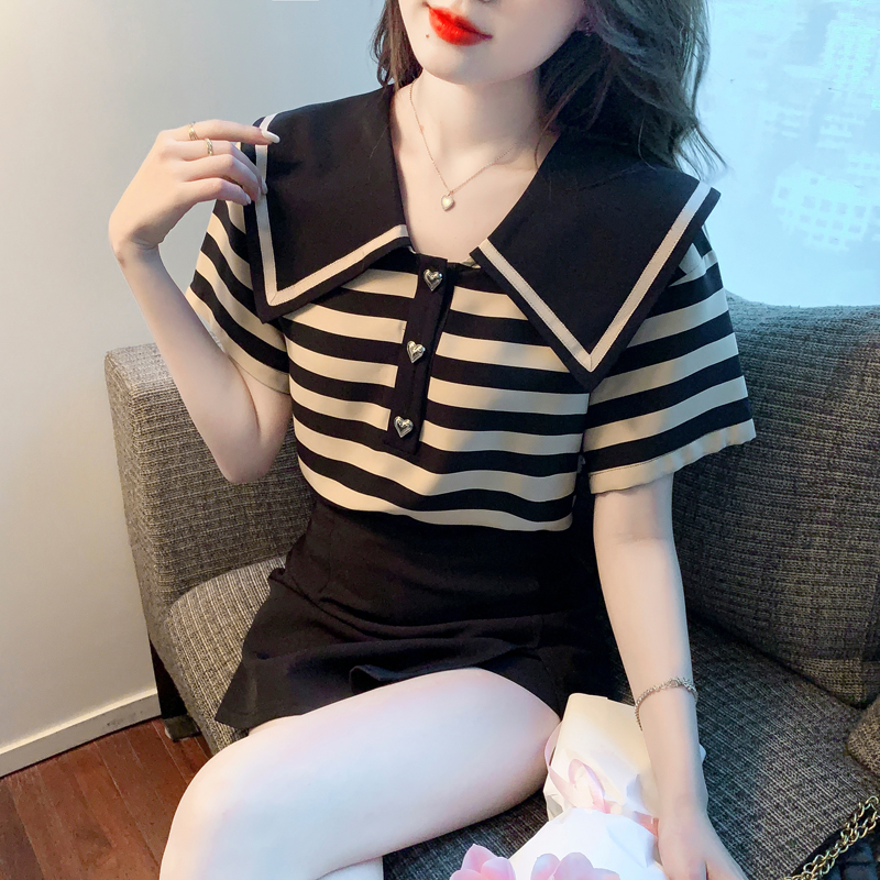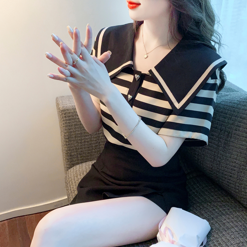 BY12680# 夏季新款大翻领条纹纯棉T恤衬衫短袖宽松显瘦上衣小衫 服裝批發女裝批發服飾貨源