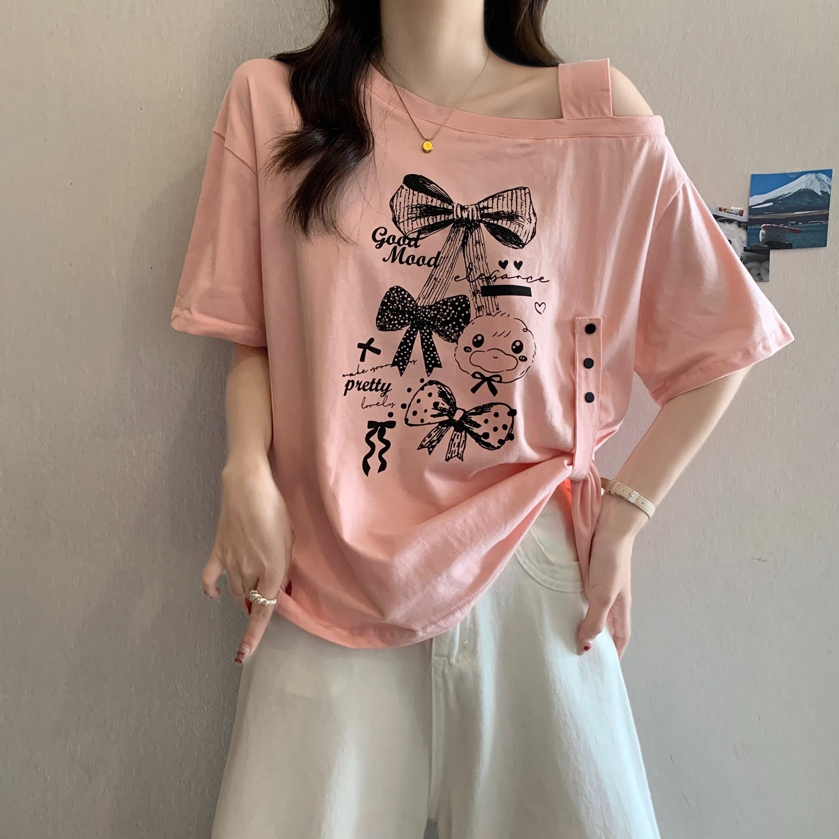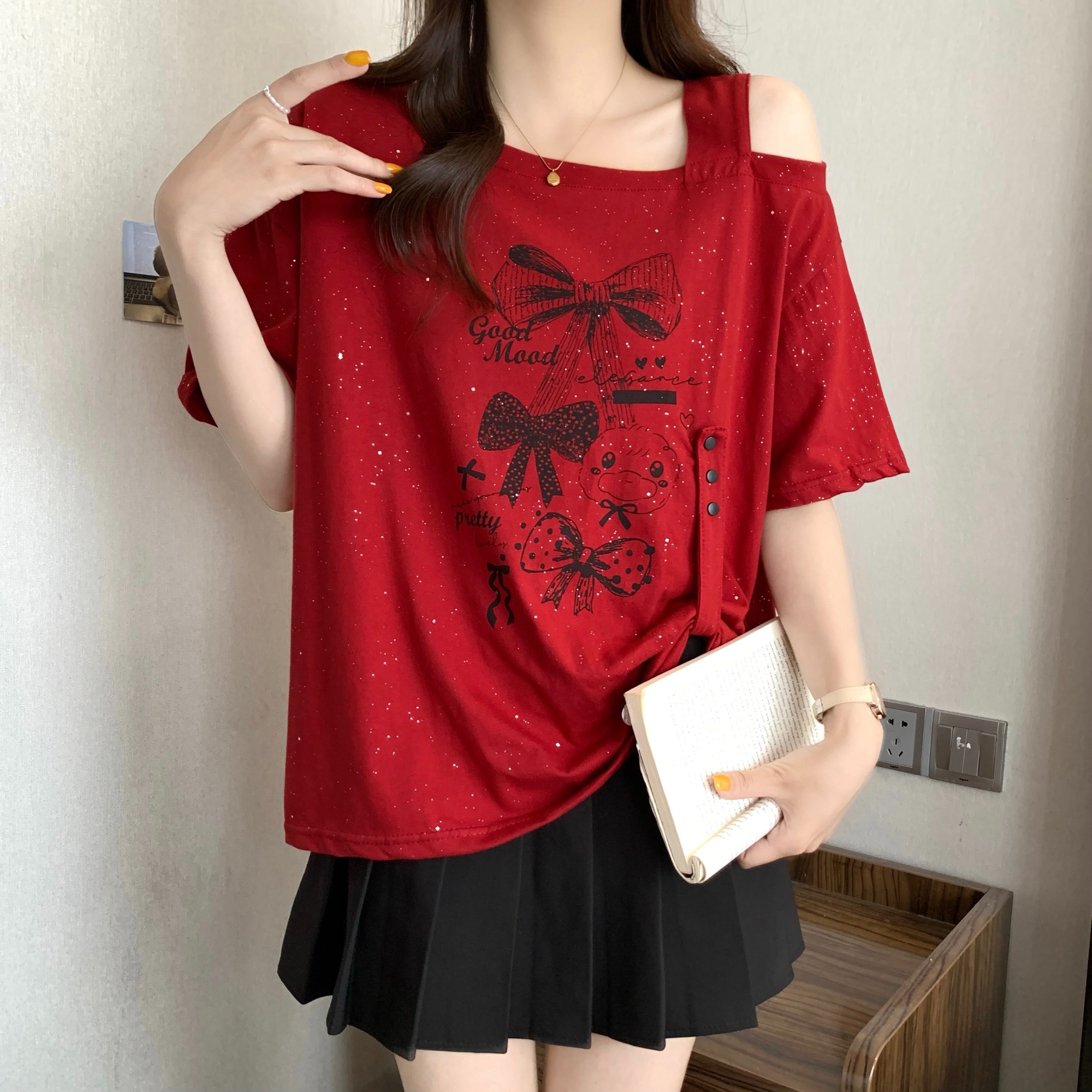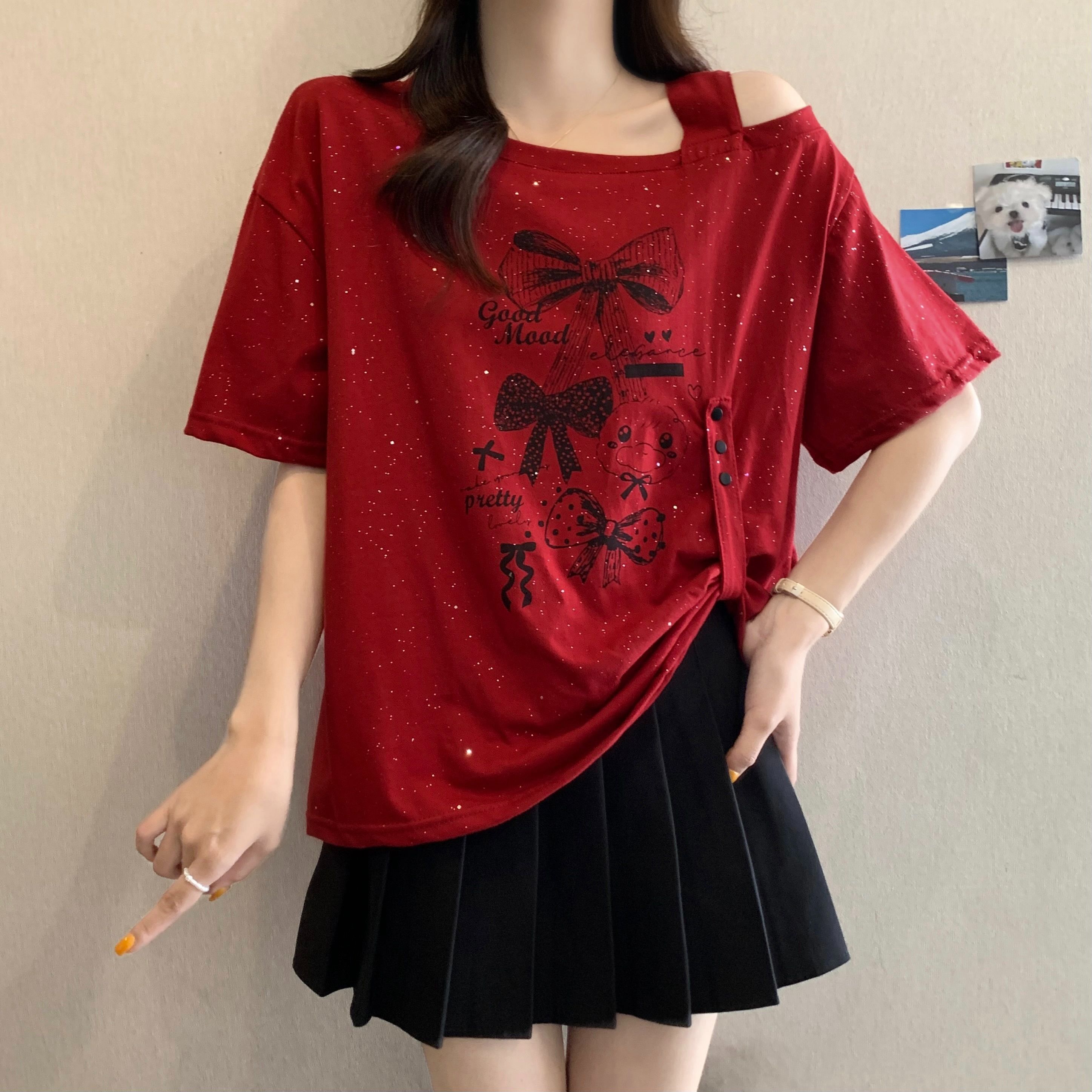BY12690# 纯棉夏季新款满天星设计感斜领露肩短袖上衣 服裝批發女裝批發服飾貨源
