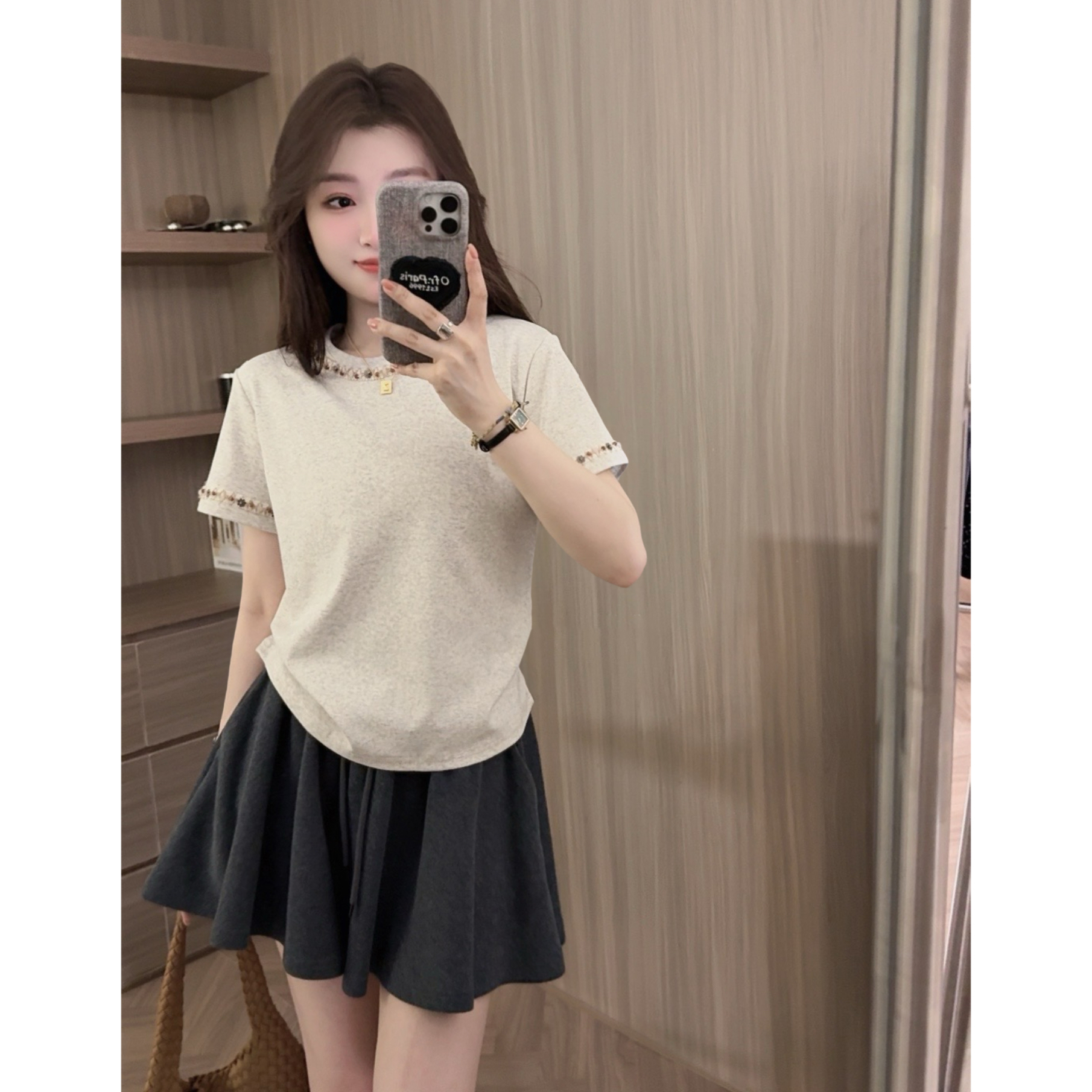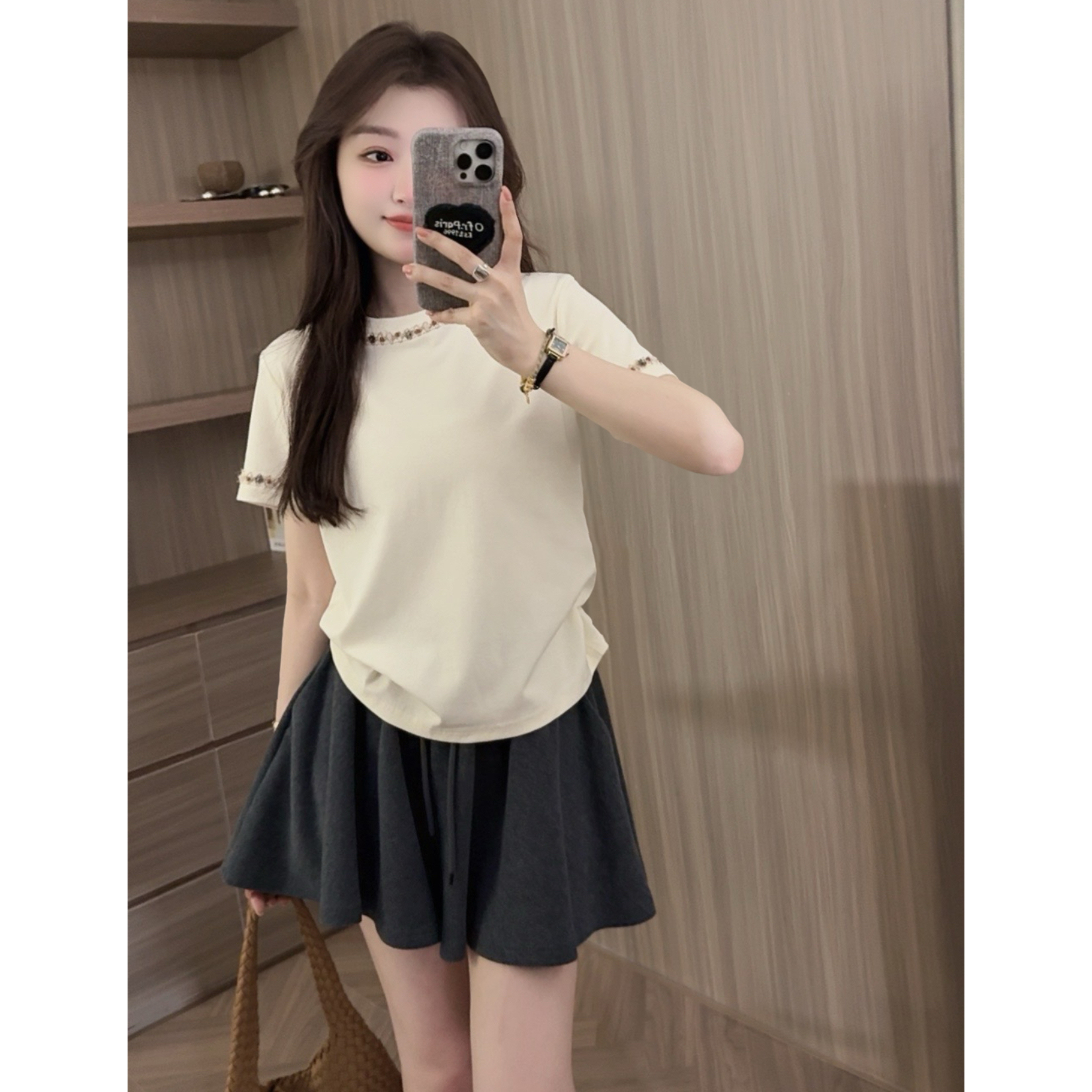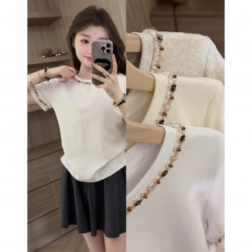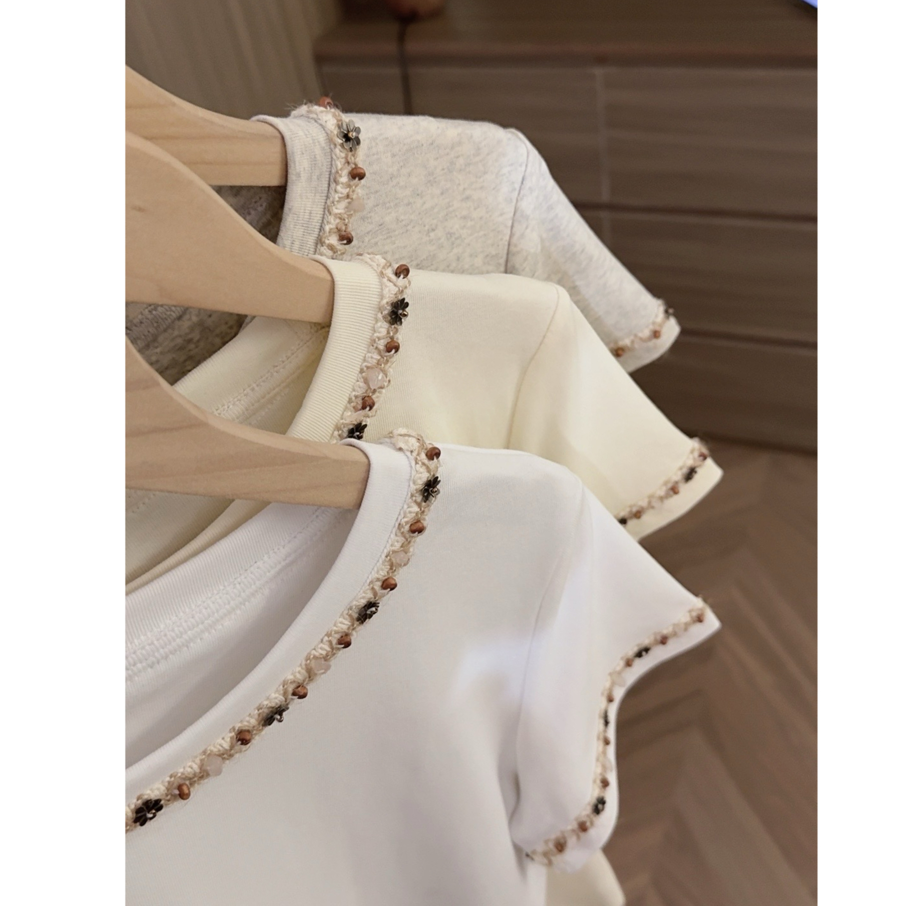BY12703# 韩版宽松休闲短袖t恤女夏季新中式国风串珠半袖洋气漂亮小衫 服裝批發女裝批發服飾貨源