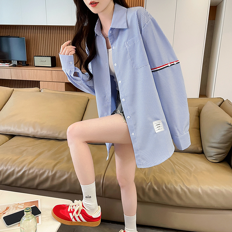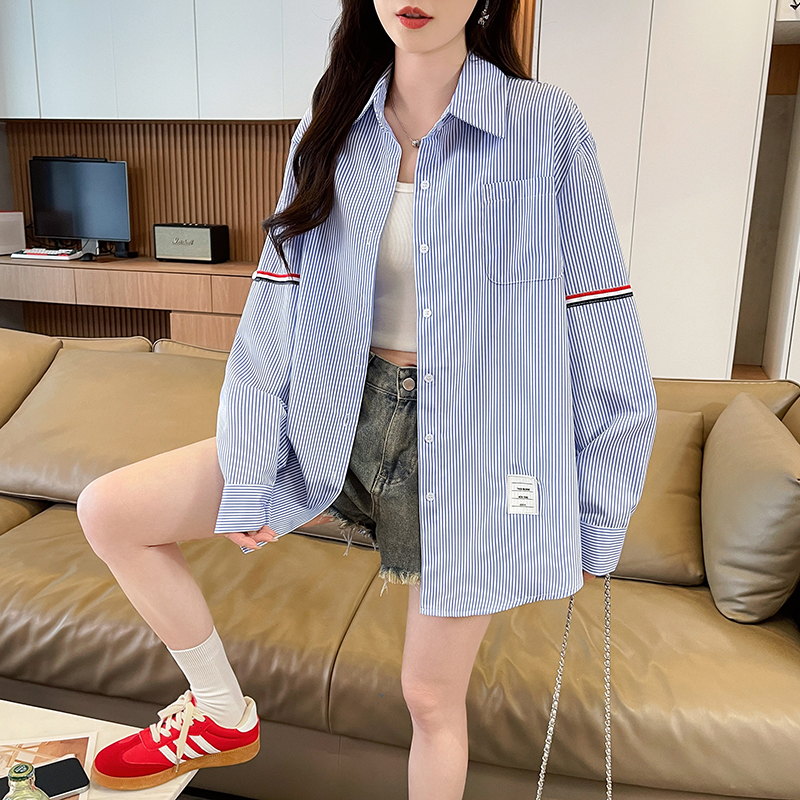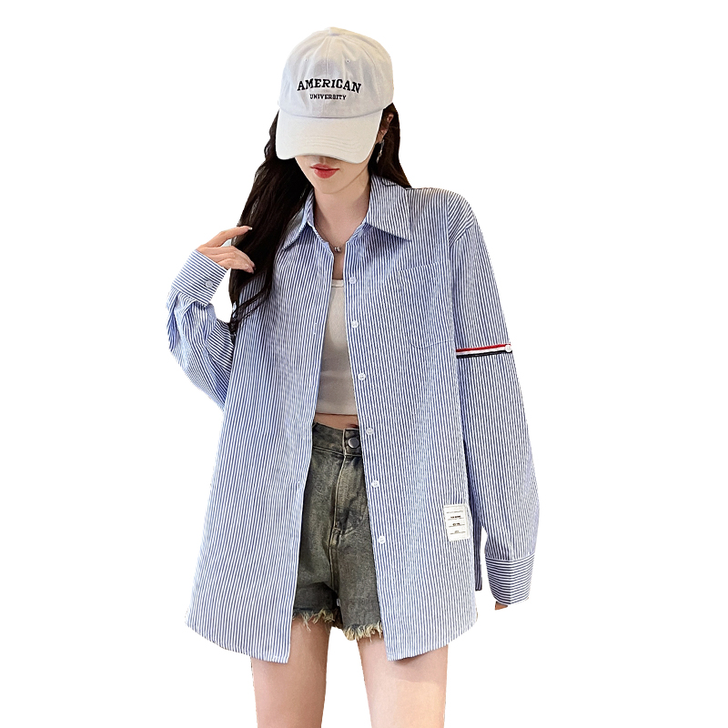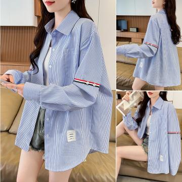 BY14608# 韩系条纹长袖衬衫女夏季薄款防晒宽松慵懒风通勤百搭衬衣 服裝批發女裝批發服飾貨源