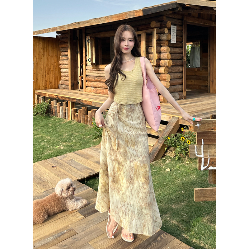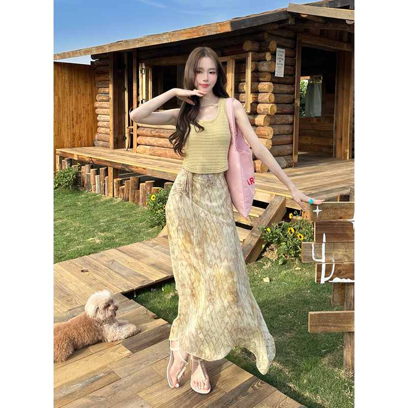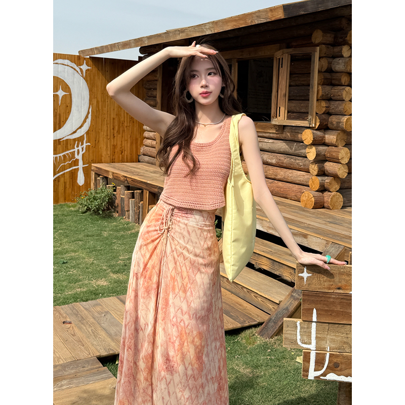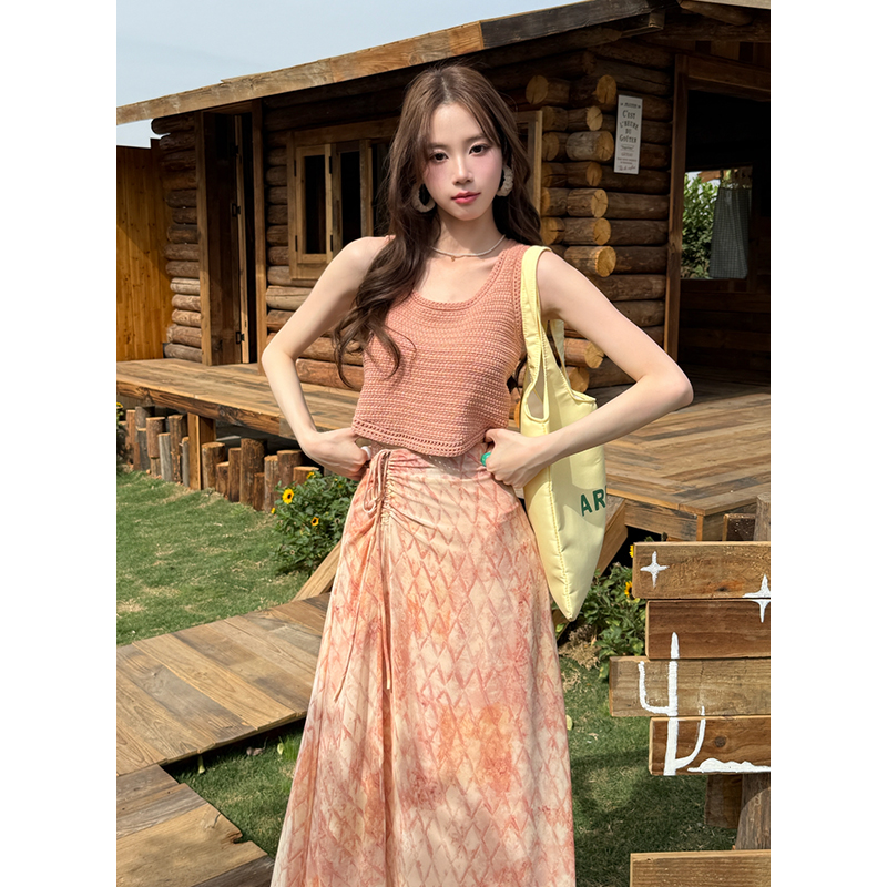 BY14692# 夏季新款纯色针织上衣+雪纺碎花半身裙两件套女时尚套装 服裝批發女裝批發服飾貨源