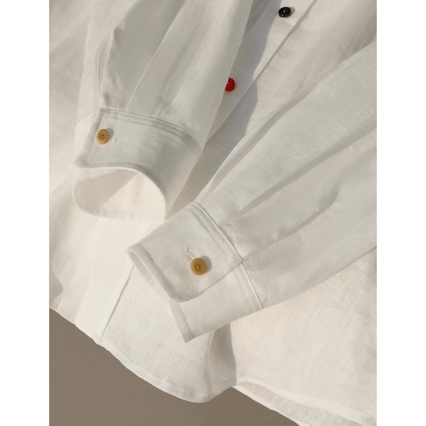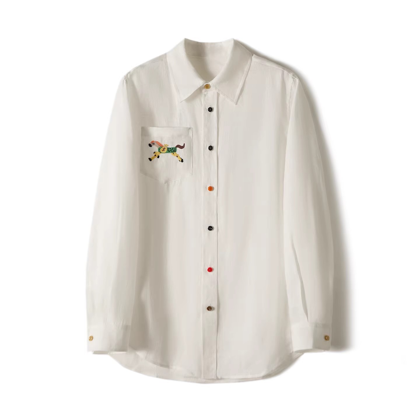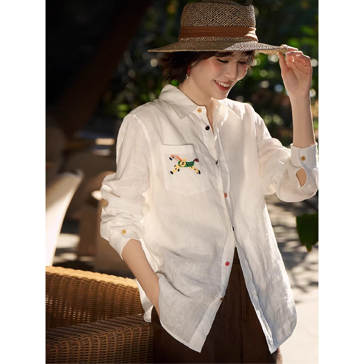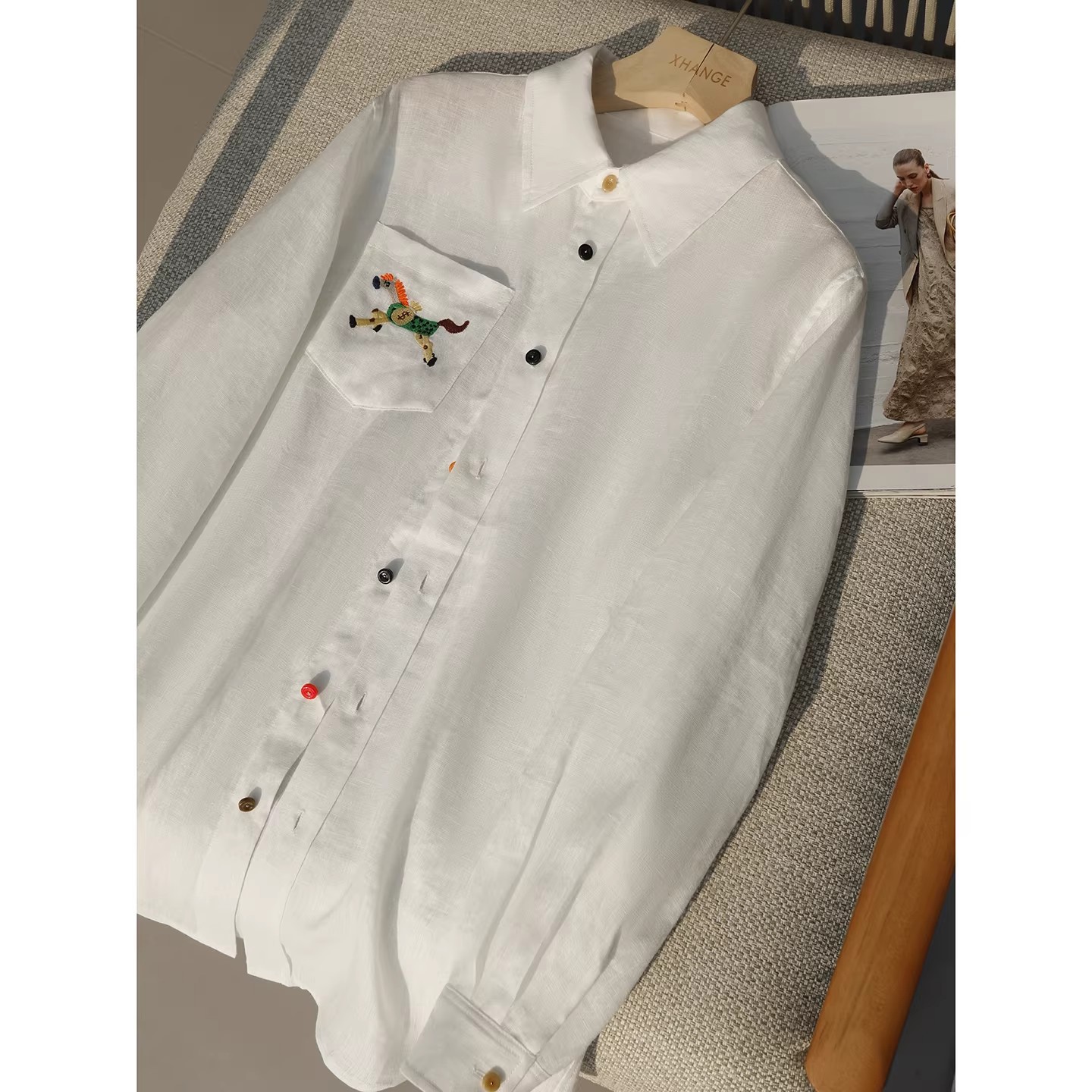 BY15189# 美妙的事老钱风亚麻衬衫_彩虹单排扣小马口袋刺绣衬衣女26新款服裝批發女裝批發服飾貨源