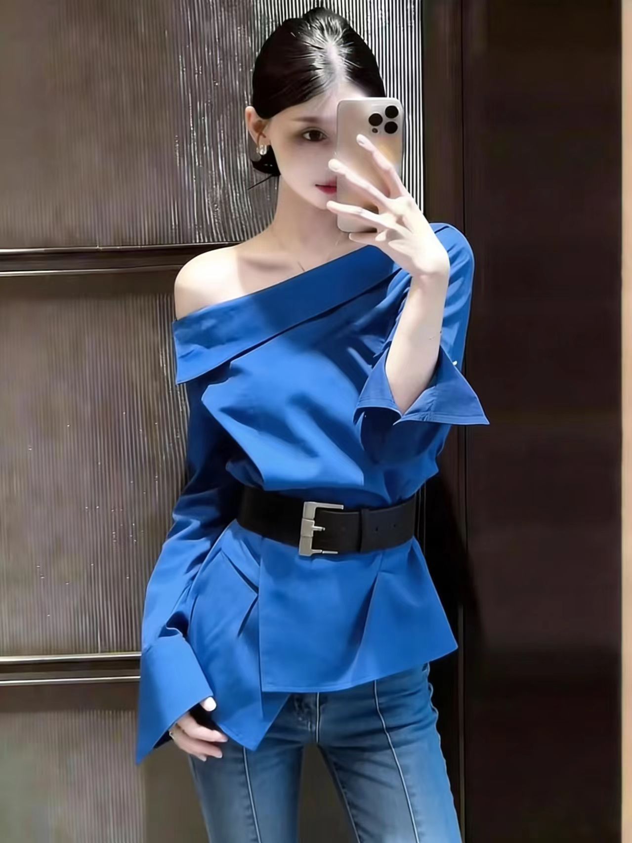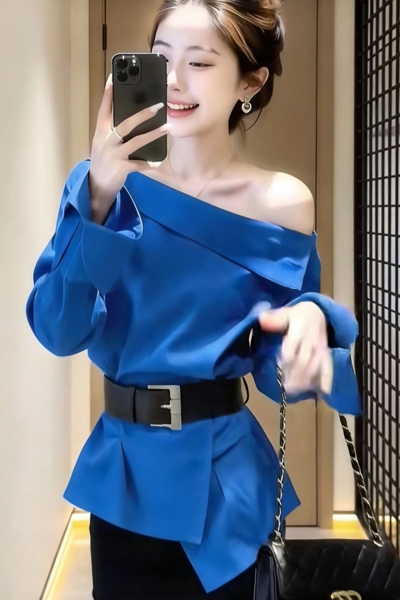 BY15937# 夏季上新法式气质设计感穿搭女斜肩长袖衬衫 服裝批發女裝批發服飾貨源