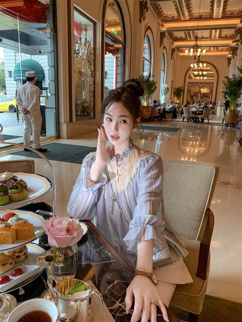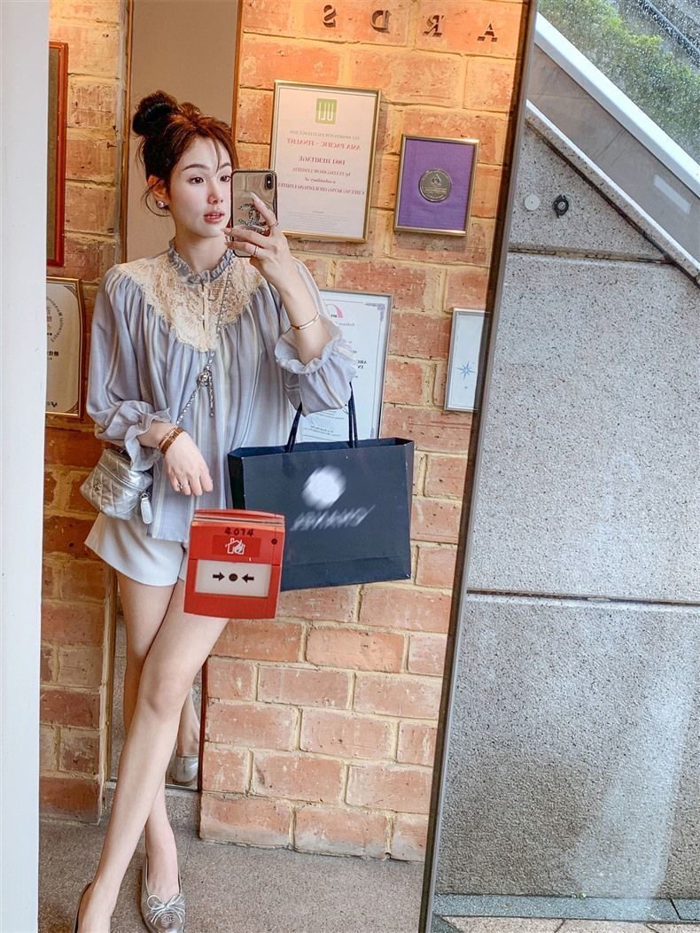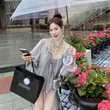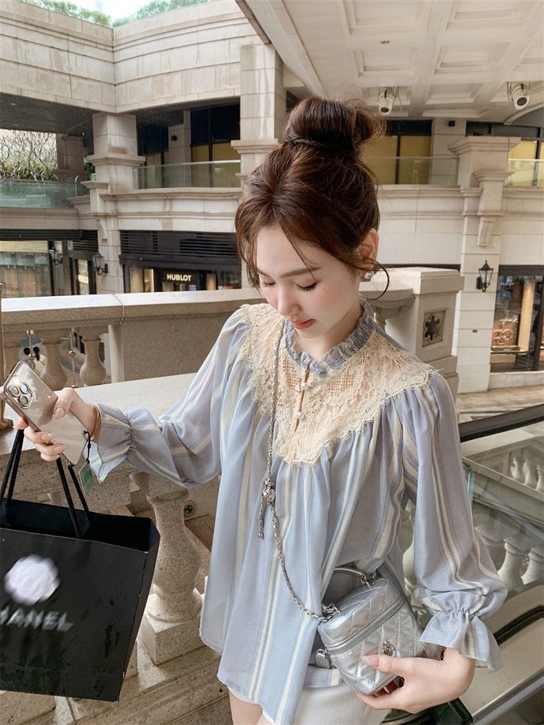 BY16145# 夏季新款蕾丝镂空拼接衬衫女浅蓝条纹雪纺上衣名媛气质小衫女 服裝批發女裝批發服飾貨源