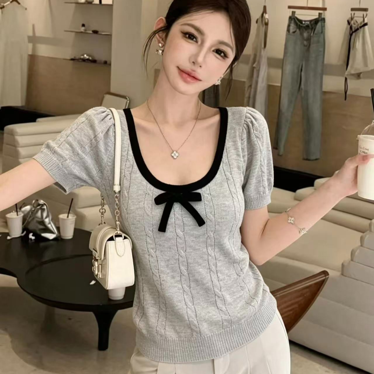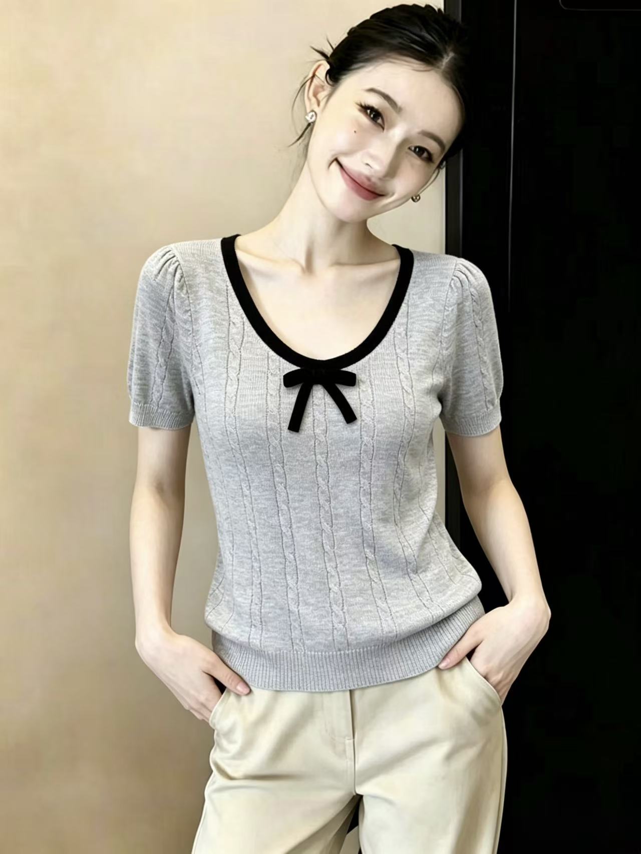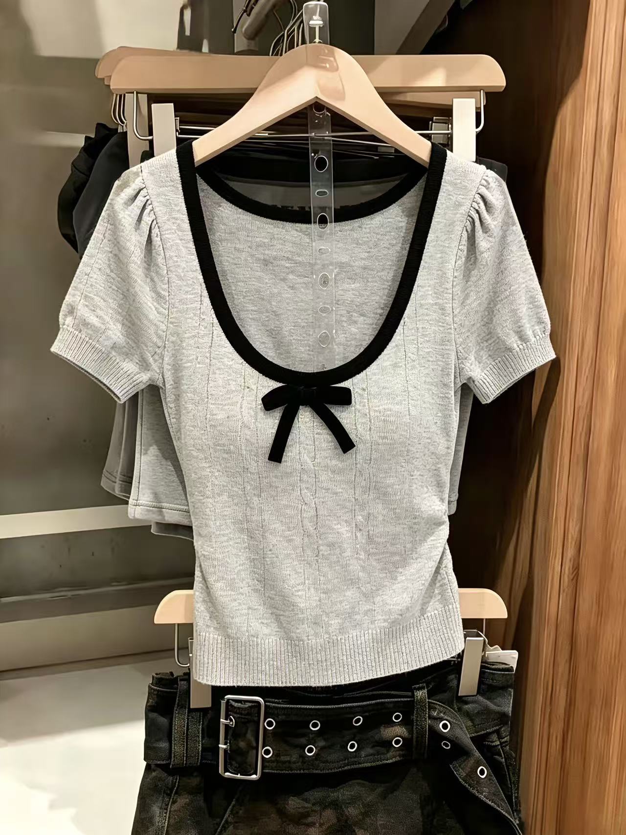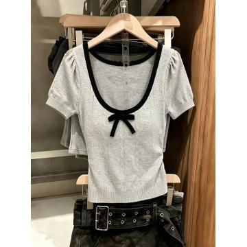 BY16348# U领蝴蝶结撞色短袖针织衫新款夏独特别致小众半袖设计感上衣 服裝批發女裝批發服飾貨源