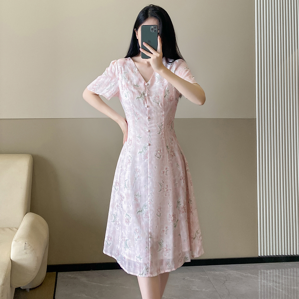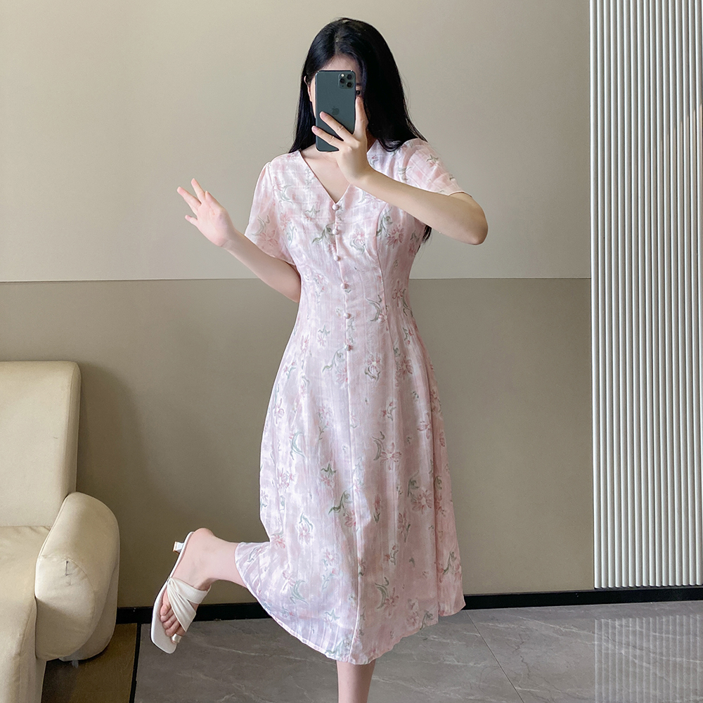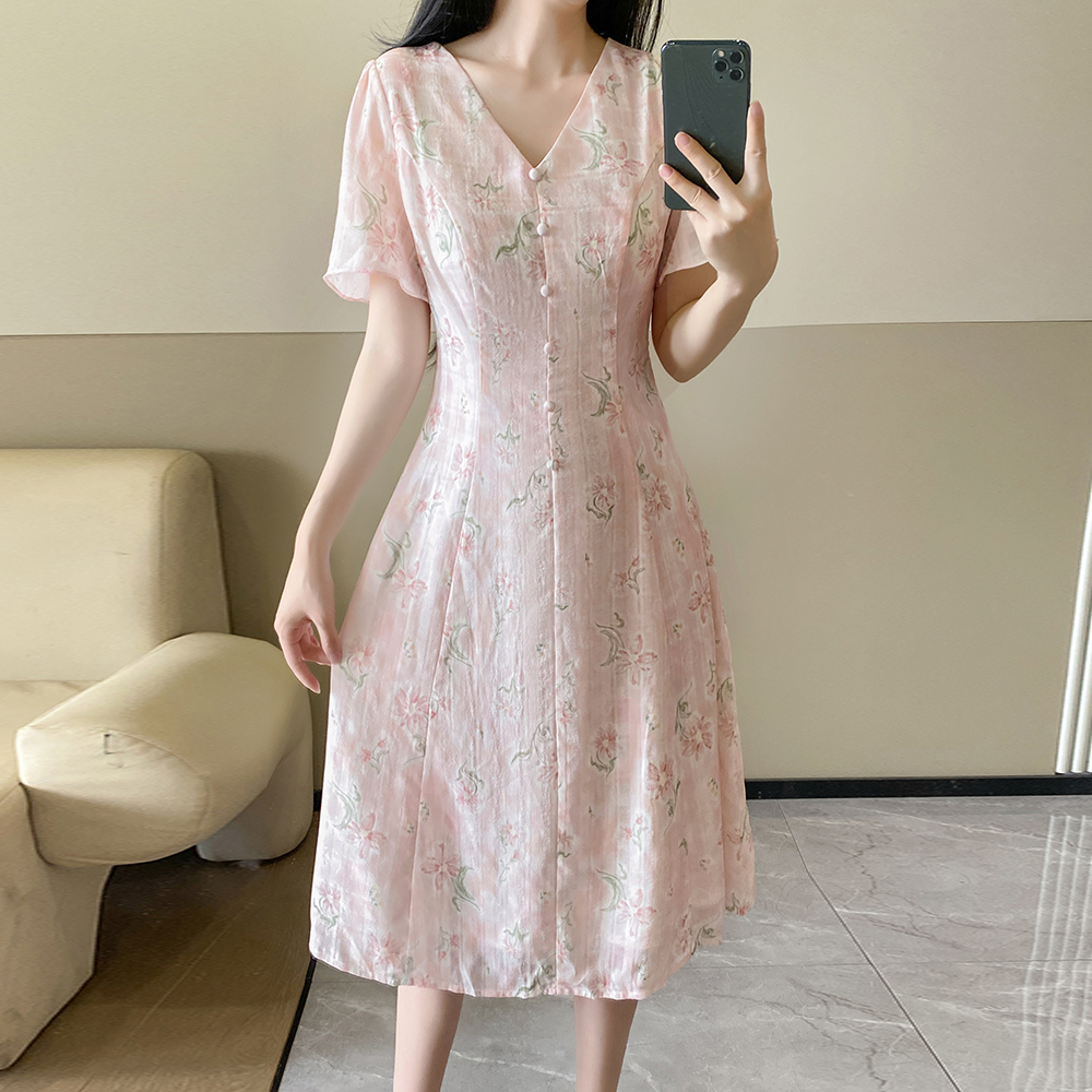 BY16355# 法式温柔风V领碎花连衣裙女大码显瘦气质减龄中长裙 服裝批發女裝批發服飾貨源