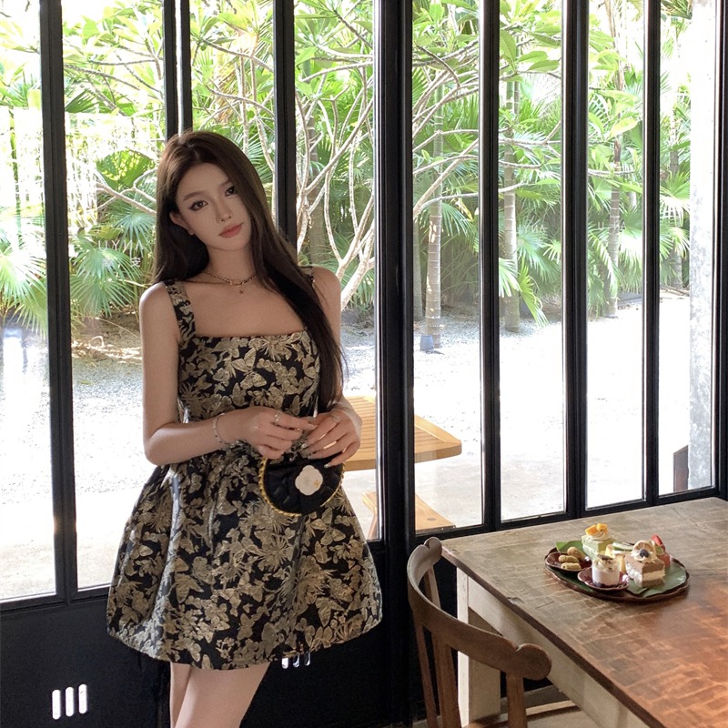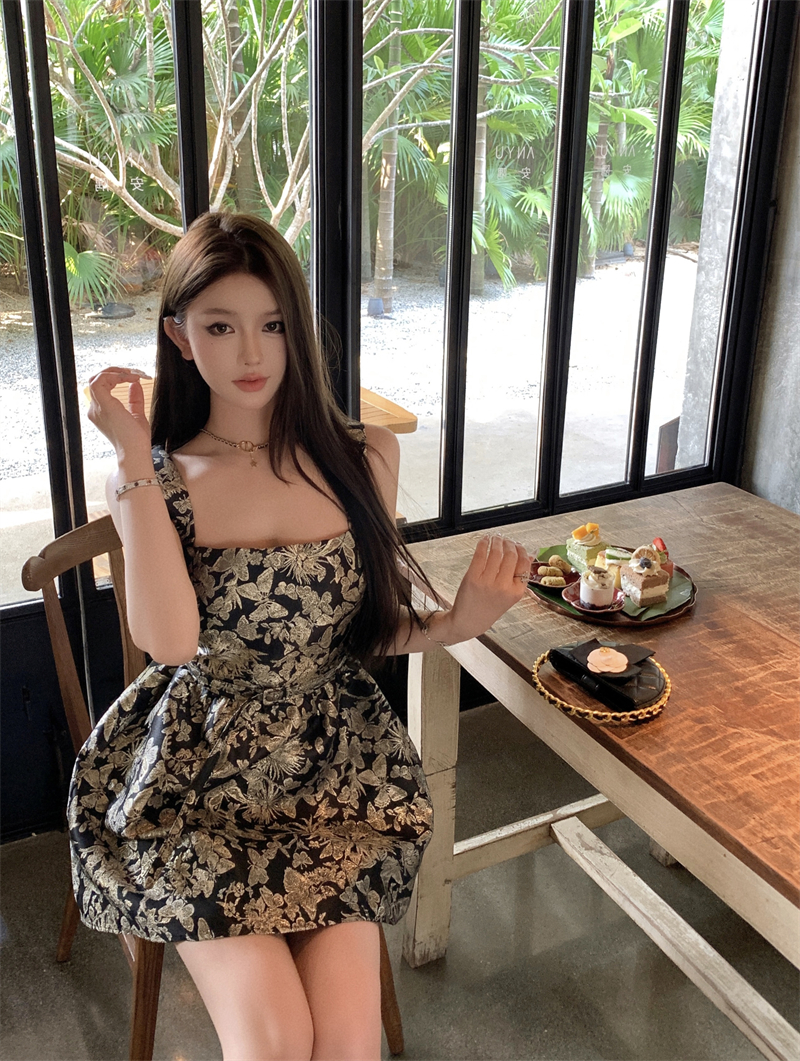 BY16371# 黑金蝴蝶提花吊带连衣裙高级感掐腰蓬蓬感生日礼服短裙 服裝批發女裝批發服飾貨源