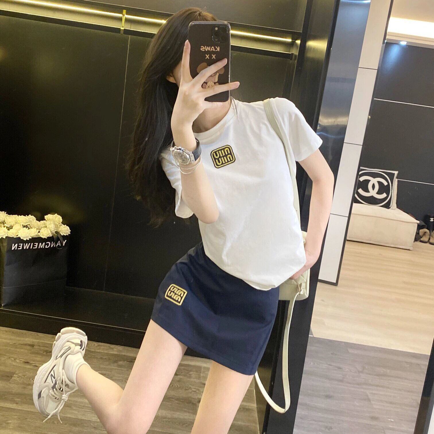 BY16394# 夏季新款韩系学院风刺绣圆领字母短袖T恤女高级感半身裙时尚套装 服裝批發女裝批發服飾貨源