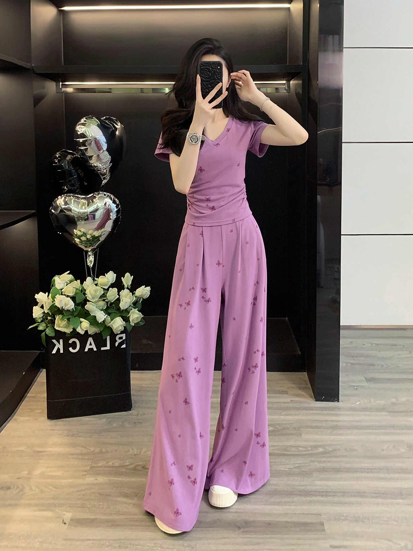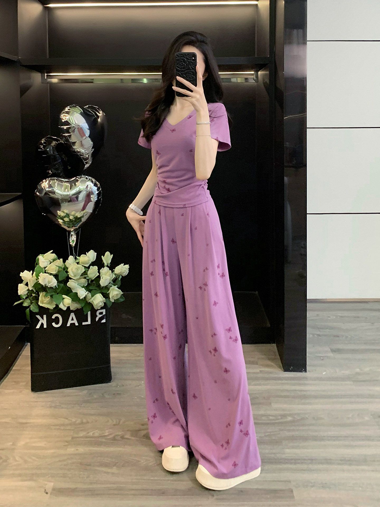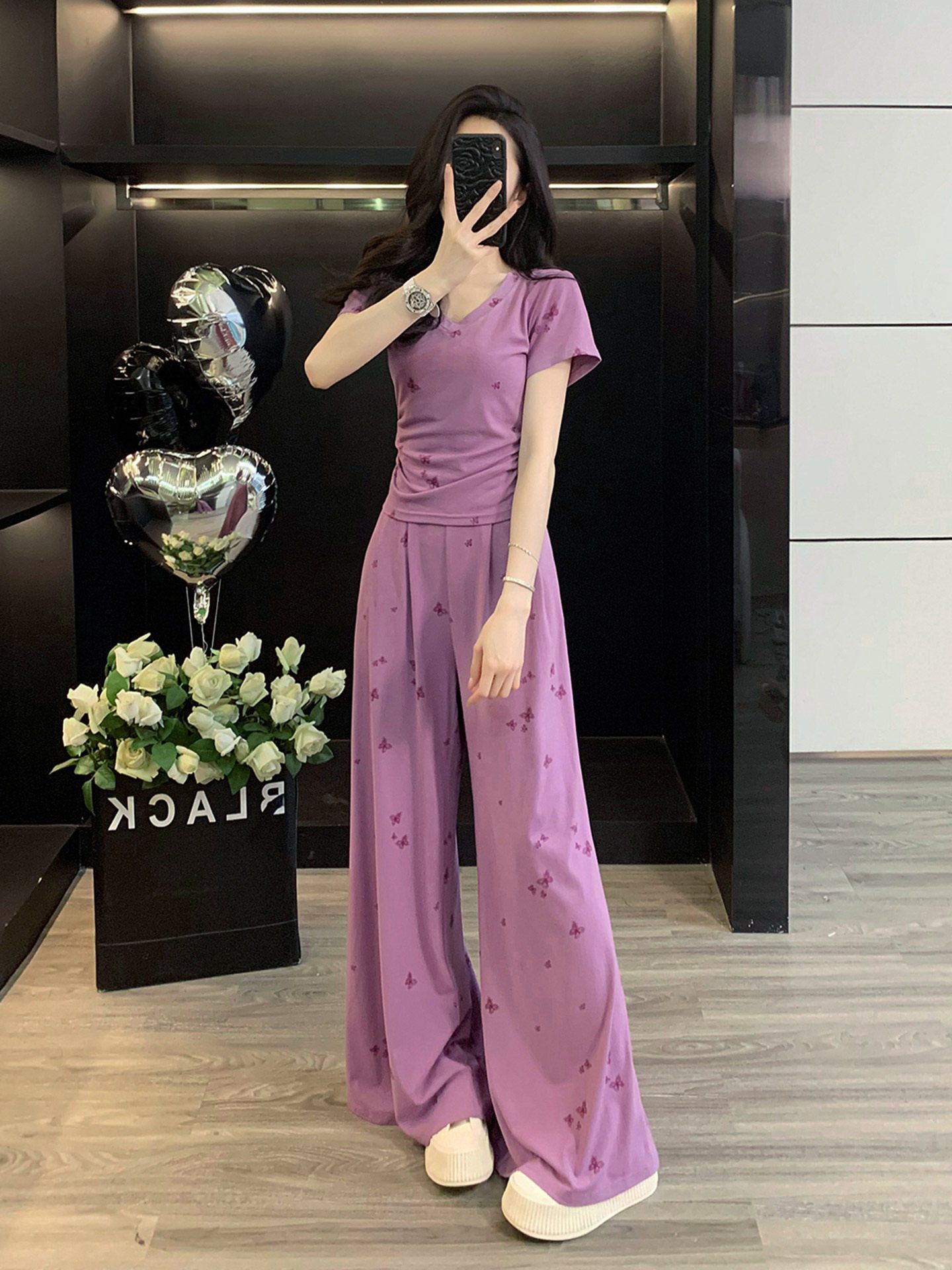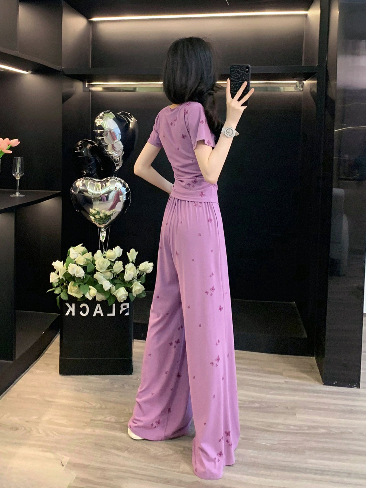 BY16398# 巨好看的夏装套装女显瘦气质修身紫色短袖垂坠感喇叭裤休闲两件套 服裝批發女裝批發服飾貨源