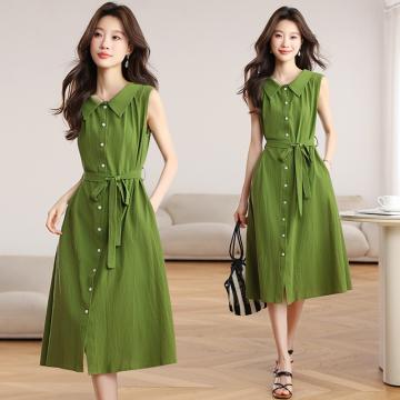 BY16455# 绿色无袖衬衫连衣裙女夏季新款设计感宽松显瘦系带气质长裙子 服裝批發女裝批發服飾貨源