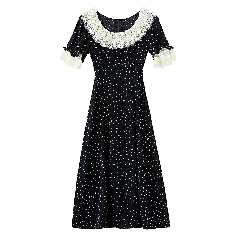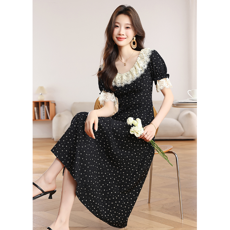 BY16460# 法式荷叶领碎花连衣裙春夏新款女装中长款黑色短袖茶歇裙T 服裝批發女裝批發服飾貨源