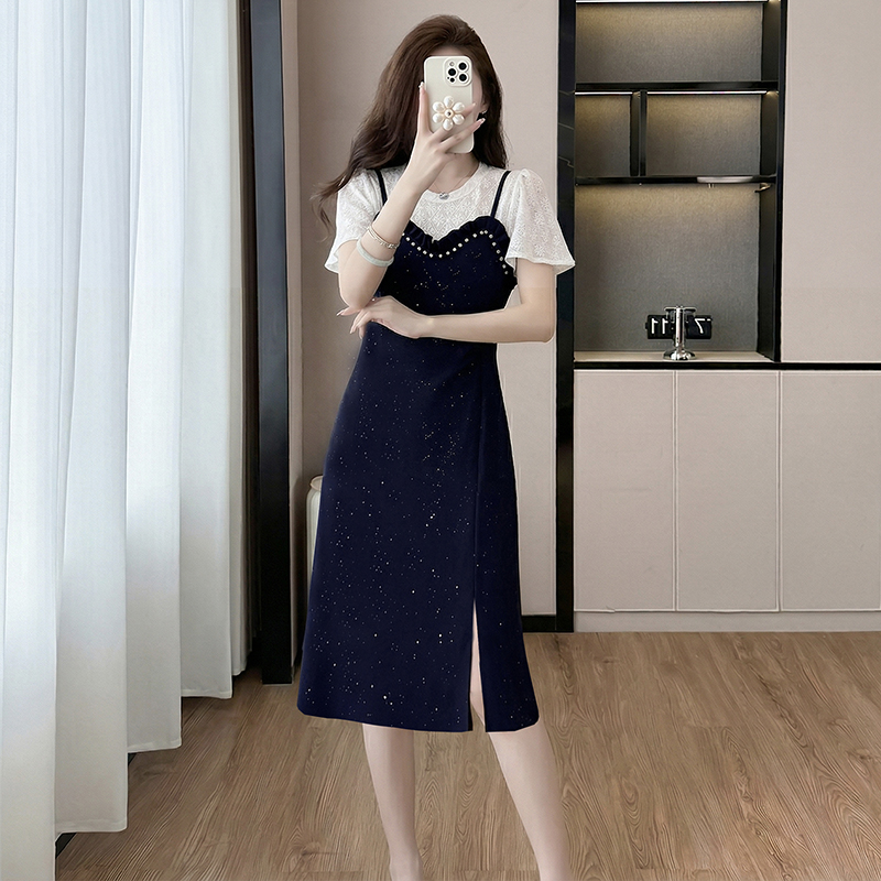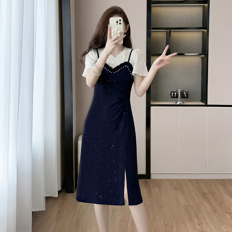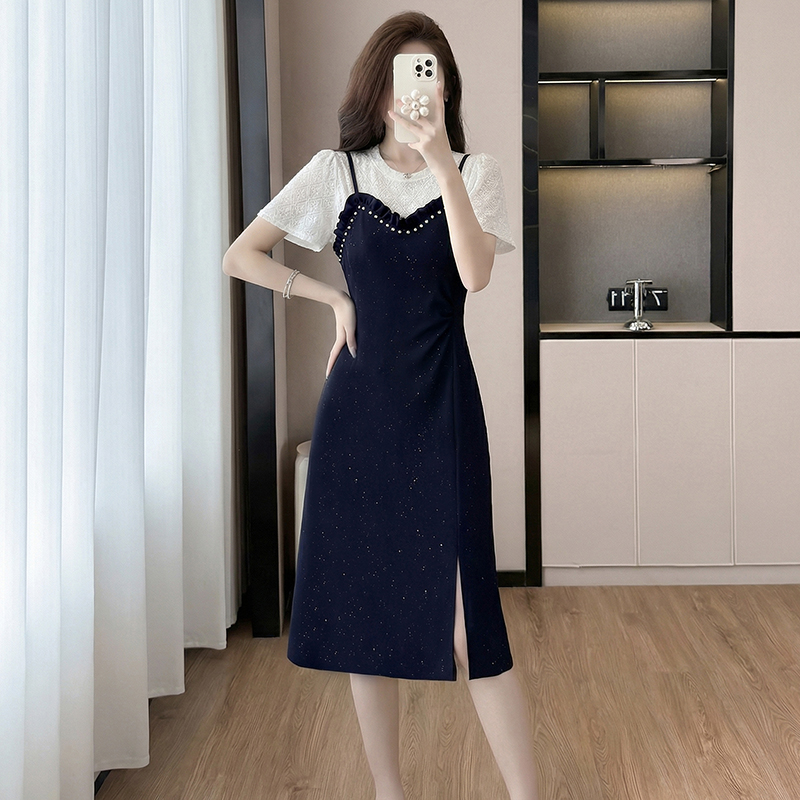 BY16483# 时尚高级设计师夏季新款气质女装拼接重工褶皱显瘦连衣裙 服裝批發女裝批發服飾貨源