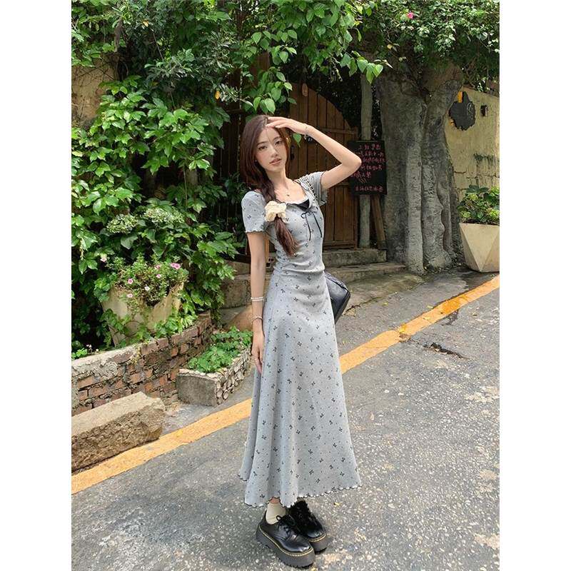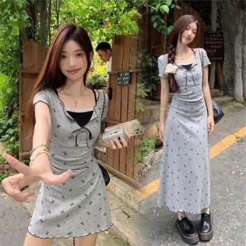 BY16517# 印花包臀裙显瘦女蕾丝纯欲短袖收腰气质A字夏季高级感连衣裙花边 服裝批發女裝批發服飾貨源
