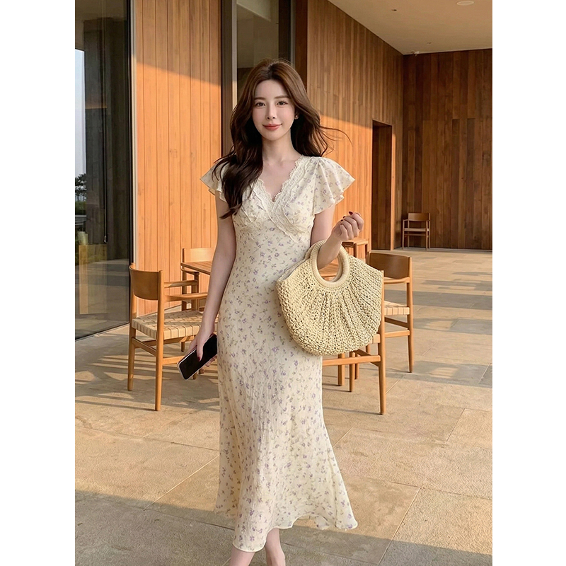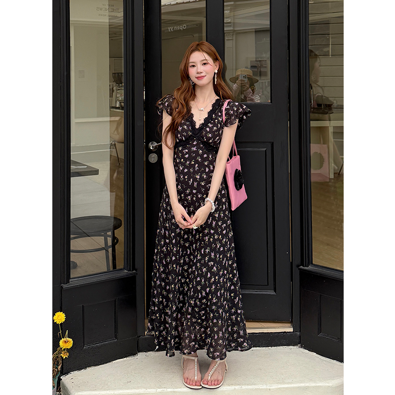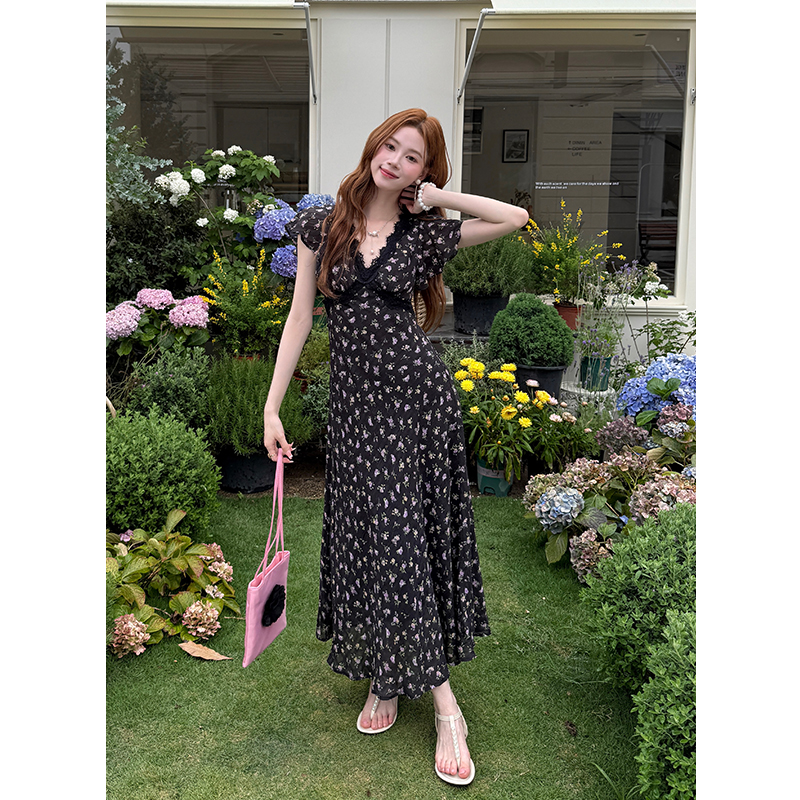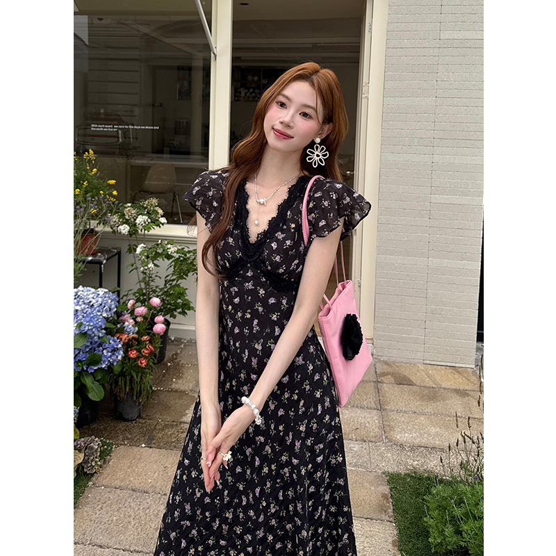 BY16567# 夏季新款法式优雅蕾丝拼接裙子短袖雪纺碎花连衣裙女 服裝批發女裝批發服飾貨源